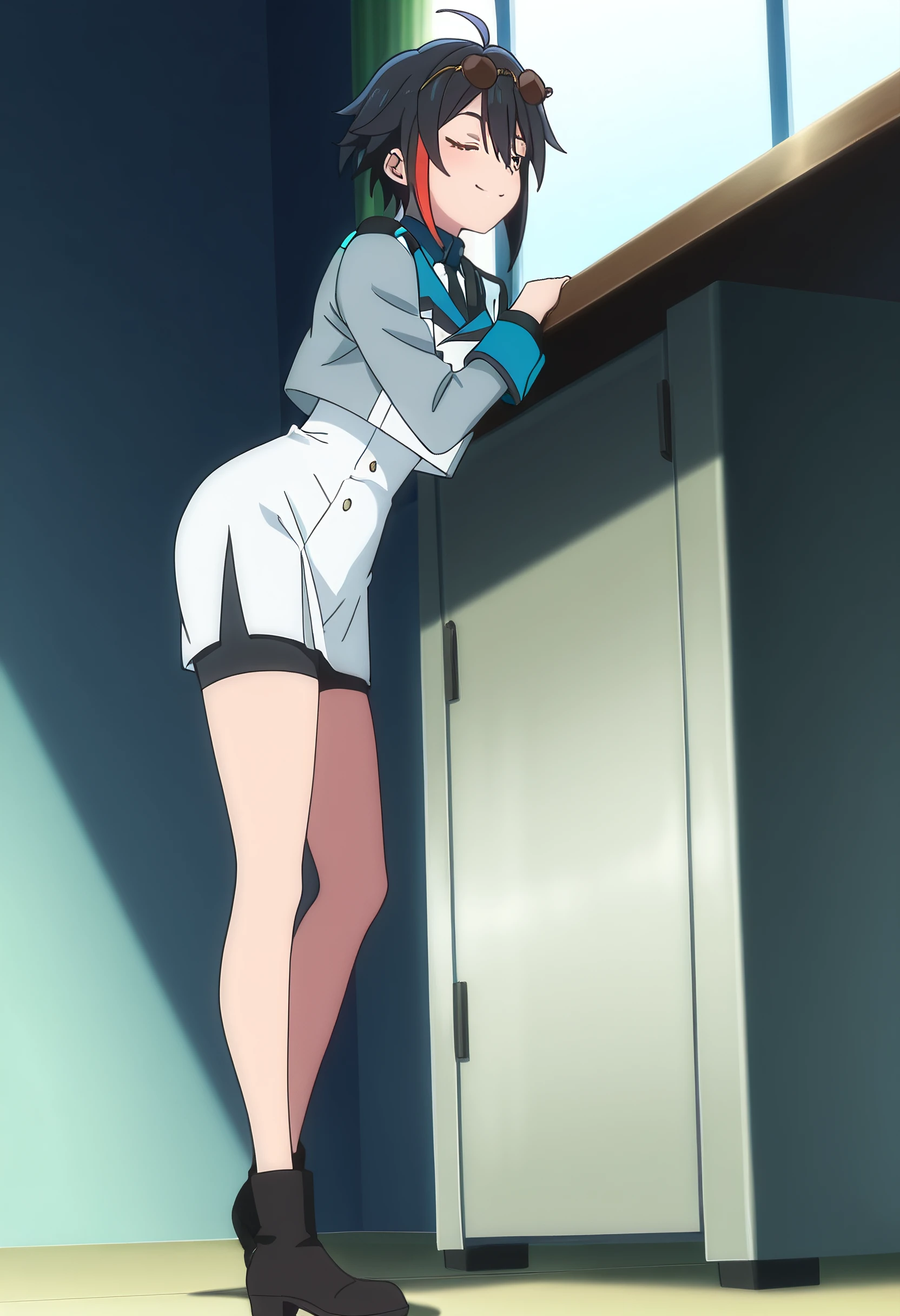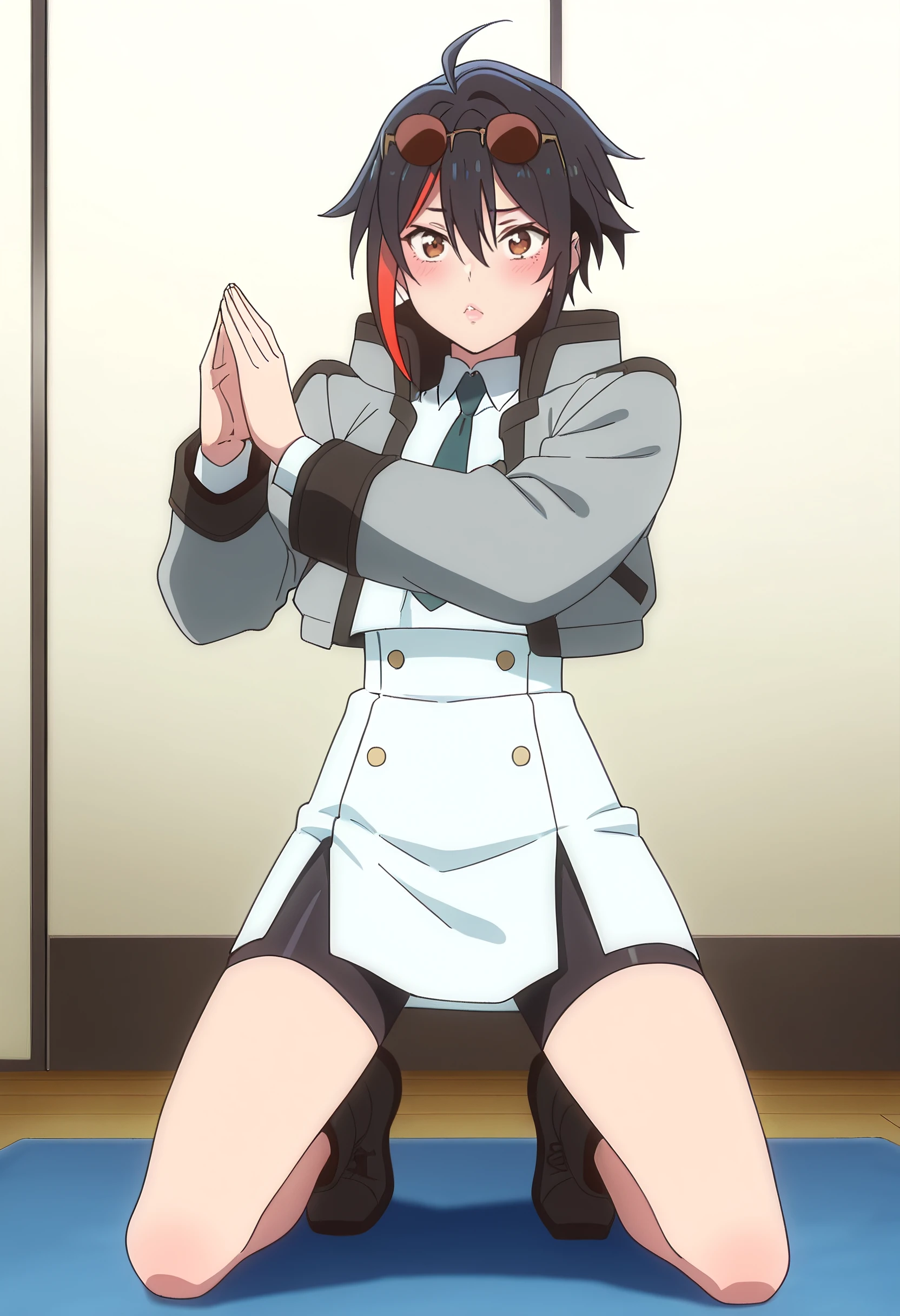 TakahashiUniform, eyewear on head, sunglasses, jacket, necktie, long sleeves, shirt, collared shirt, skirt, white shirt, formal, bike shorts, shorts, grey jacket, white skirt, high collar, bare legs,
