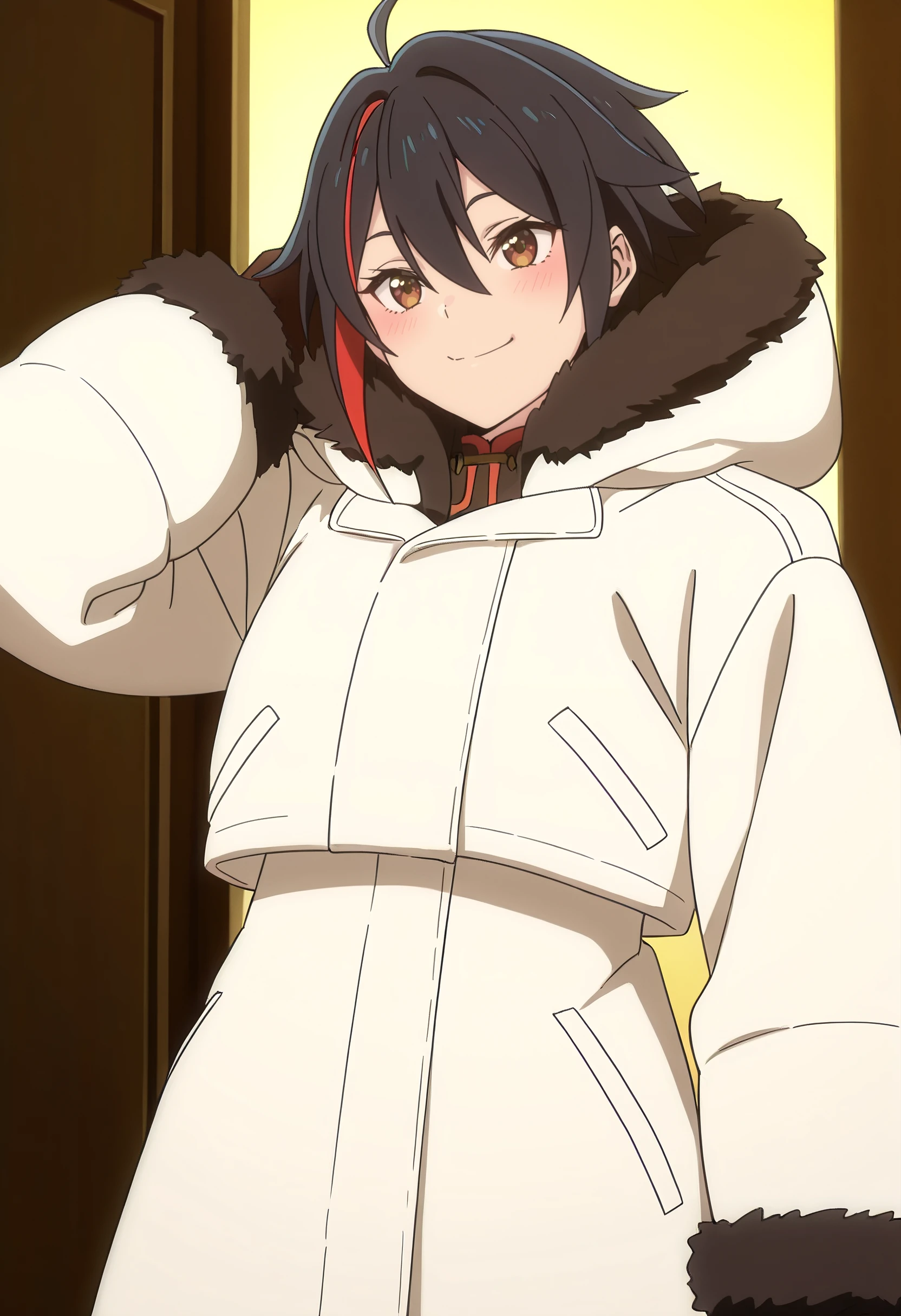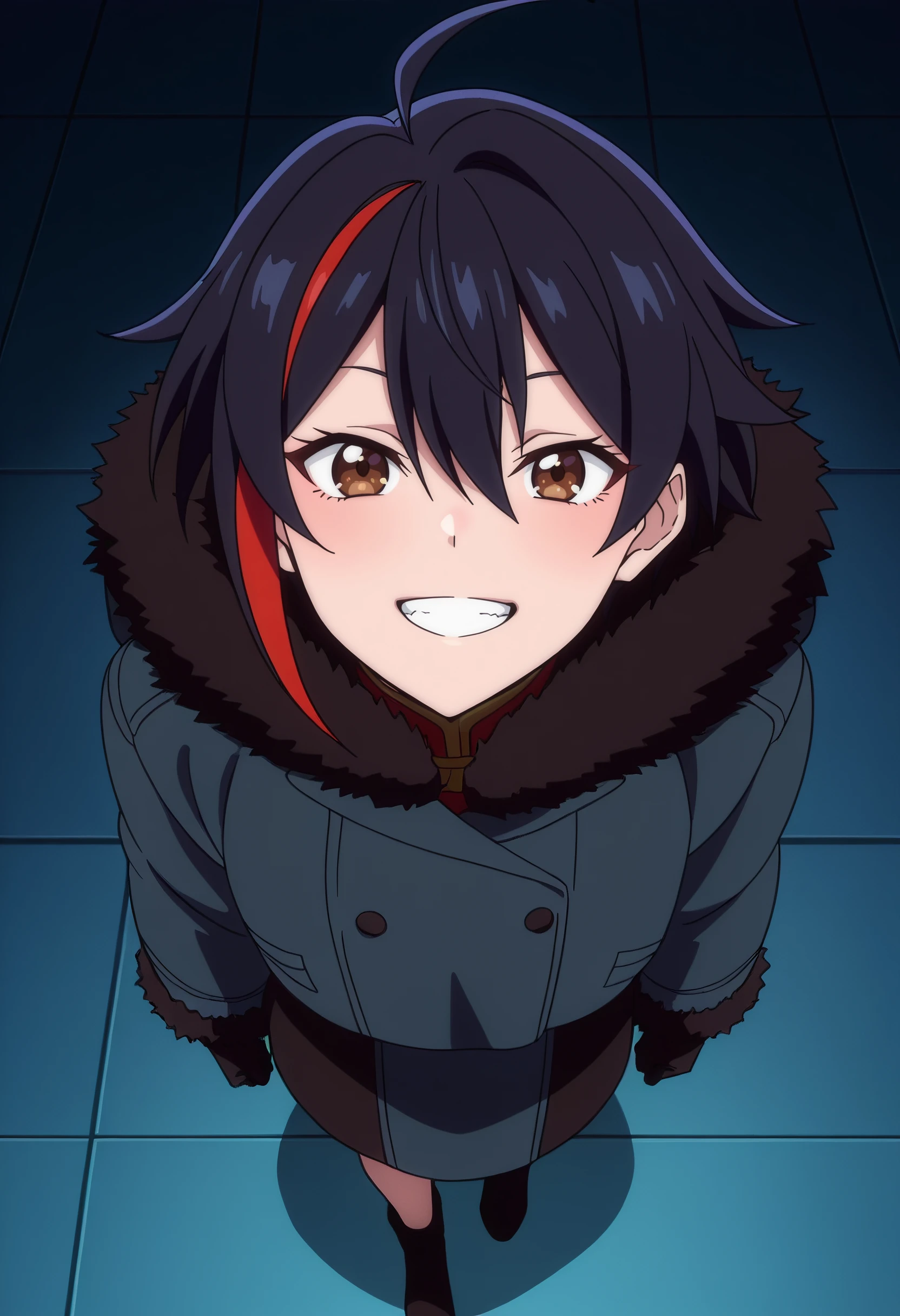 DL2Takahashi, black hair, short hair, ahoge, multicolored hair, brown eyes, red hair, hair between eyes, bangs, streaked hair, colored inner hair,