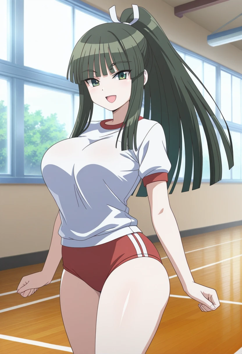 gym uniform, gym shirt, white shirt, untucked shirt, short sleeves, red buruma, socks, sneakers,