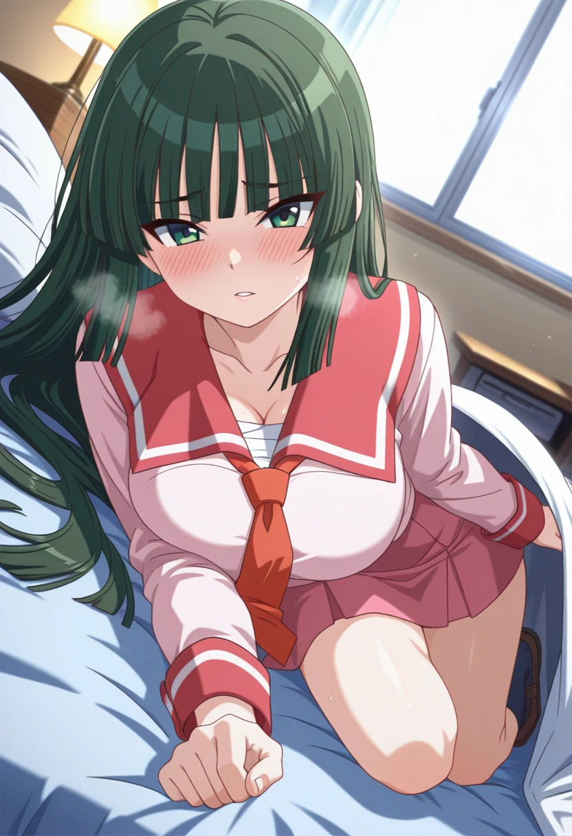school uniform, pink serafuku, red sailor collar, ???????, collarbone, pink shirt, sarashi under shirt, long sleeves, red skirt, kneehighs,