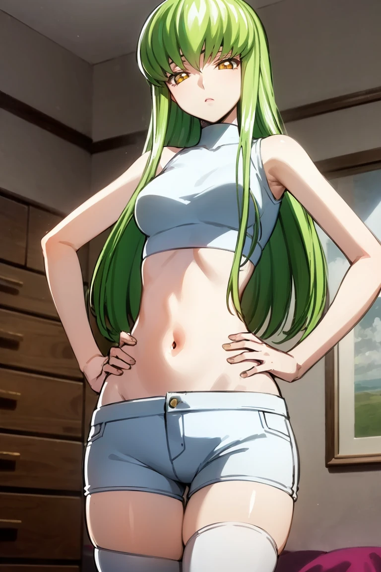 Crop top outfit prompts : bare shoulders, crop top, midriff, navel, sleeveless turtleneck, thighhighs, white shorts