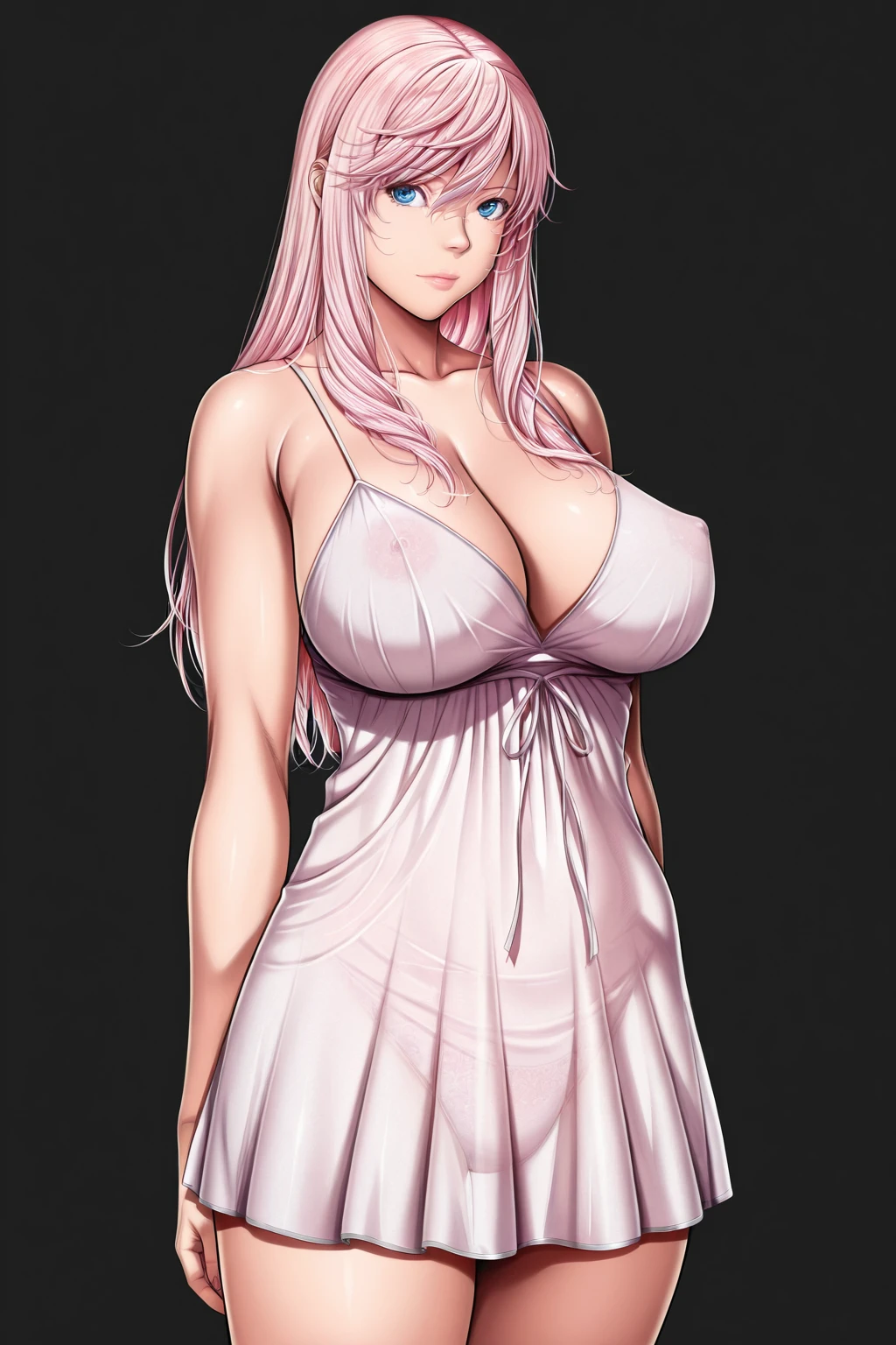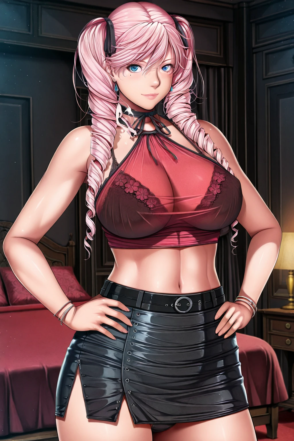 Maria Mamiya, long hair, blue eyes, large breasts, navel, bare shoulders, twintails, pink hair, hair ribbon, earrings, choker, belt, black skirt, miniskirt, bracelet, crop top, see-through, mole under eye, black panties, makeup, halterneck, drill hair, black bra, twin drills, side slit, pencil skirt, panty peek