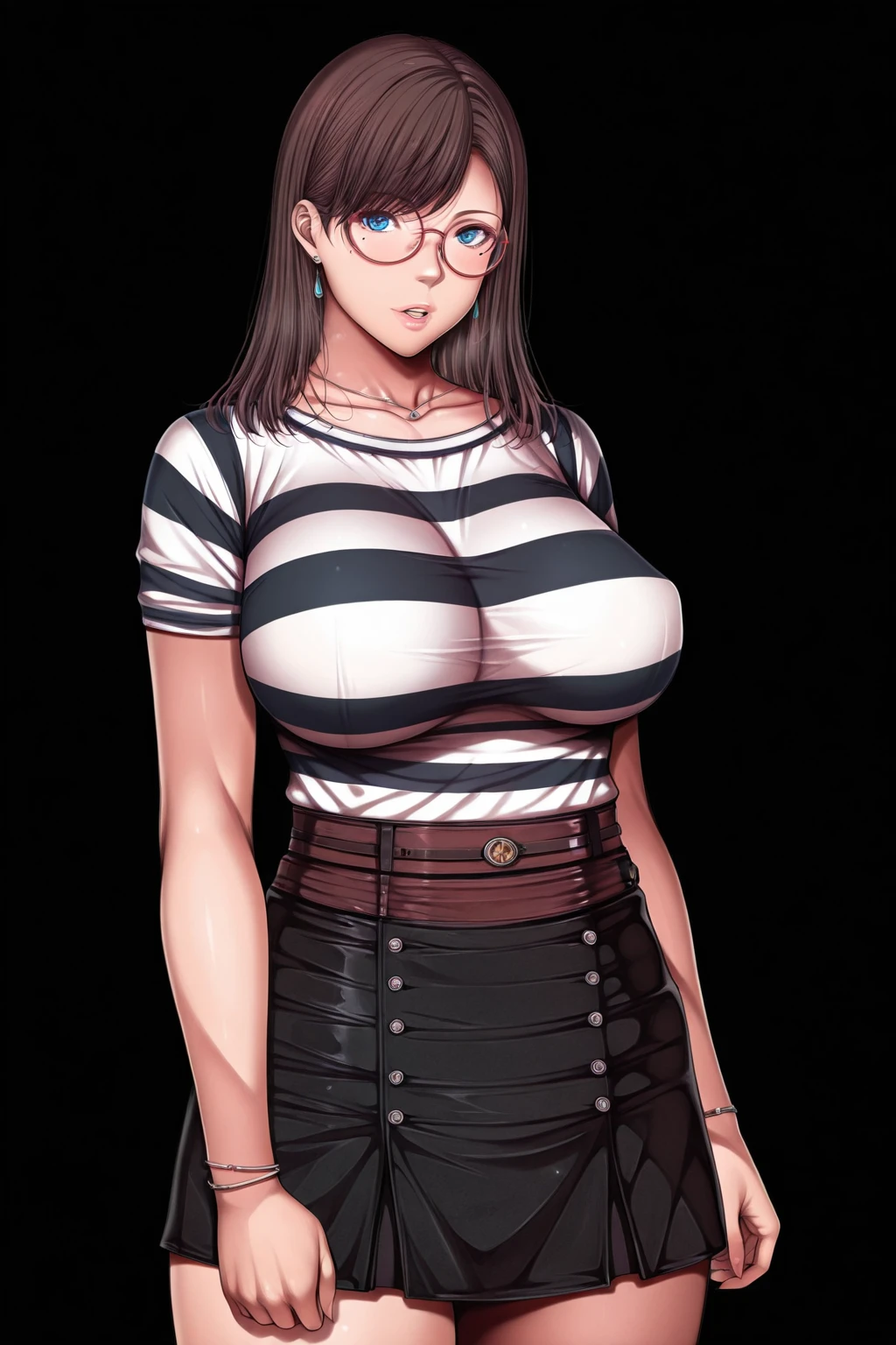 Yukino Komori, long hair, blue eyes, large breasts, brown hair, white shirt, short sleeves, earrings, glasses, black skirt, miniskirt, necklace, striped clothes, bracelet, parted bangs, mole under eye, buttons, swept bangs, high-waist skirt, round eyewear, red-framed eyewear, asymmetrical bangs, striped shirt, shirt tucked in, brown belt, hair behind ear