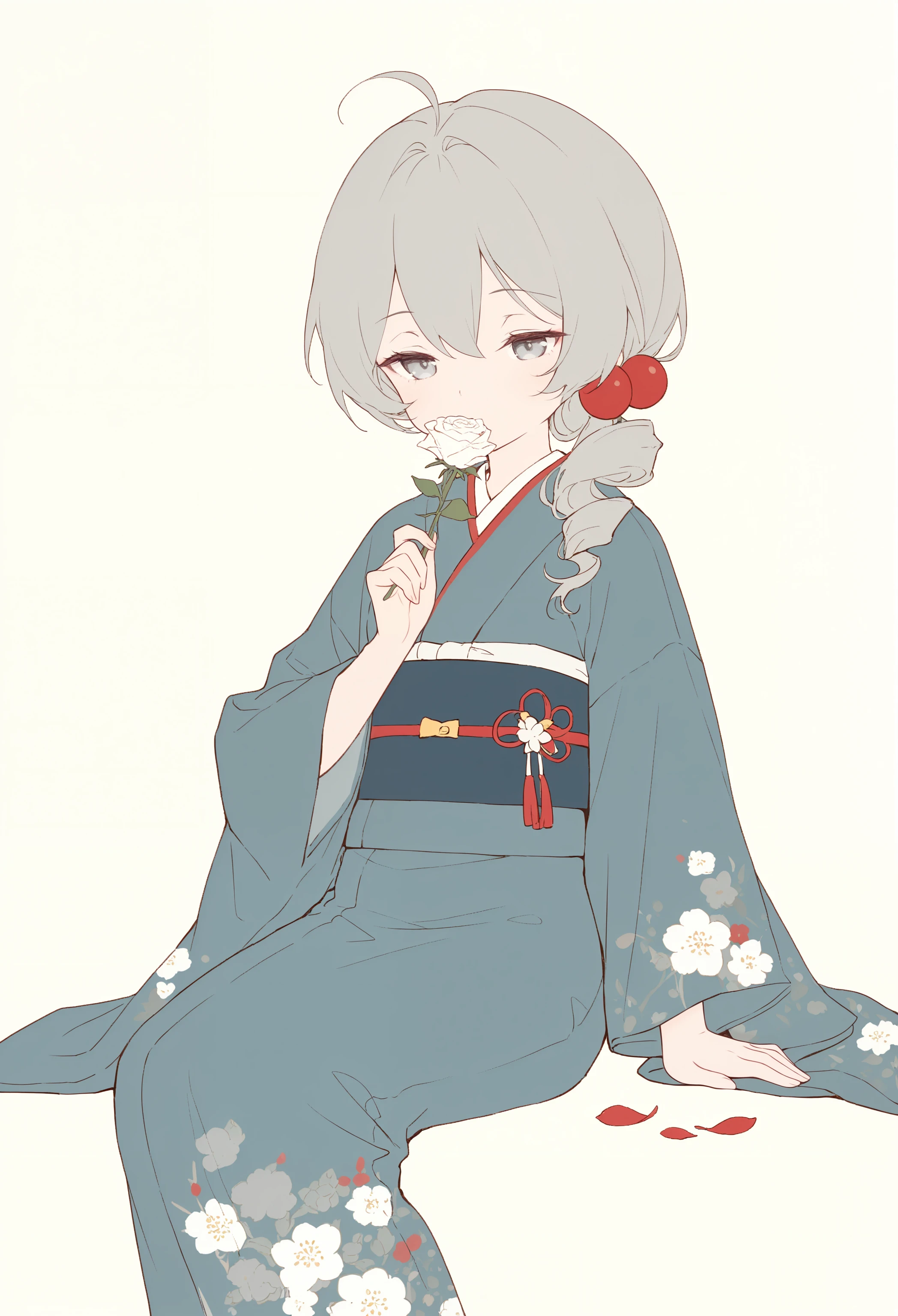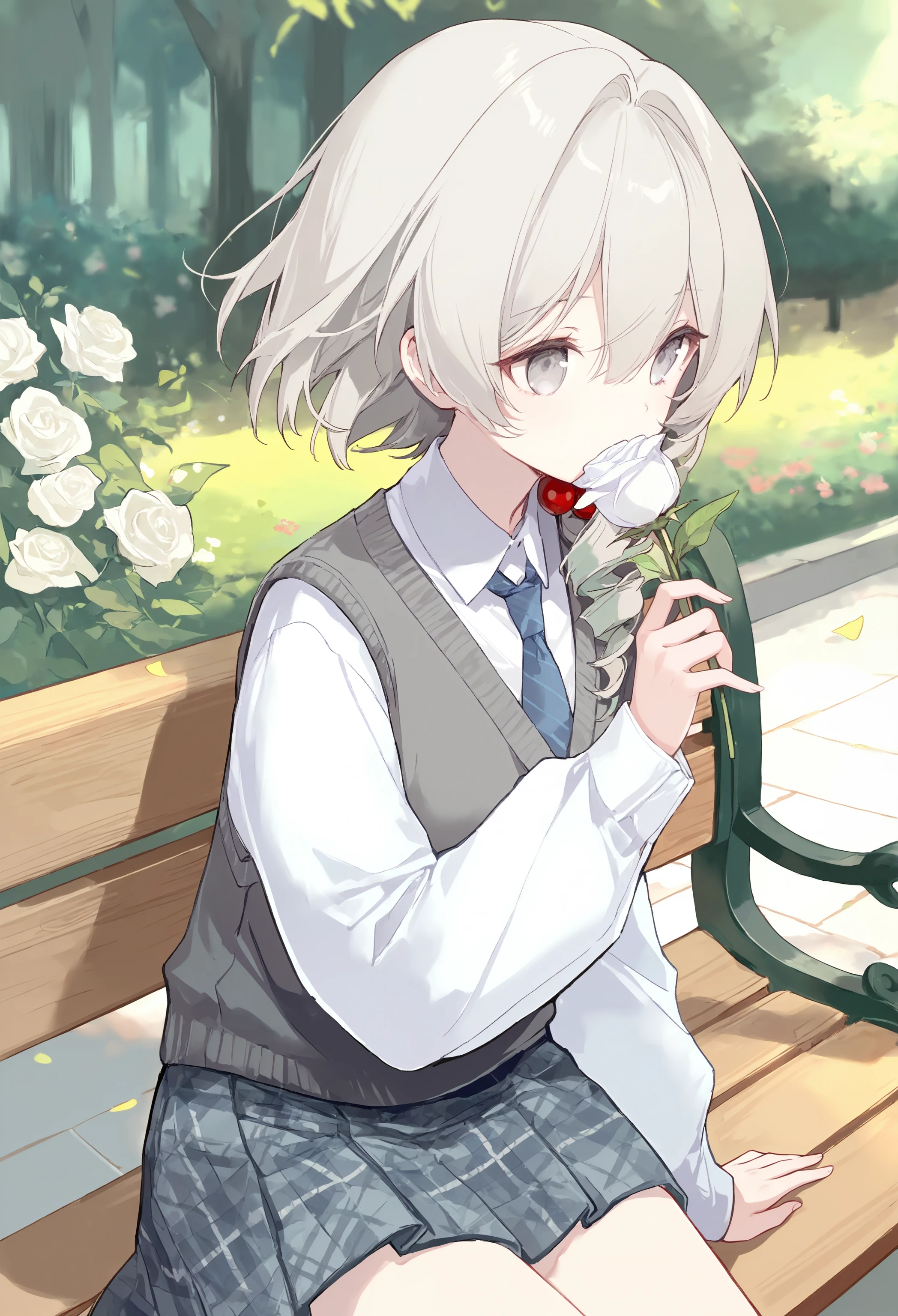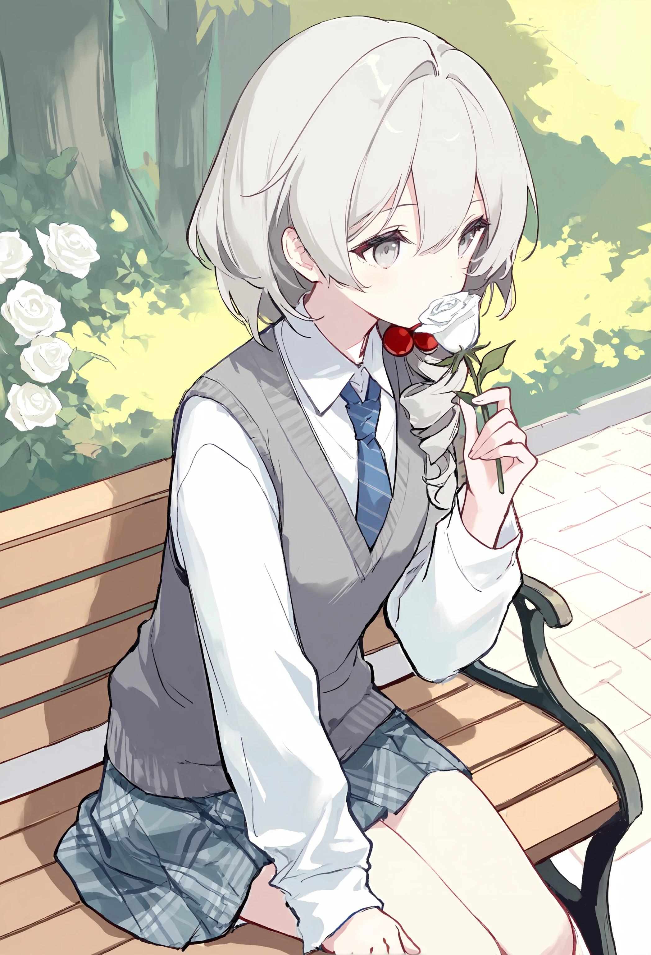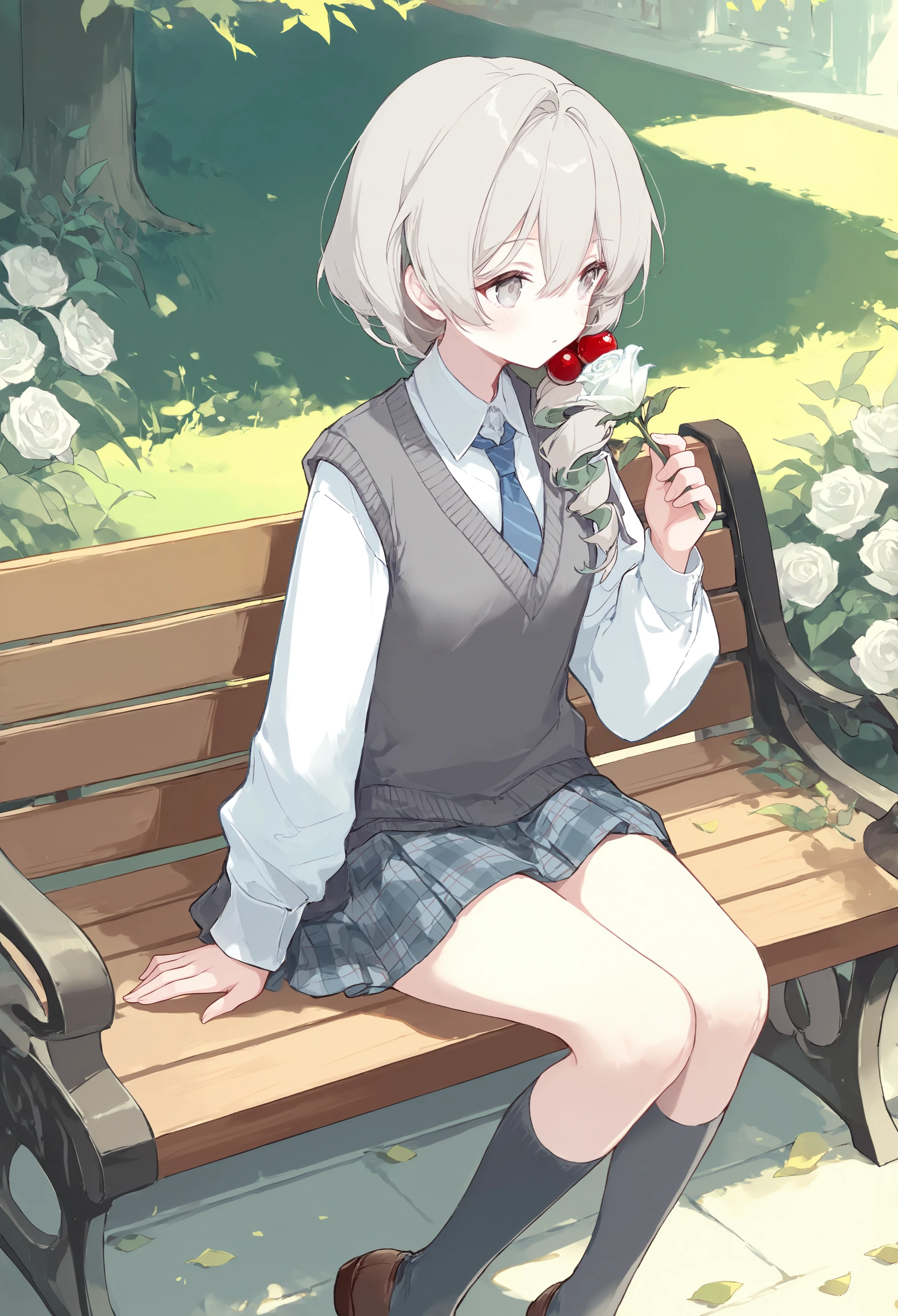 hair ornament, shirt, white shirt, collared shirt, necktie, sweater vest, blue necktie, long sleeves, hair bobbles, plaid skirt, kneehighs, loafers