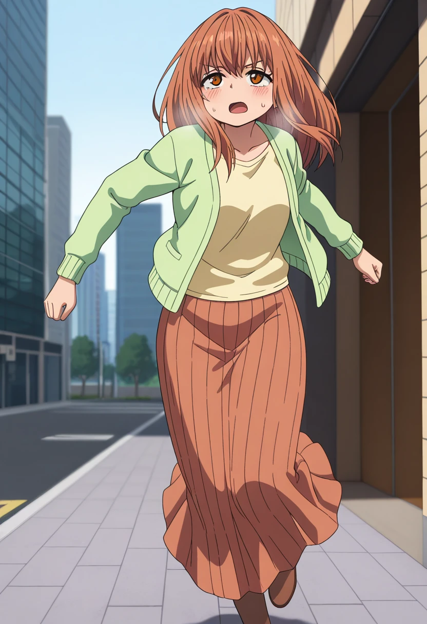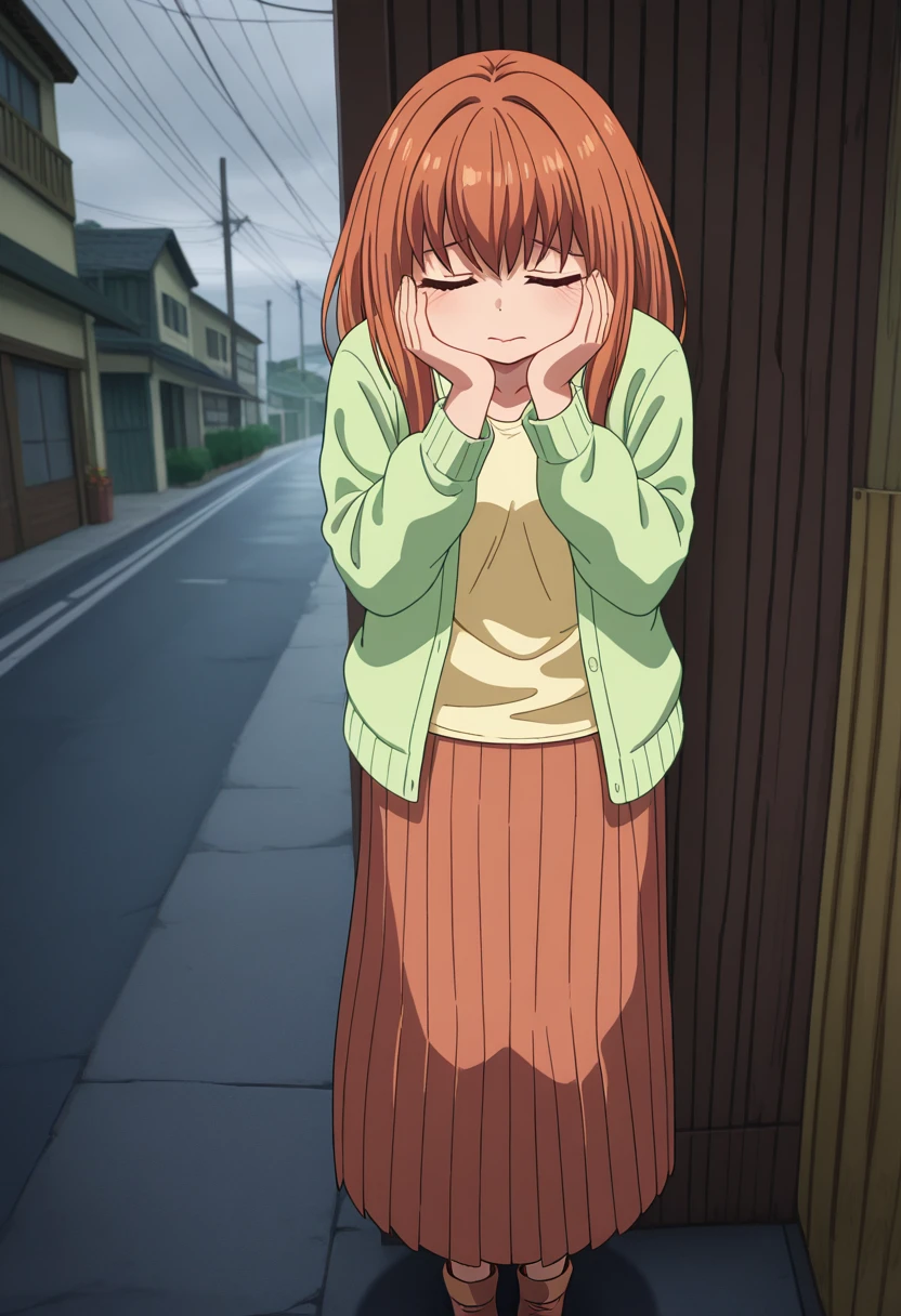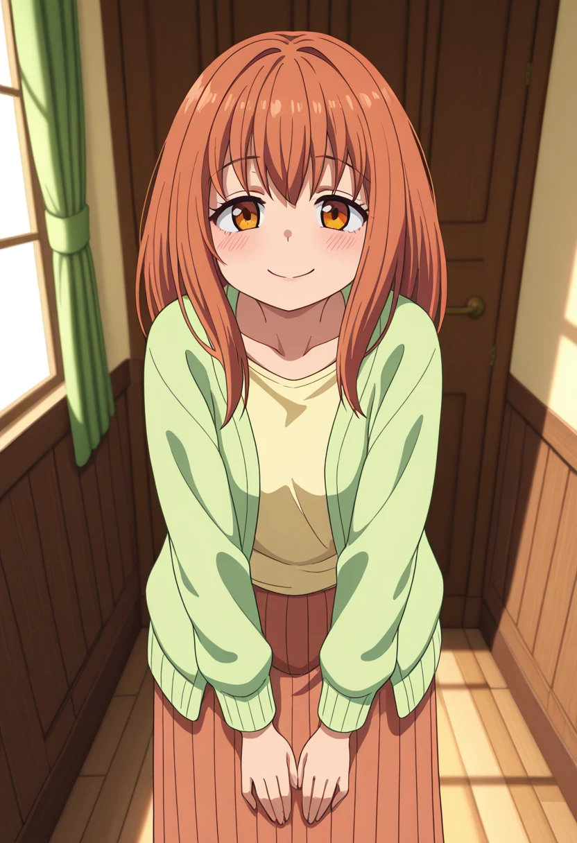 light green cardigan, yellow shirt, long sleeves, brown long skirt, brown footwear,