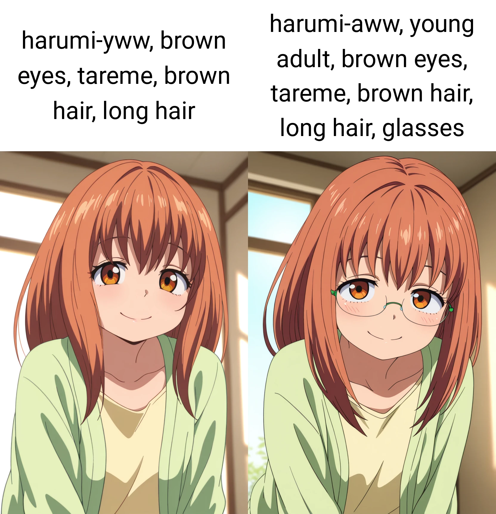 harumi-aww, young adult, brown eyes, tareme, brown hair, long hair, glasses,