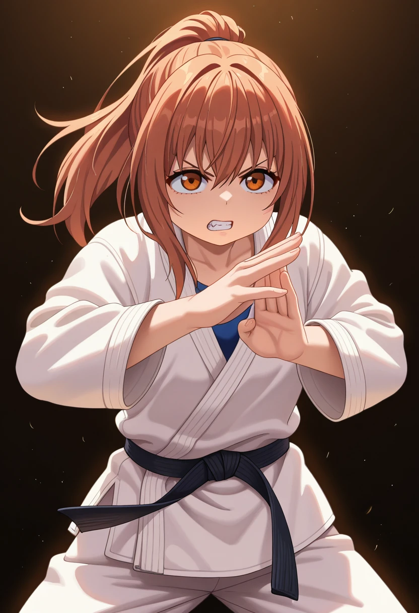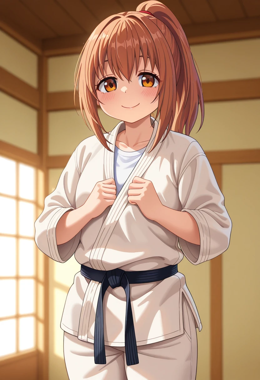 Example: ponytail, karate gi, dougi, white shirt, pants,