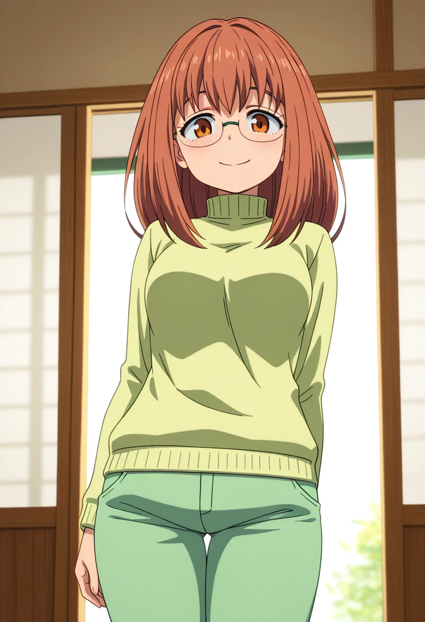 light green sweater, turtleneck, long sleeves, green pants, sandals,