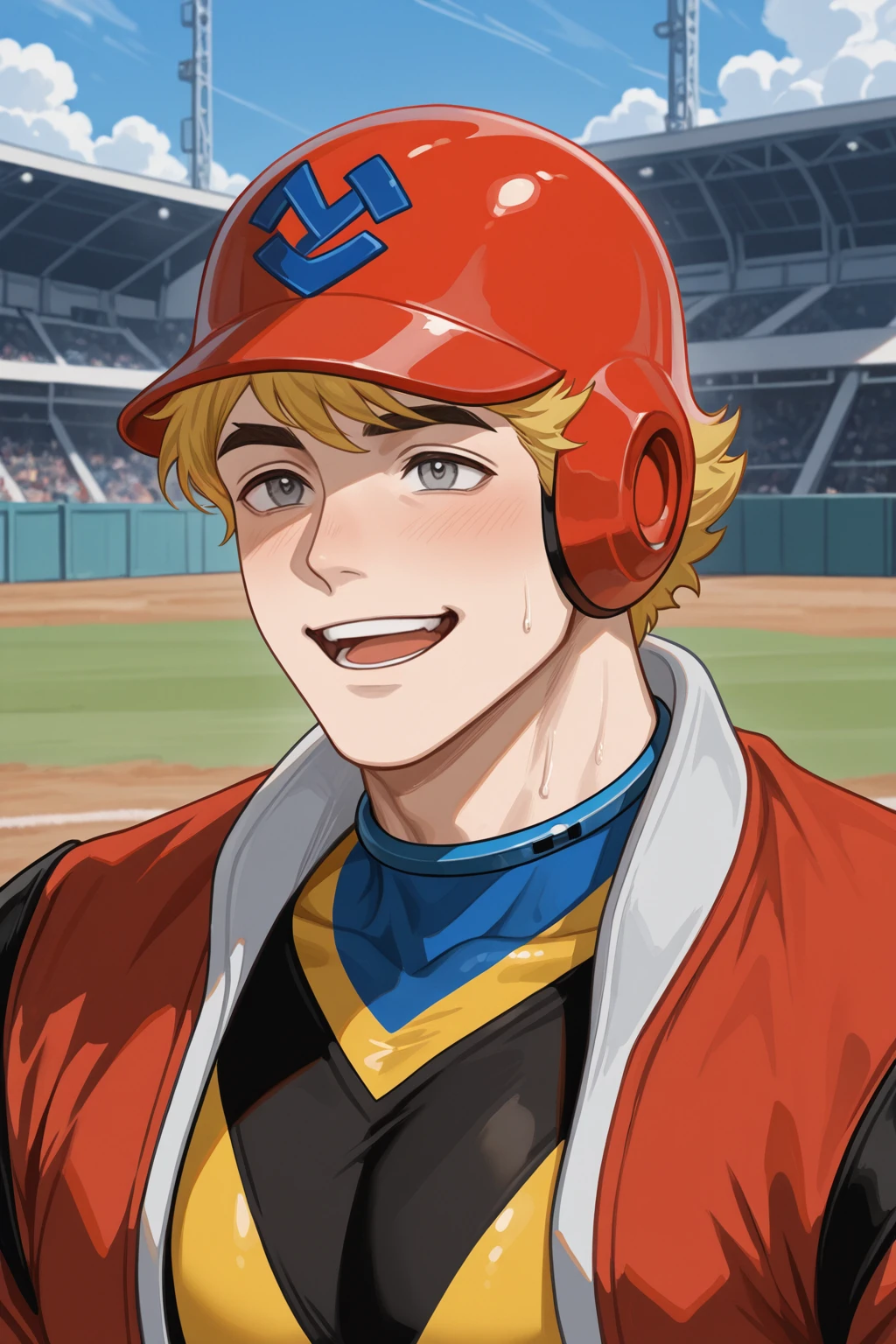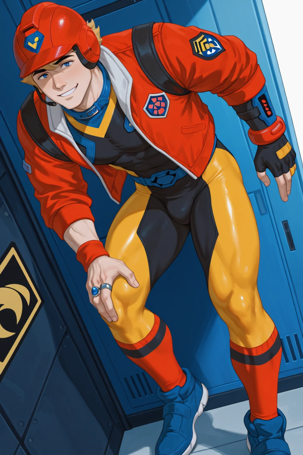 red baseball helmet, blue collar, yellow and black bodysuit, two-tone bodysuit, red jacket, single glove, fingerless glove, blue fingerless glove, single bracer, red and blue bracer, blue belt, red socks, blue shoes, emblem on helmet, emblem on jacket, bionic 6 emblem, ring,