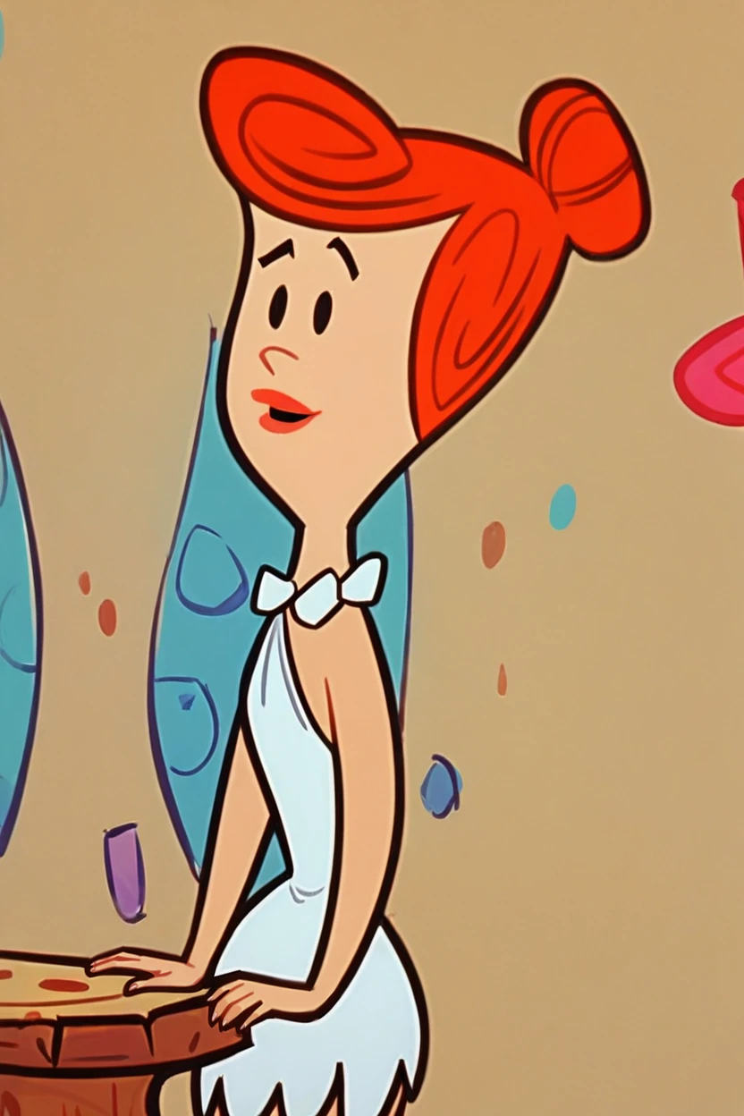Wilma Flintstone, red hair, single hair bun, white dress}