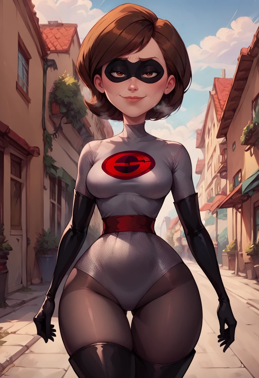 r3d3lastig1rl, solo, 1girl, brown hair, grey bodysuit,superhero, domino mask, elbow gloves, thigh boots,black pantyhose