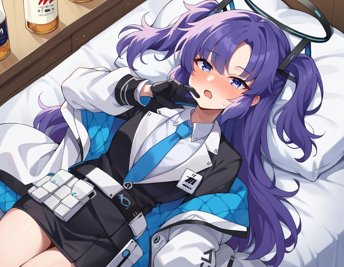 belt, black gloves, black suit, black skirt, blue necktie, gloves, halo, jacket, necktie, off shoulder, skirt, two-sided fabric, two-sided jacket, white belt, white jacket,