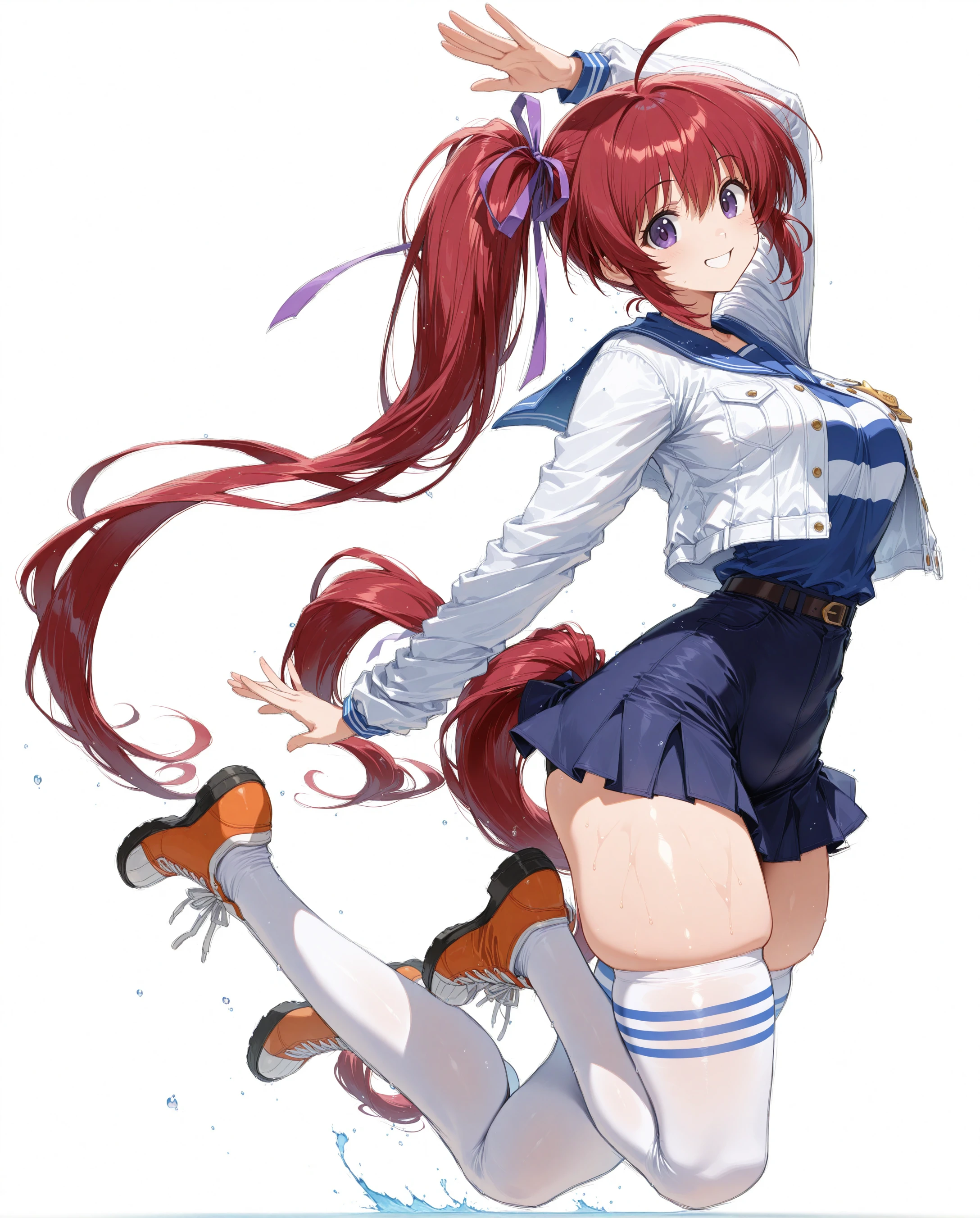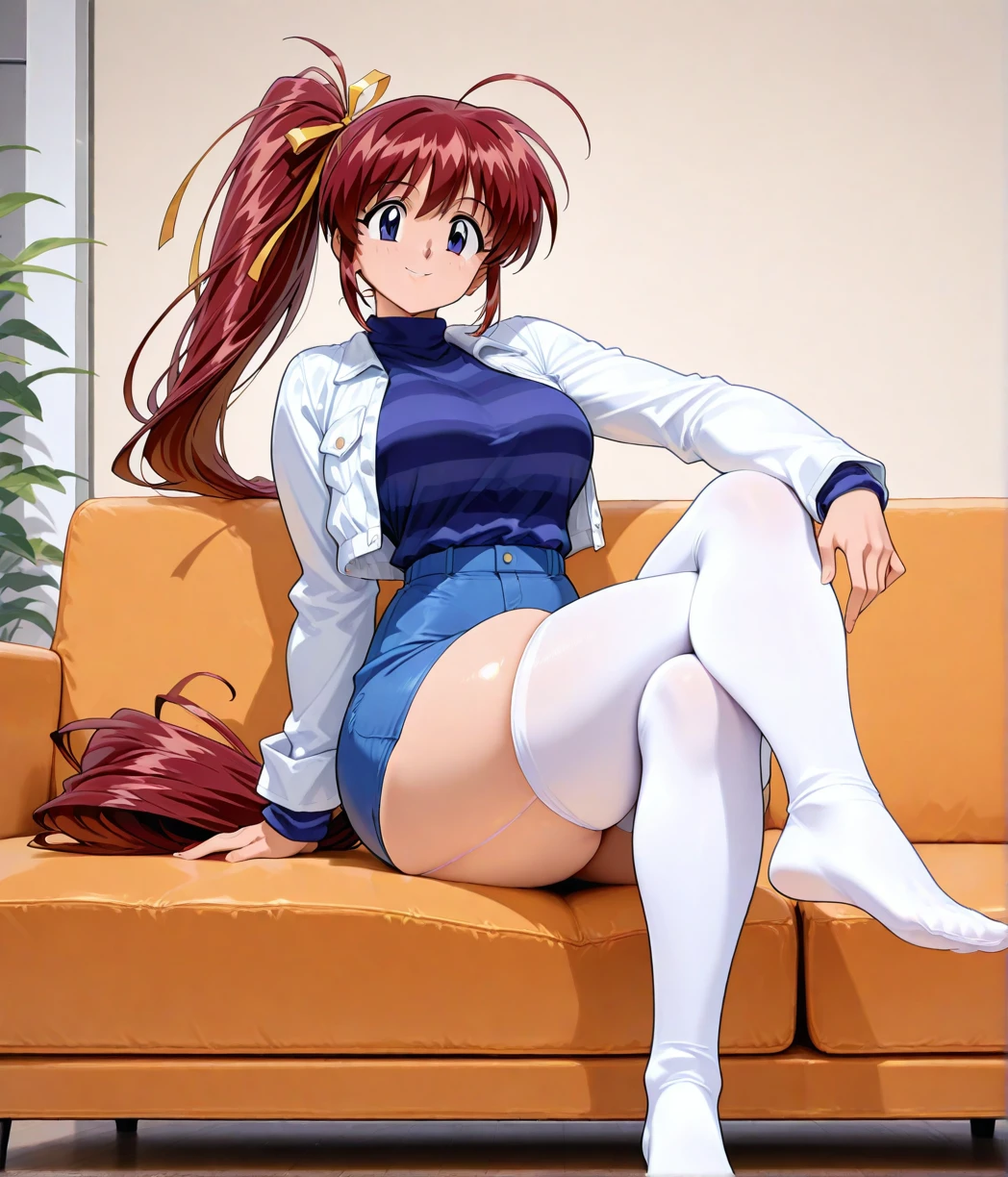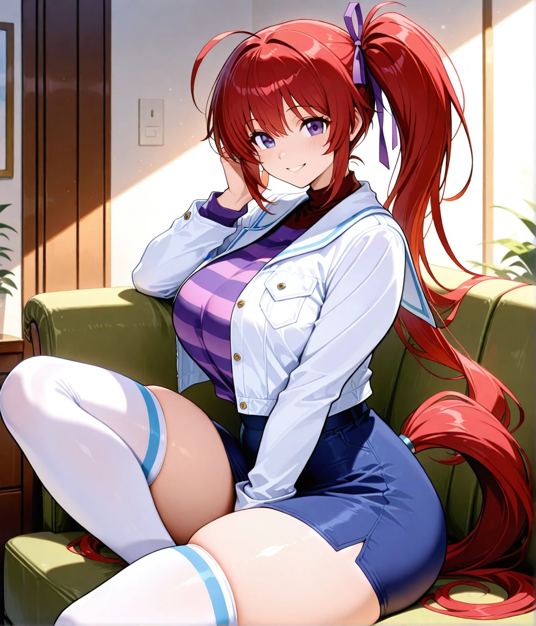 mizuki takase,mizuki_takase,comic_party,large_beautiful_eyes,white jacket, striped Tshrit,white high socks,red_hair, hair_ribbon,one_side_ponytail,purple_eye, large breast,19 year old girl,white_high_ socks,zettai ryouiki, (thighhighs, skindentation:0.4),ahoge,one ponytail,thick thighs,blue_skirt,short skirt,very long hair, long sleeve,