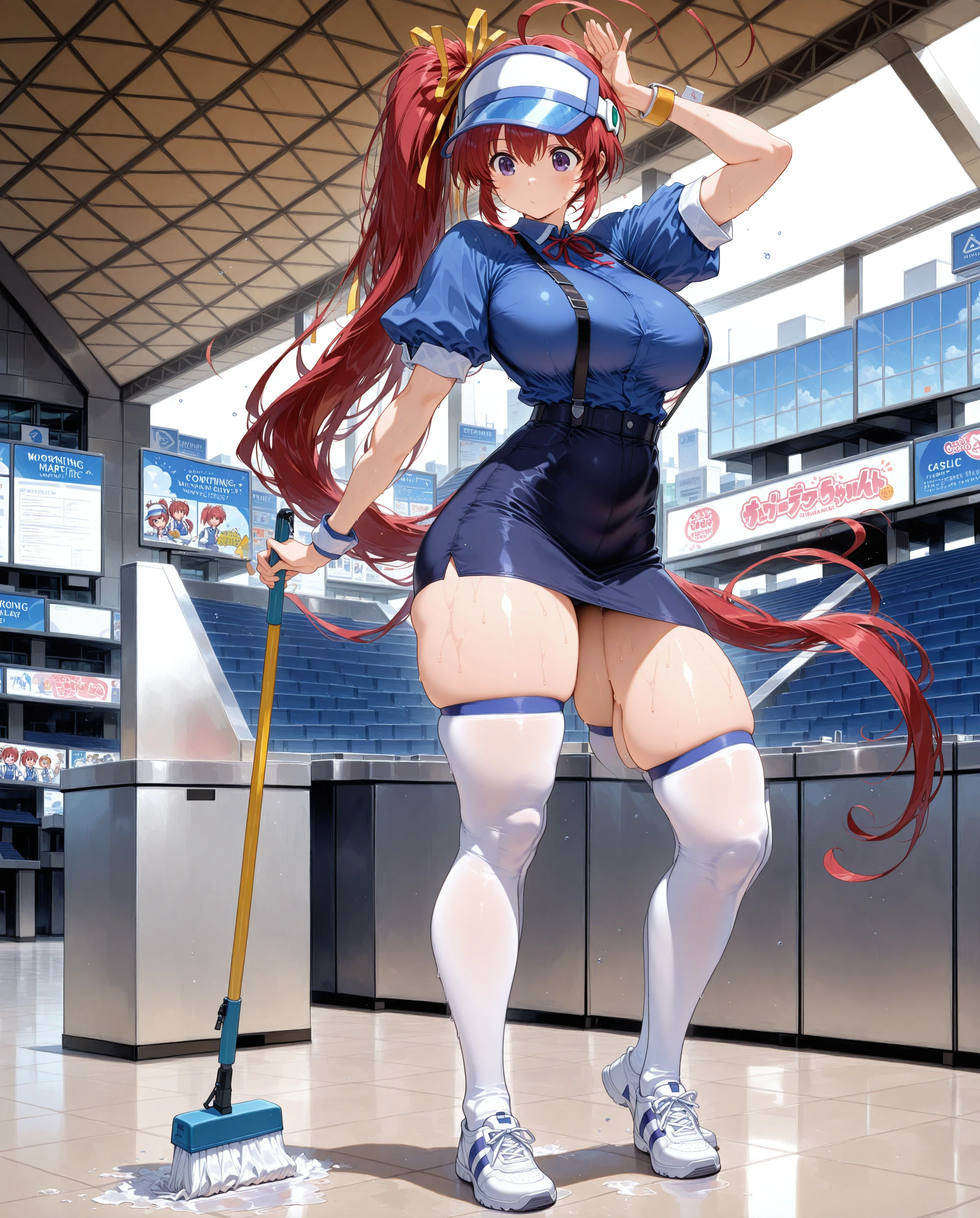 mizuki takase,mizuki_takase,comic_party,comic_party_uniform,suspenders,skirt,visor_cap,hat,head wear,long sleevespuffy sleeves, ,red_hair, hair_ribbon,one_side_ponytail,purple_eye, large breast,19 year old girl,socks,ahoge,one ponytail,large_beautiful_eyes,l,shoes,blue_pencil_skirt,sideboob, short skirt,very long hair,
