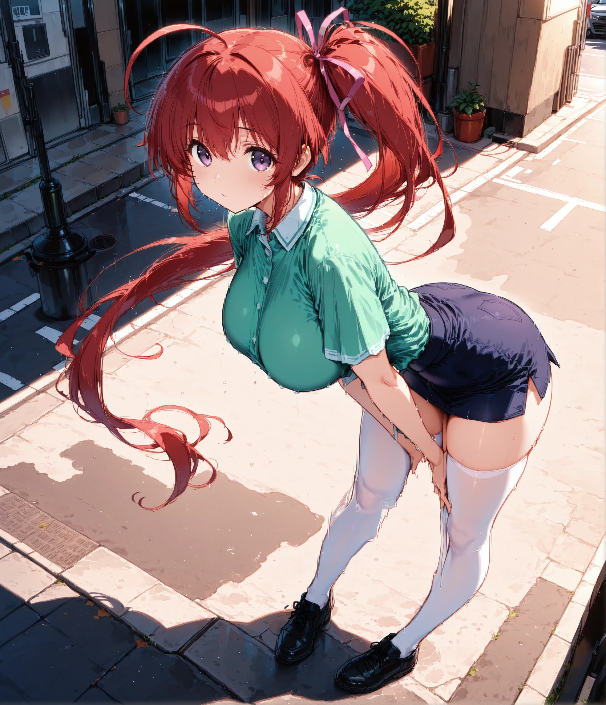 mizuki takase,mizuki_takase,comic_party,green_shirt,collared shirt,short sleeve,skirt,red_hair, hair_ribbon,one_sideponytail,purple_eye, large breast,19 year old girl,white_high_socks,zettai ryouiki,skirt, thighhighs,ahoge,one ponytail,(thick thighs:0.4),shoes,short skirt, very long hair,short sleeve,