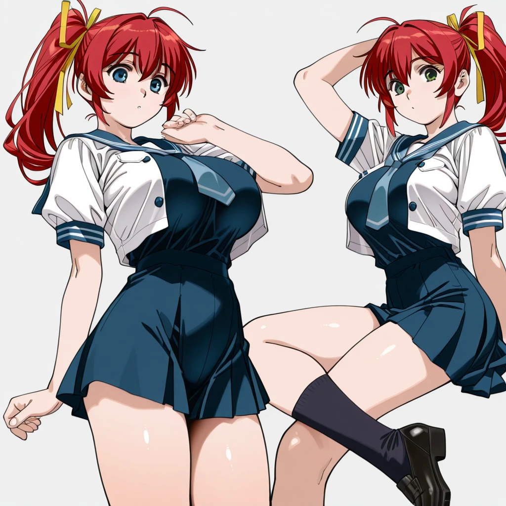 mizuki_takase,mizuki_takase,comic_party,,large_beautiful_eyes,red_hair, hair_ribbon,one_side_ponytail,purple_eye, large breast,19 year old girl, high socks,zettai ryouiki, thighhighs, (skindentation:0.4),ahoge,one ponytail,thick thighs,sideboob, very long hair, short skirt,