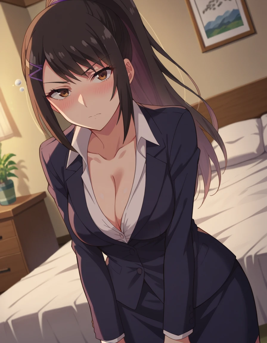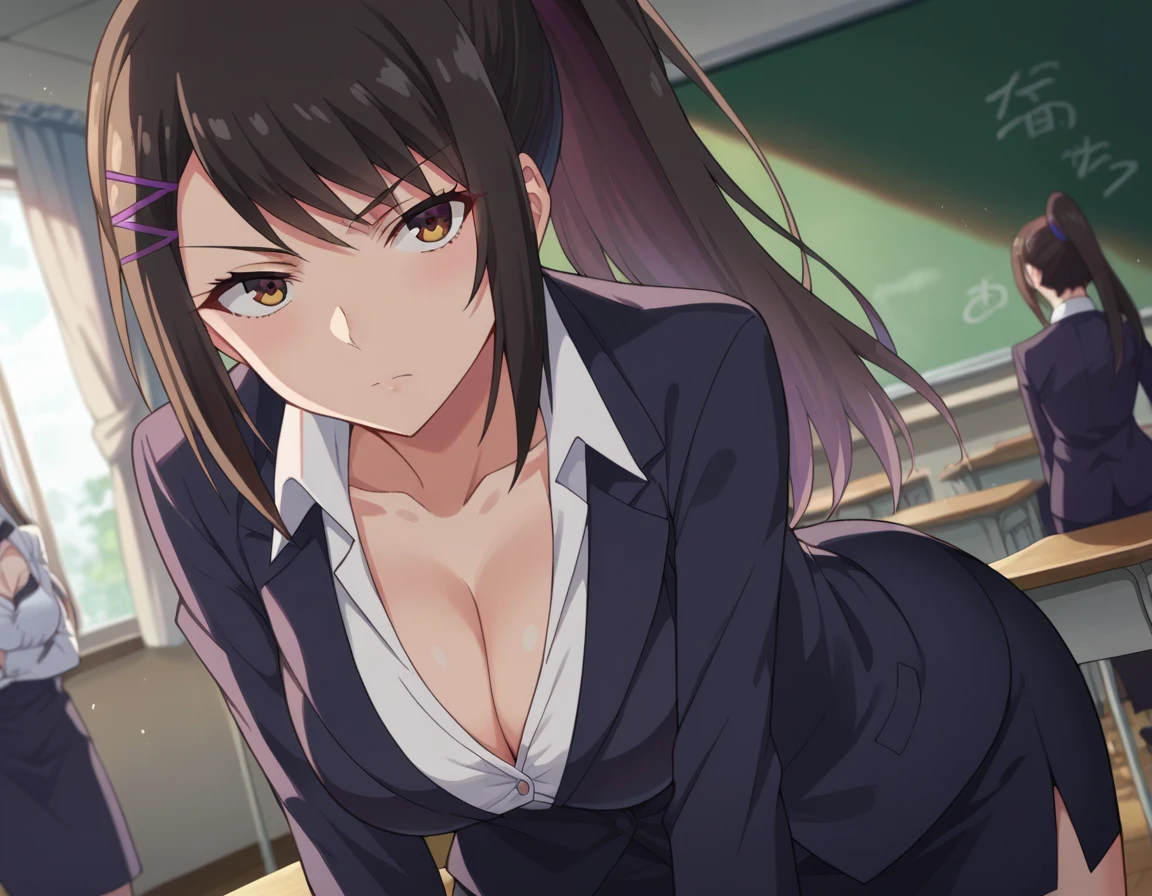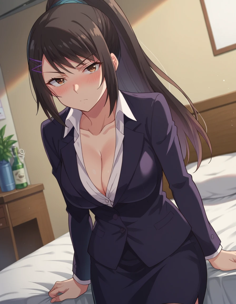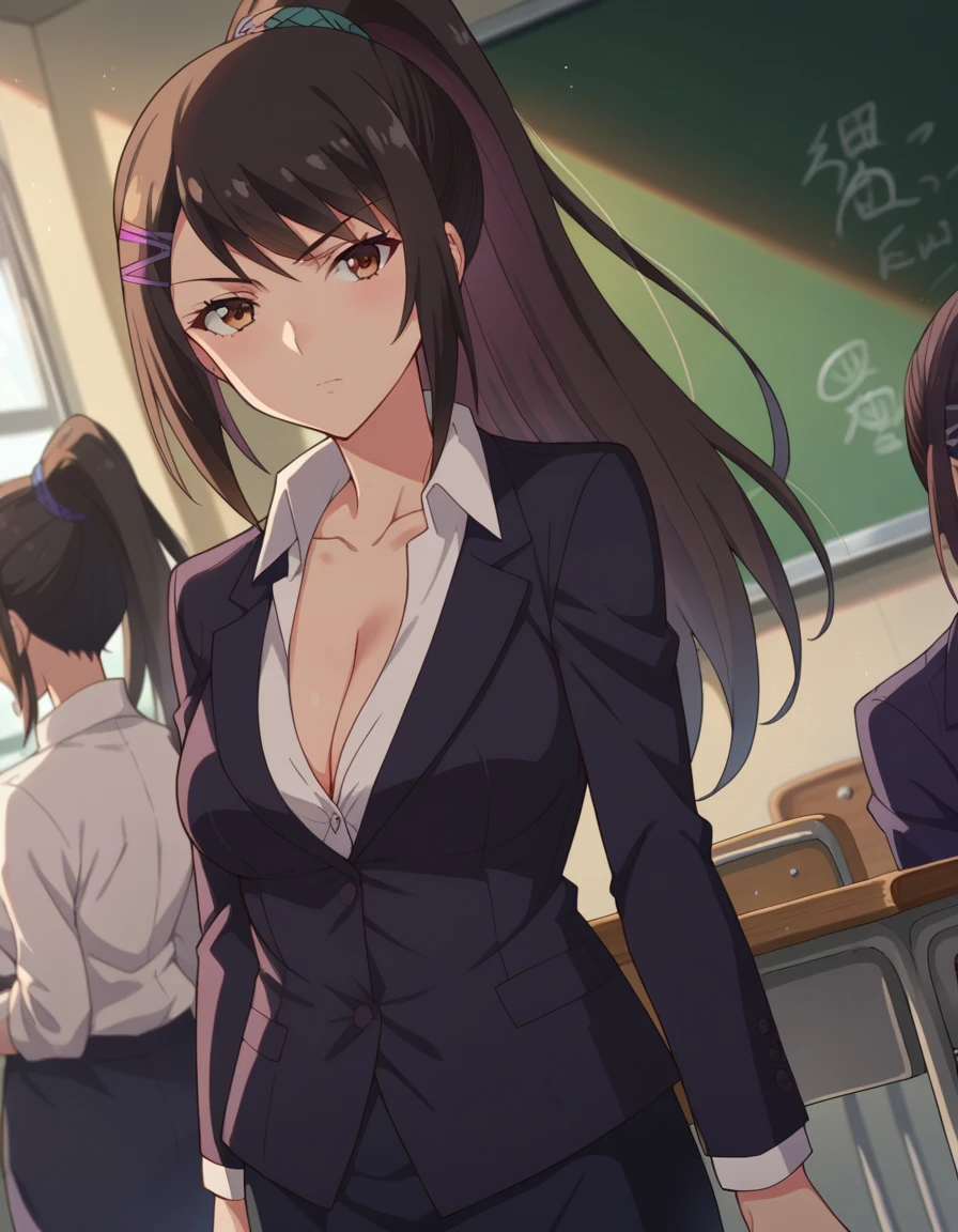 sae chabashira, long hair, black hair, hair ornament, brown eyes, ponytail, hairclip,