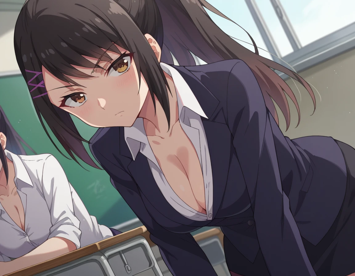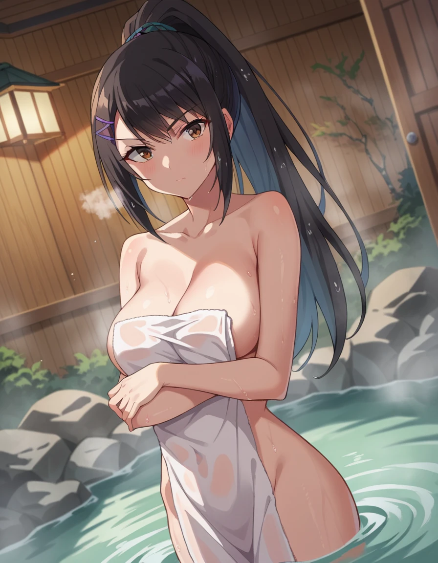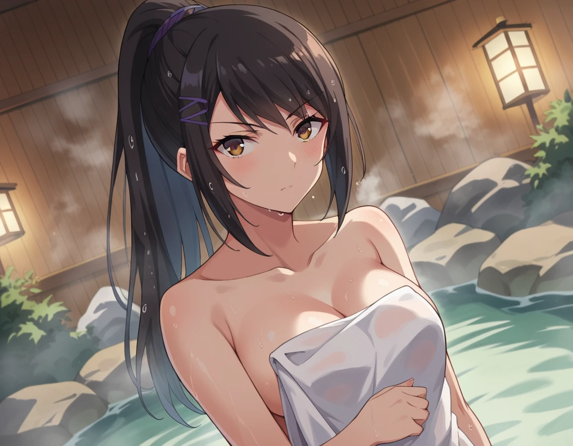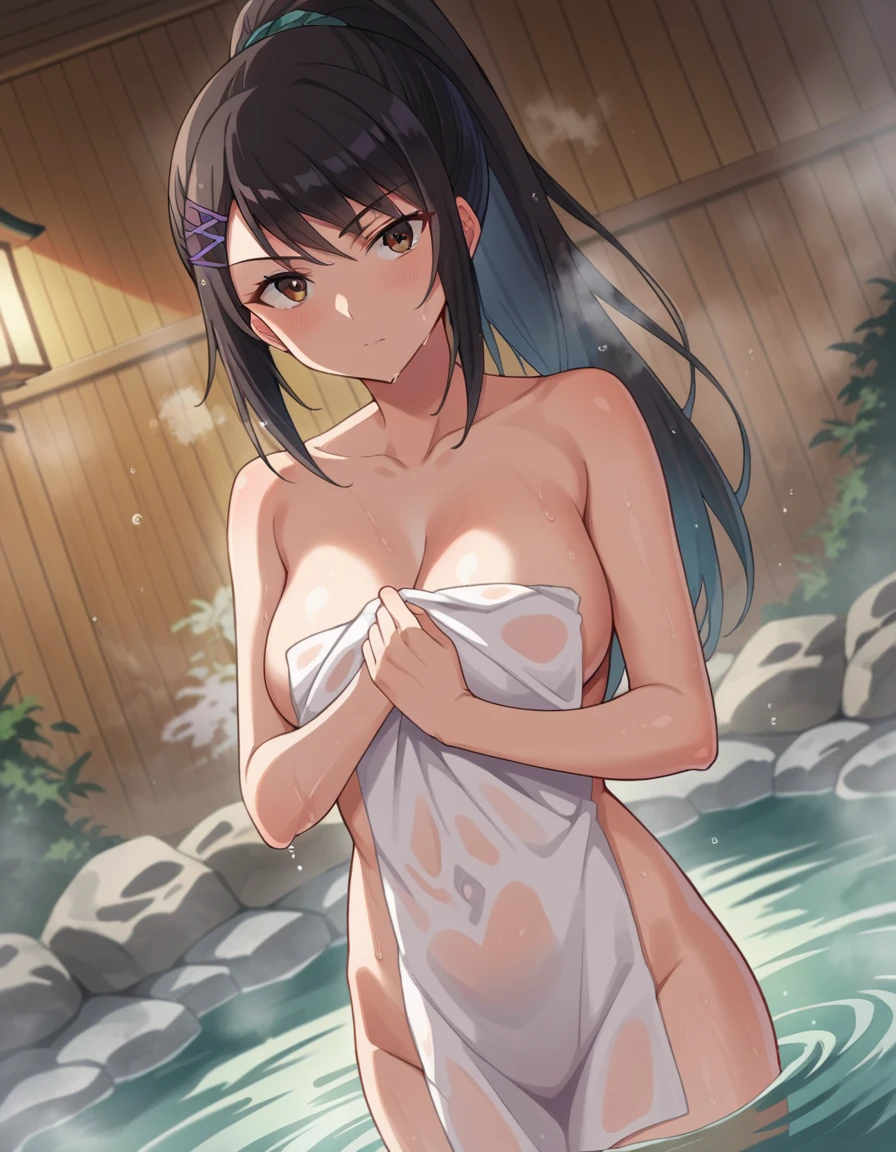 sae chabashira, long hair, black hair, hair ornament, brown eyes, ponytail, hairclip,