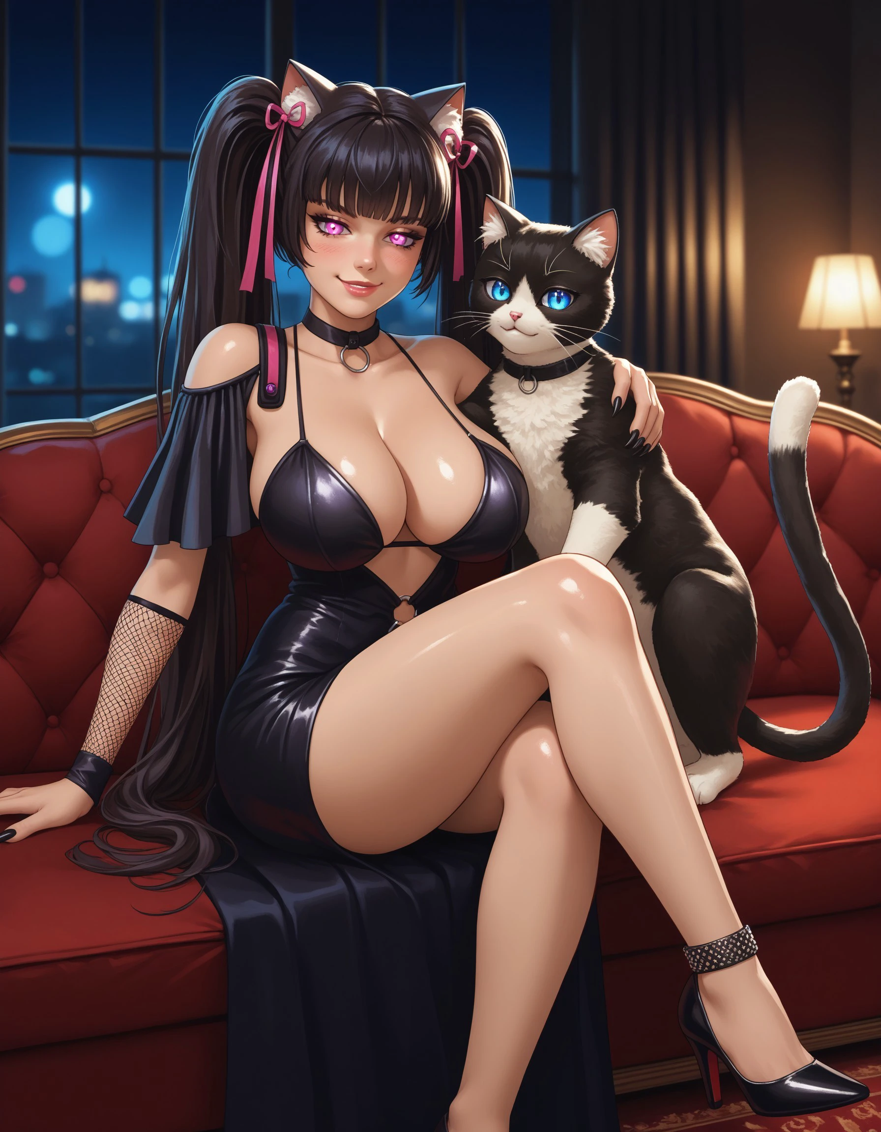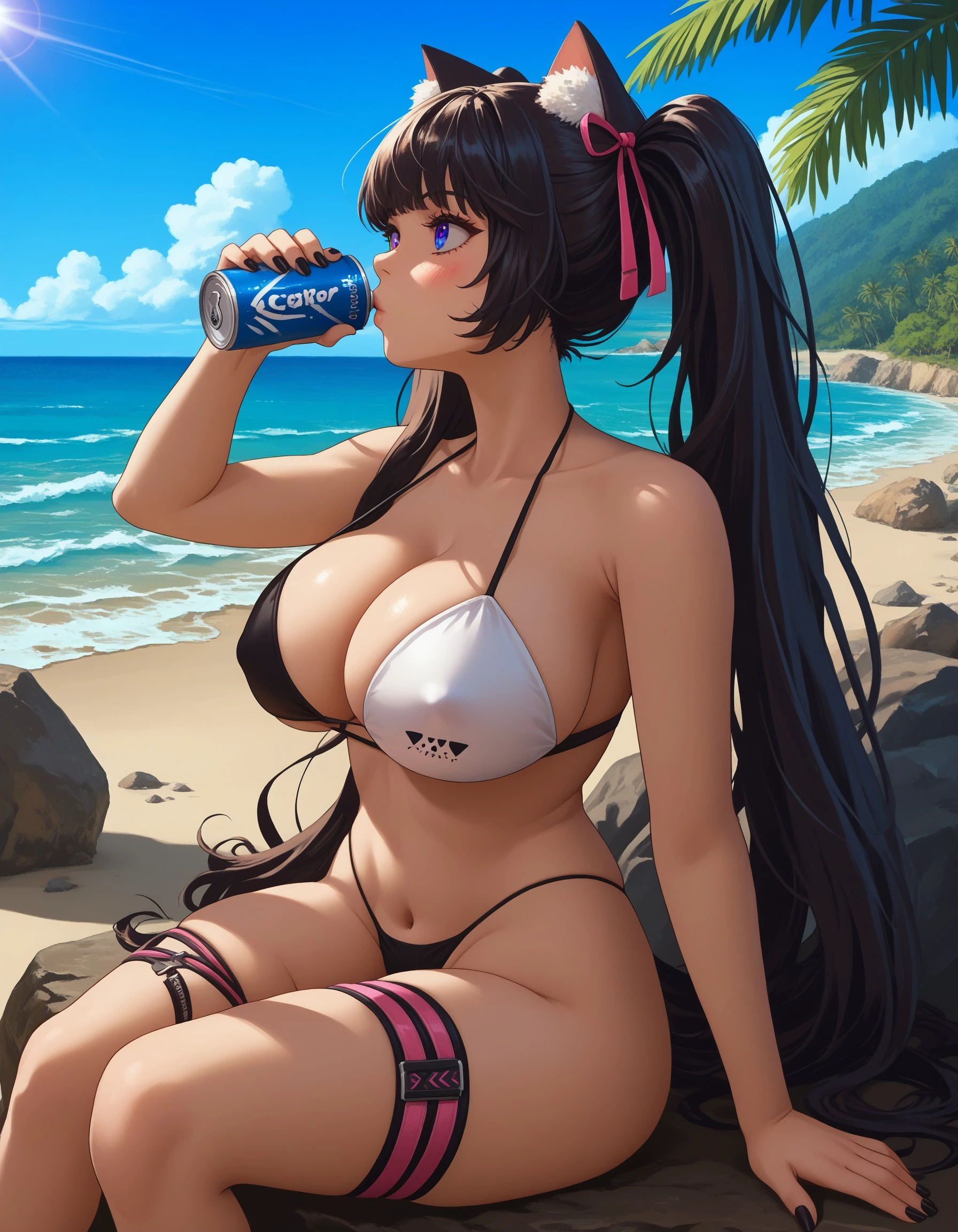 nknero, long hair, twintails, black hair, cat girl, cat ears, cat tail, hair ribbon, hairclip, heterochromia, blue eyes, pink eyes, large breasts, two-tone bikini, two-tone skirt, harness, detached collar, fingerless gloves, highleg panties, black panties, thigh strap, single thighhigh, pink thighhighs, black nails