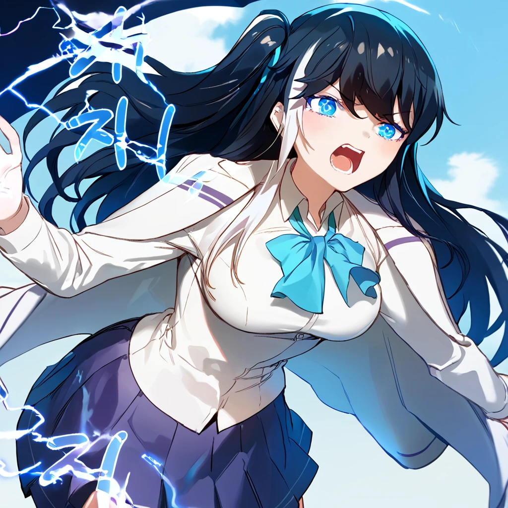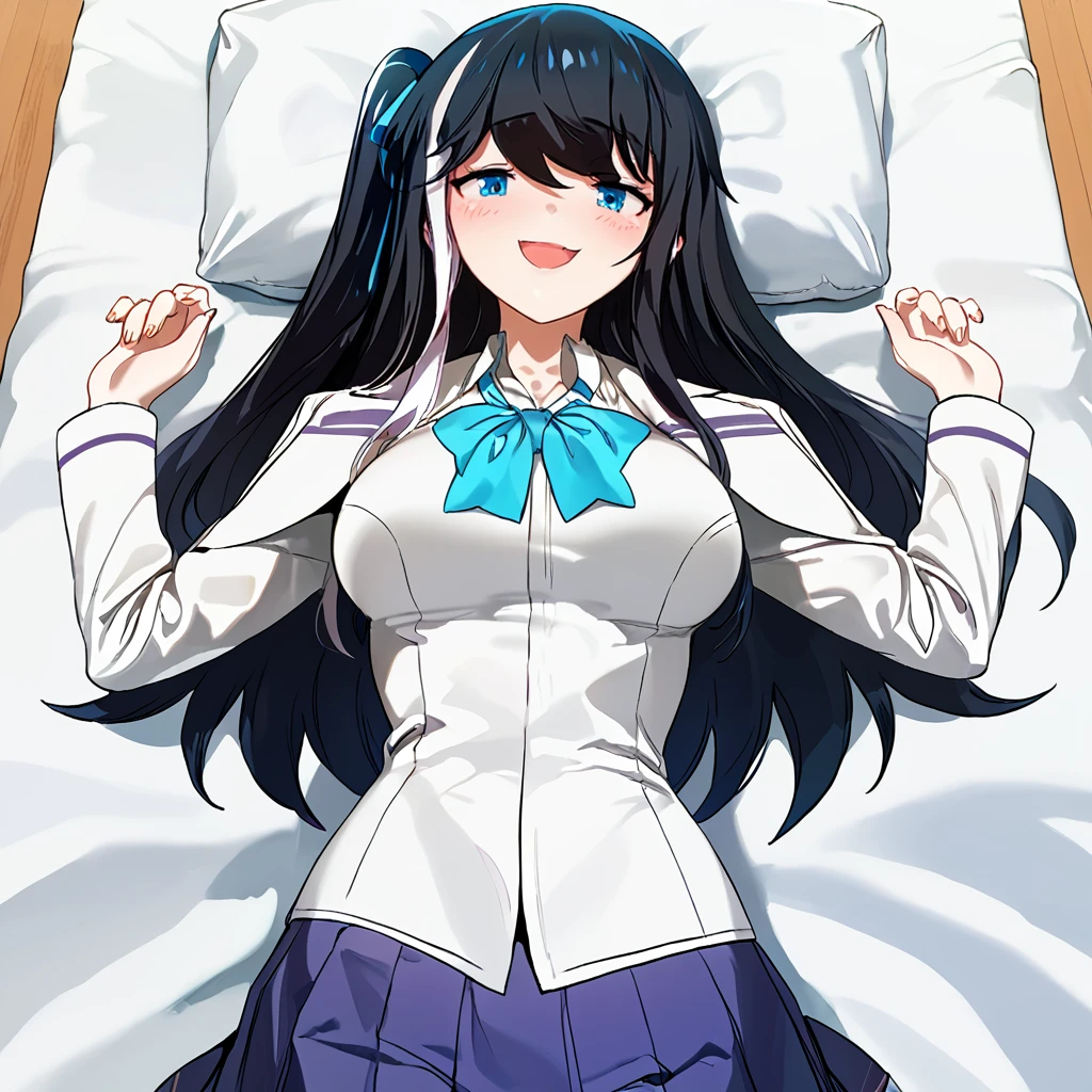Triggers: kim eunah, blue eyes, long hair, blue hair ribbon, black hair, multicolored hair, white streaks, (optionally: large breasts)