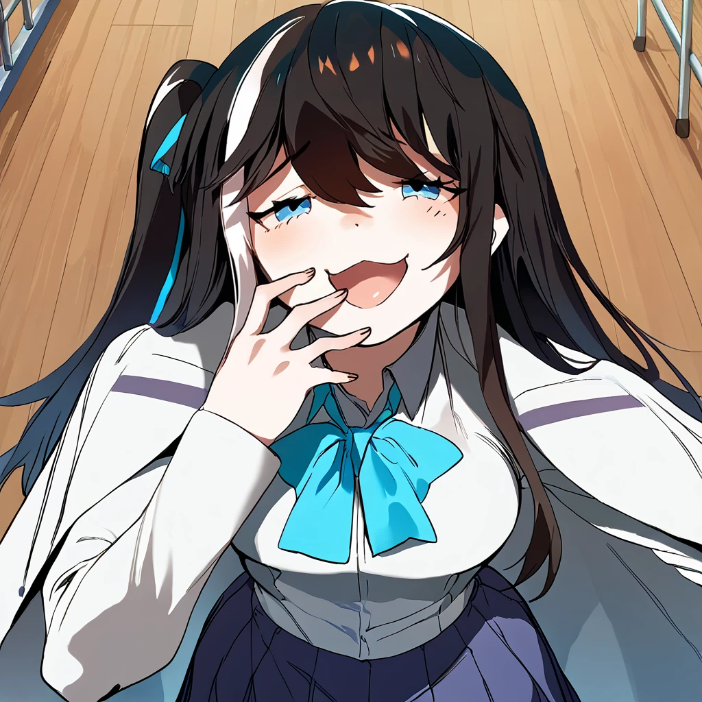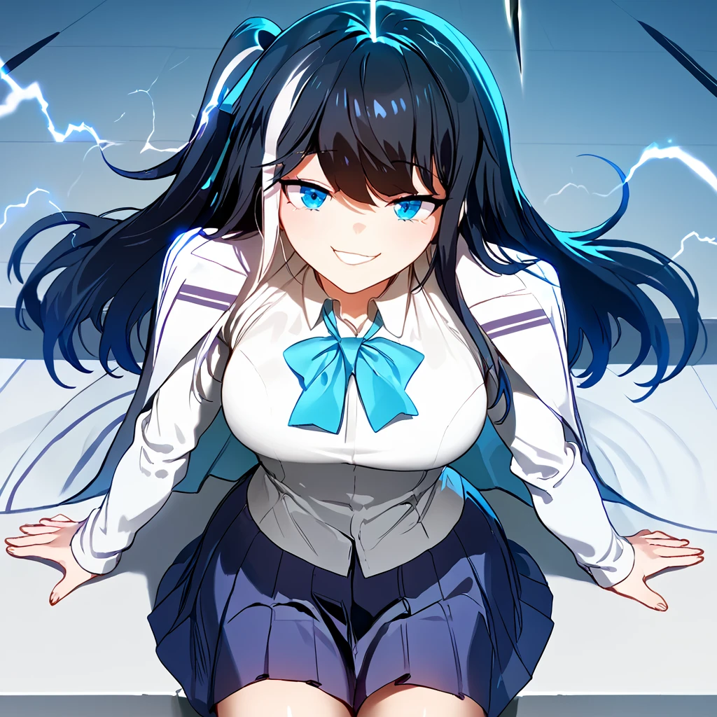 skirt, school uniform, blue bowtie, buttoned up shirt, white shirt, blue skirt, long sleeves,