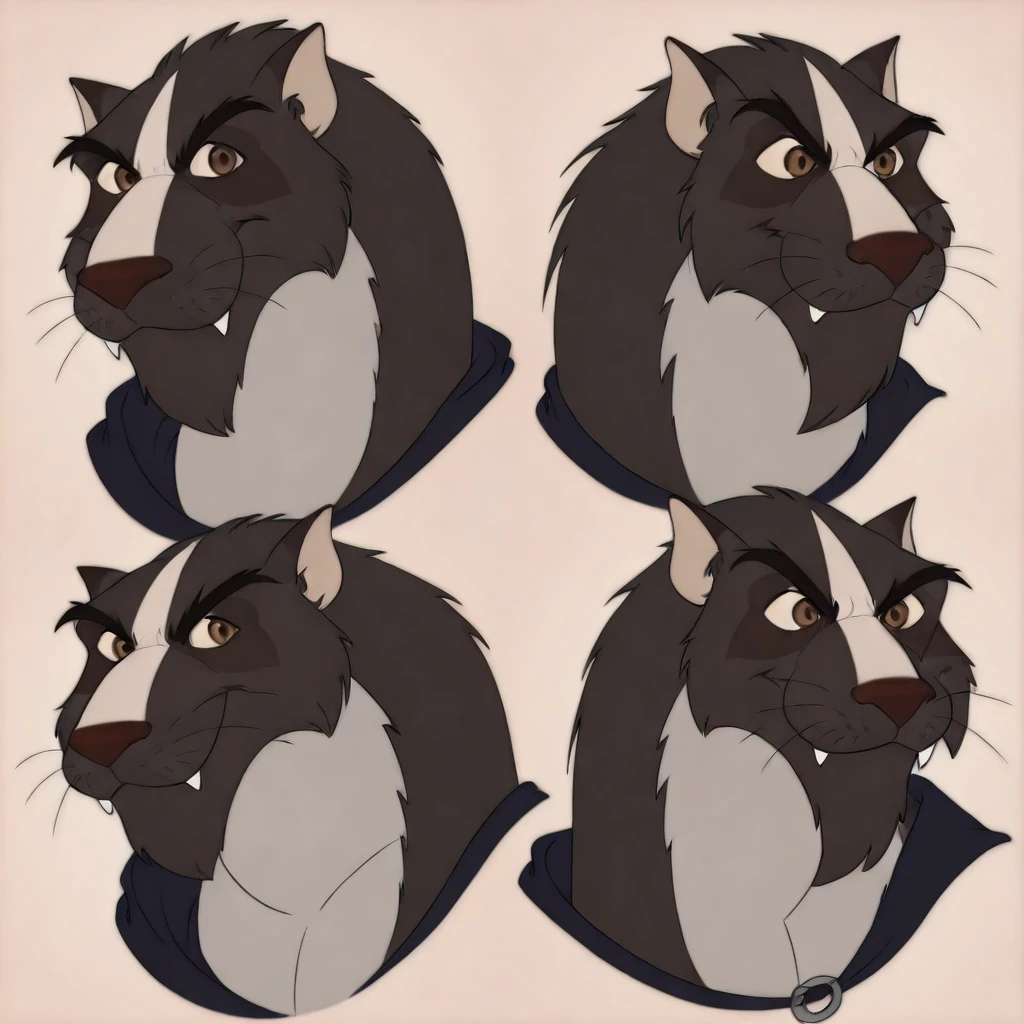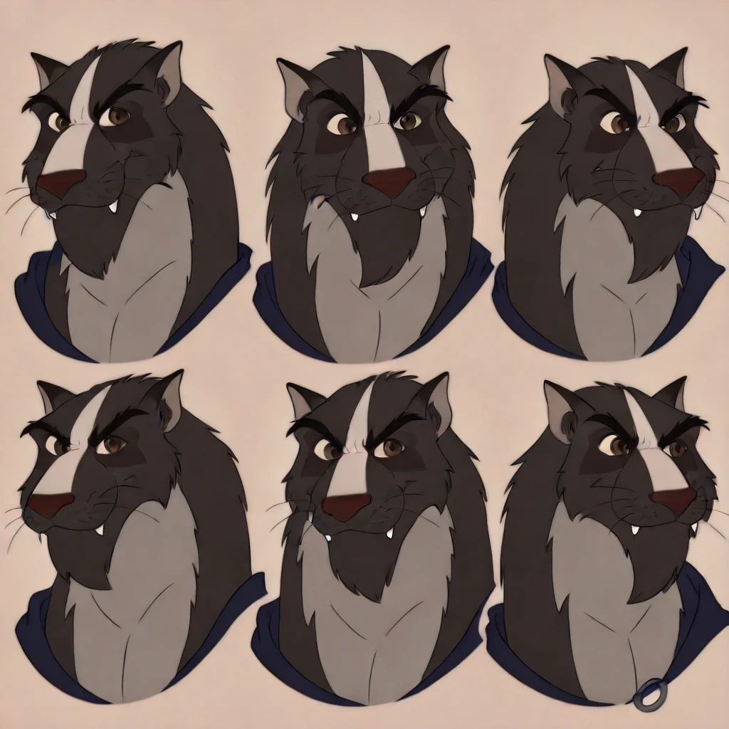 badrang the tyrant, identical heads poses, cartoon, identical eyes, 4 different faces poses, furry, fangs no humans whiskers , scar on face , animal focus , multiple views , looking at viewer ,simple background , brown eyes