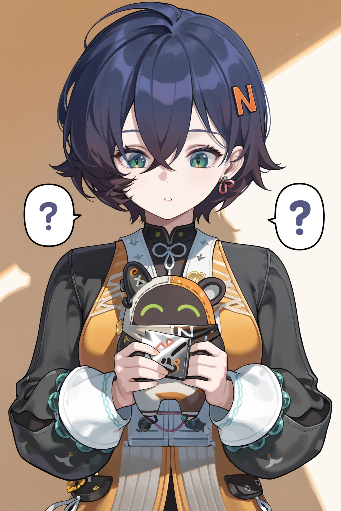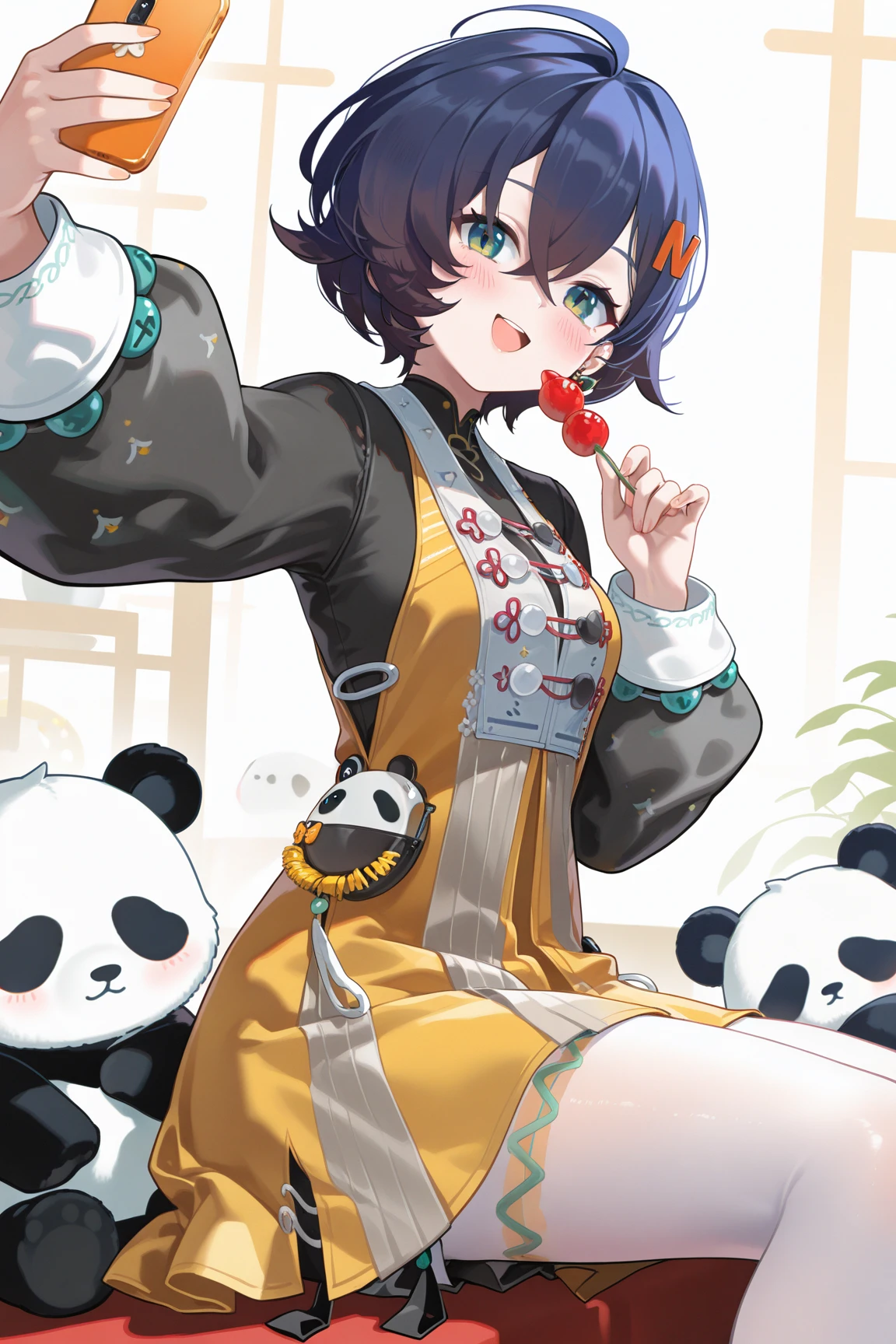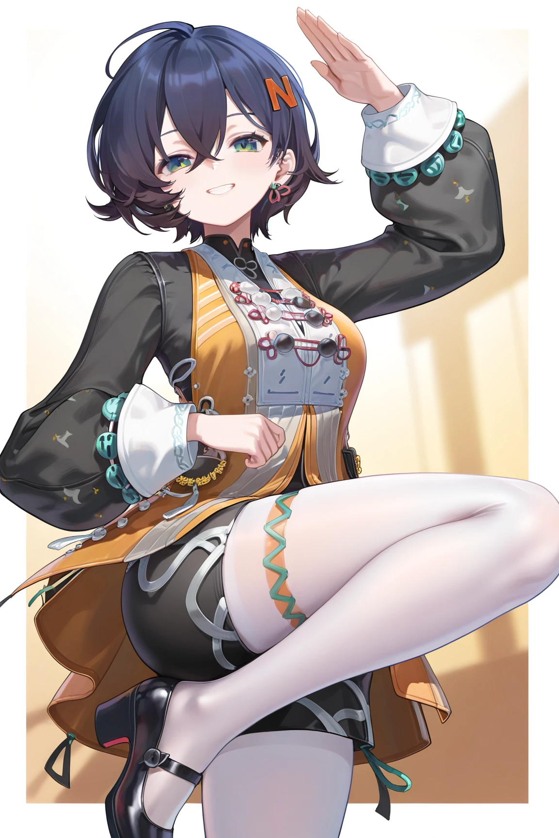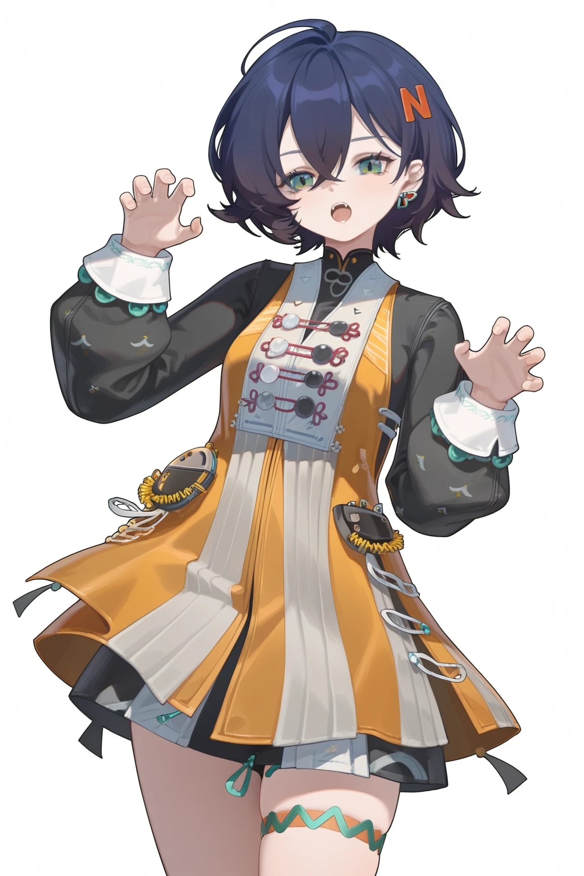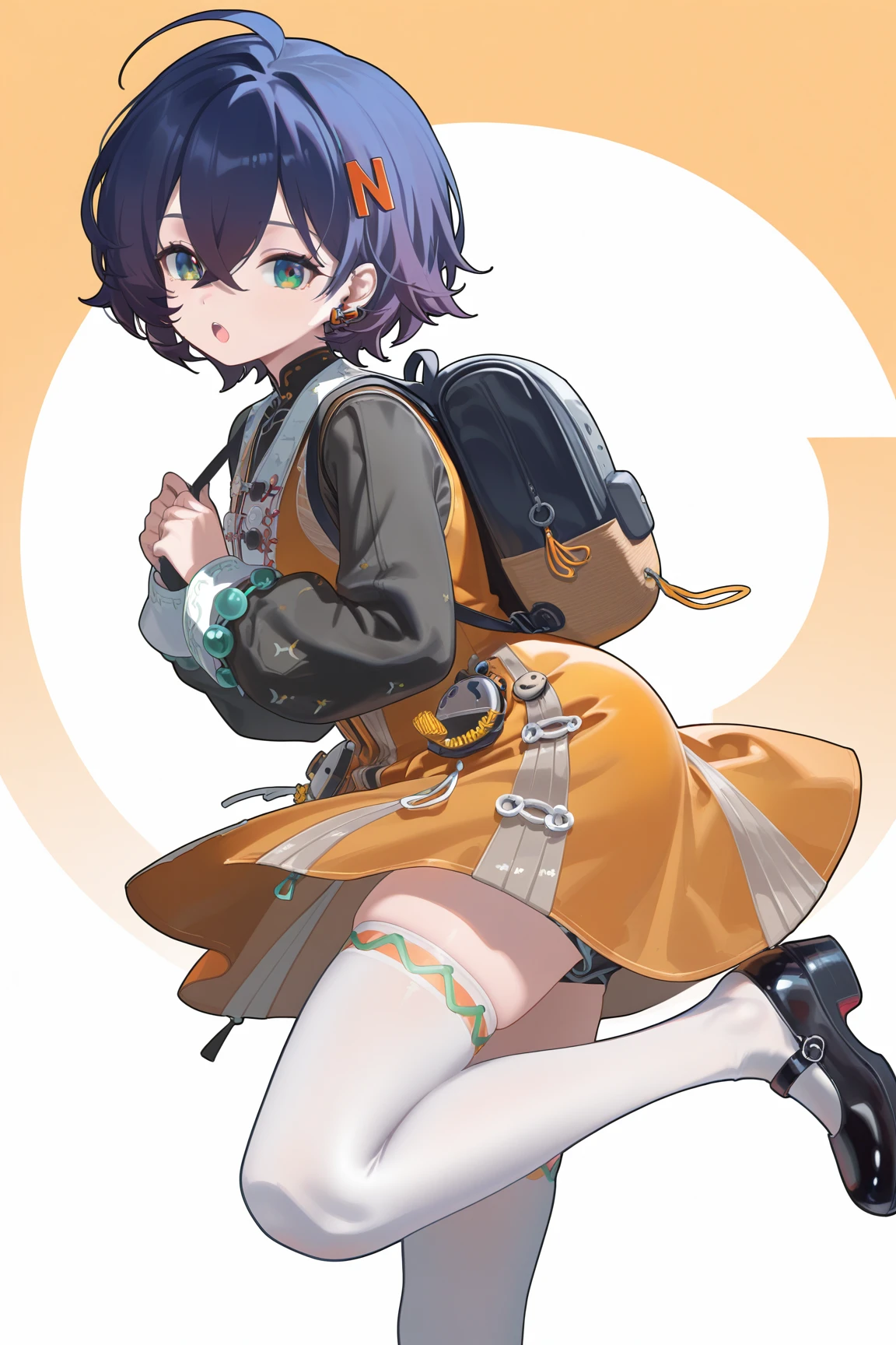 belle \(delicate sunlight\) \(zenless zone zero\), 1girl, green eyes, blue hair, short hair, orange dress, white pantyhose, earrings, long sleeves, look at viewers, dress, hair ornament, ahoge, hair between eyes, jacket