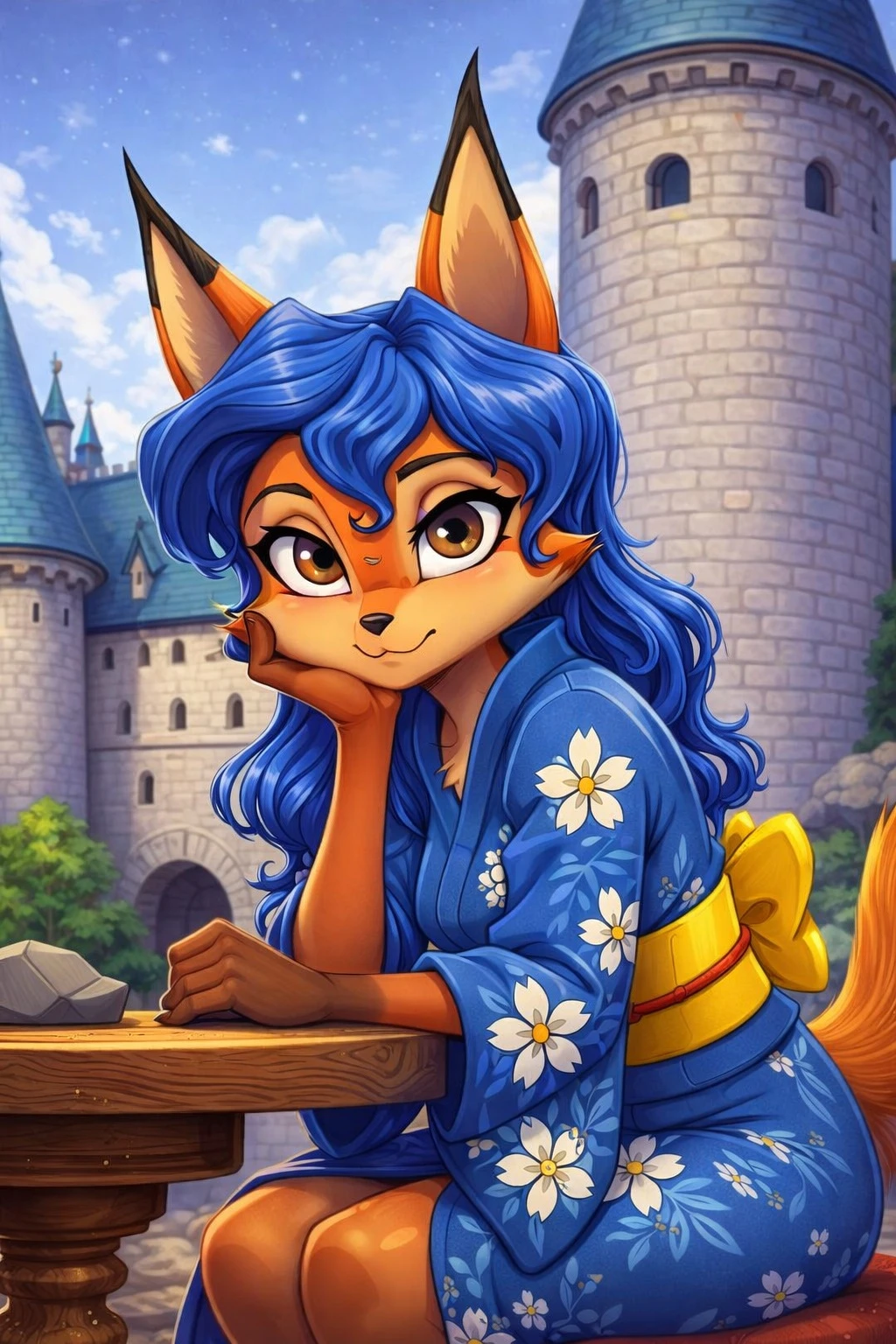 1girl, solo, furry, furry female, blue hair, fox ears, fox tail, orange fur, long hair, animal ears, brown eyes, fox girl,
