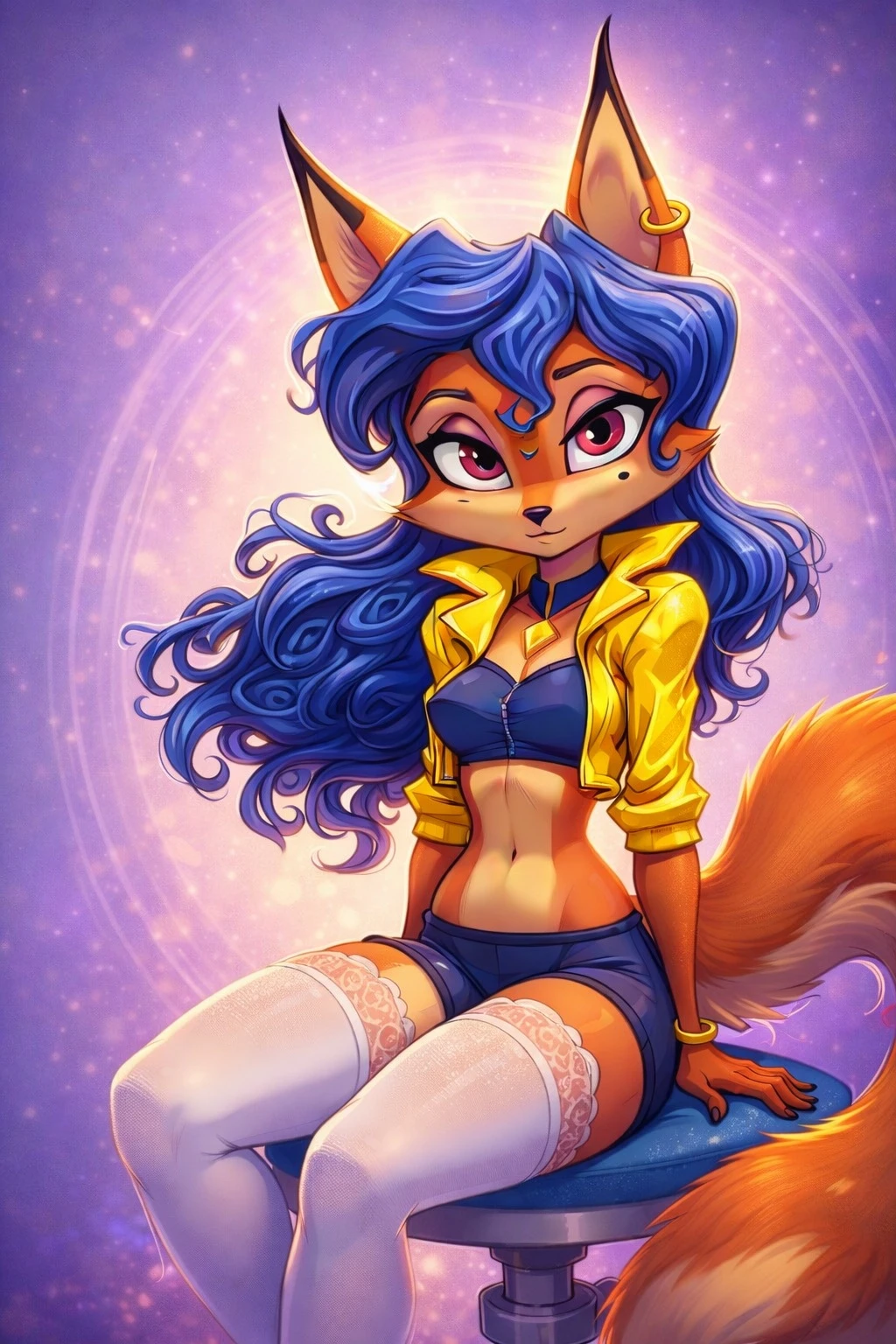 carmelita_fox, 1girl, solo, furry, furry female, blue hair, fox ears, fox tail, orange fur, long hair, animal ears, brown eyes, fox girl,