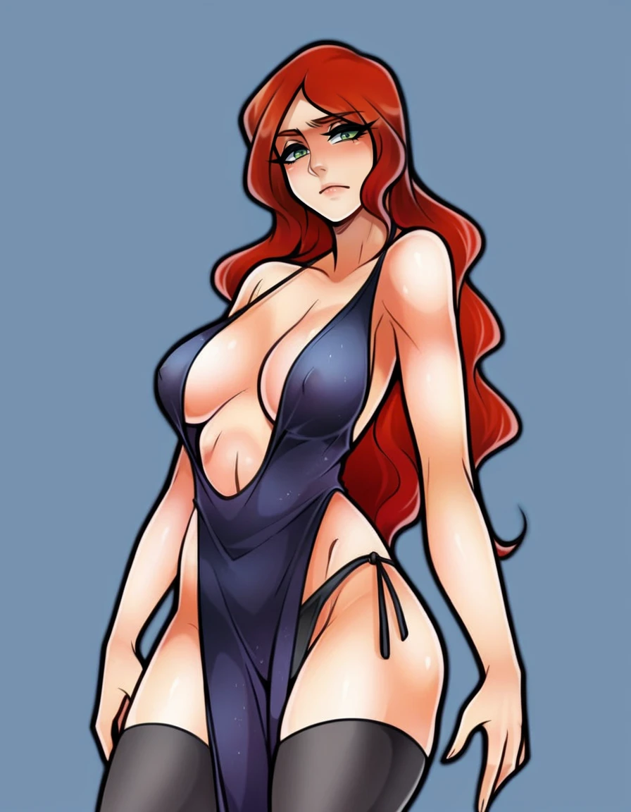 black dress, plunging neckline, backless dress, thighhighs, lace trim,
