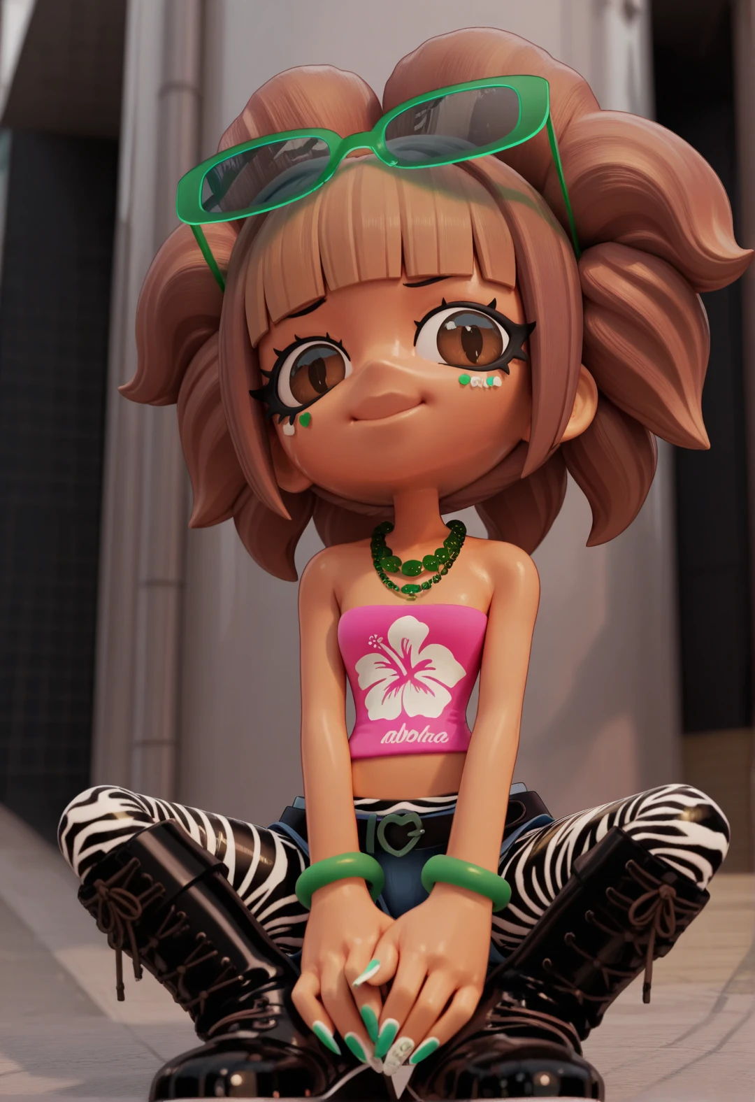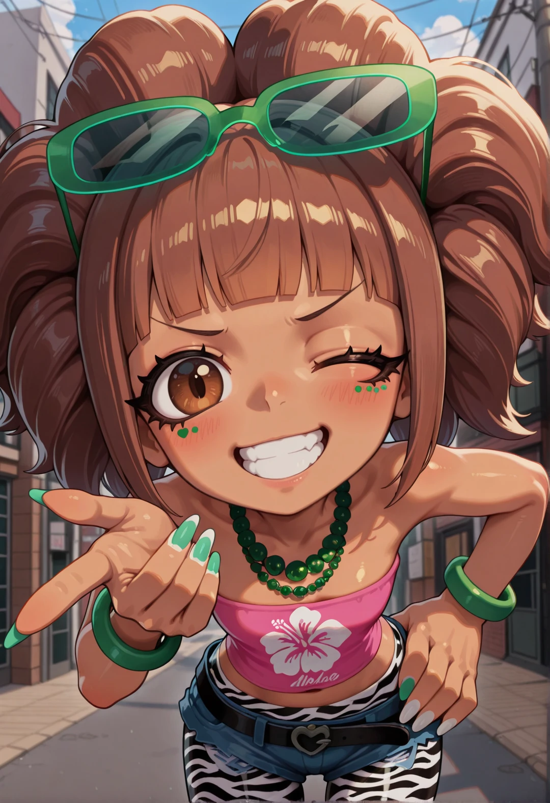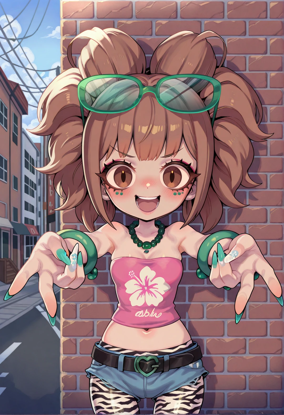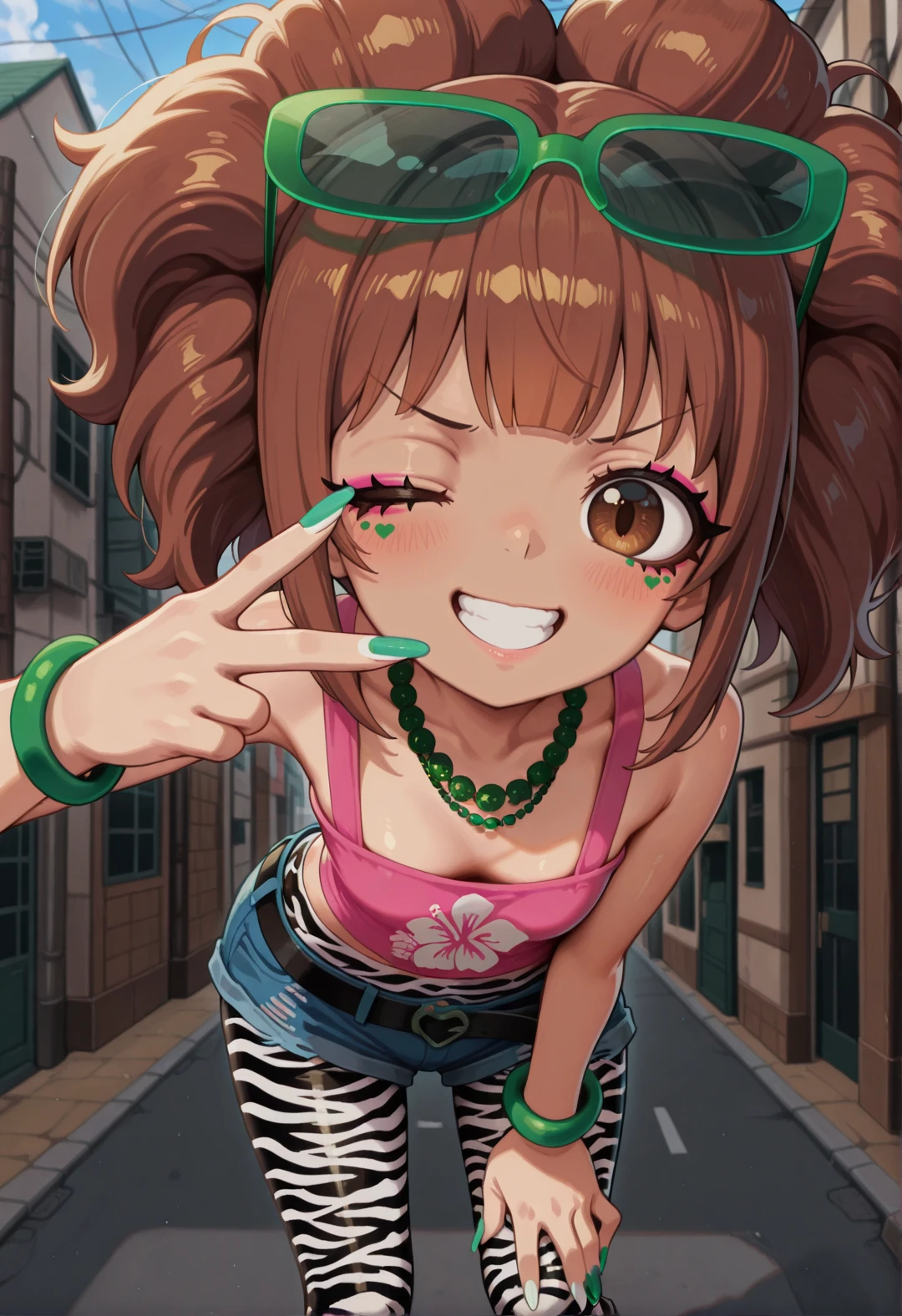 UberEatsJapanAdGAL, brown hair, green-framed tinted eyewear, eyewear on head, white nails, aqua nails, long sharp fingernails, makeup, green bead necklace, green bracelet, floral print pink tube top, denim shorts, black belt,animal print pantyhose,