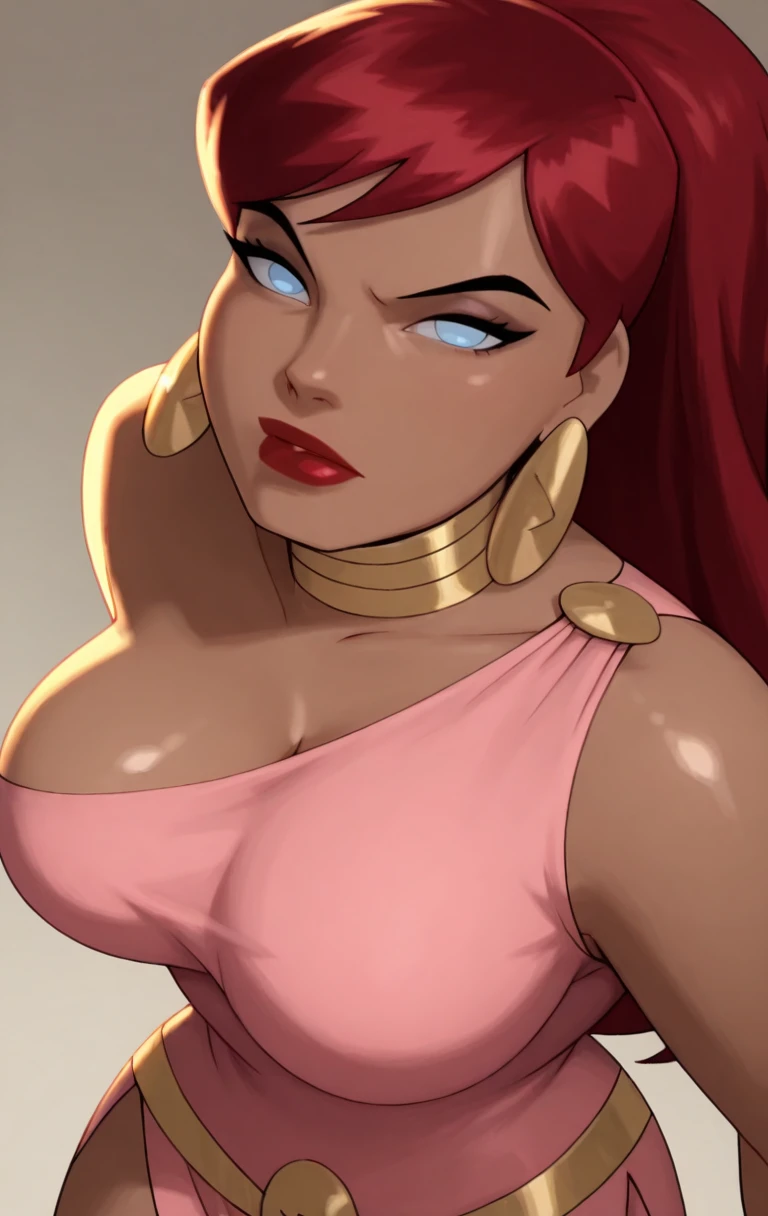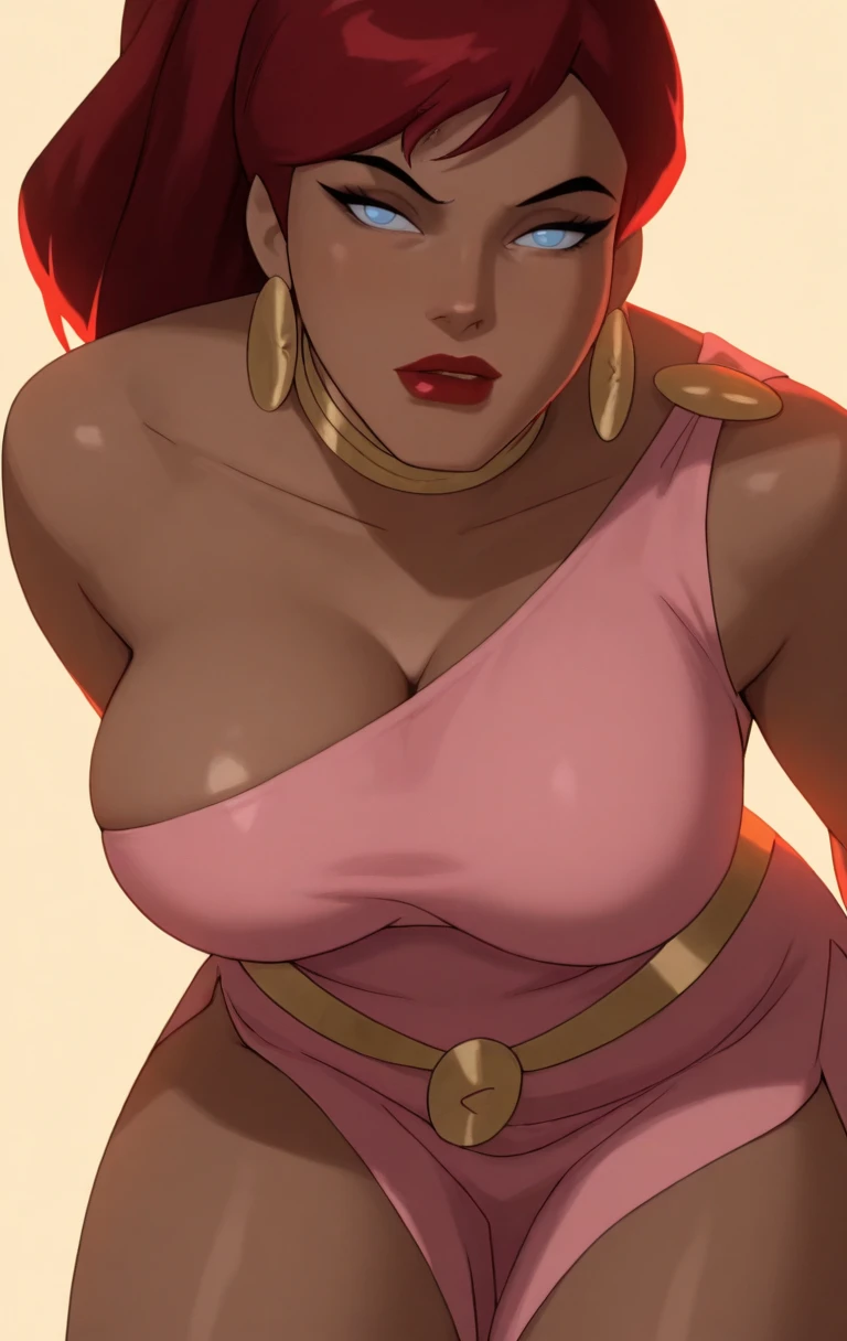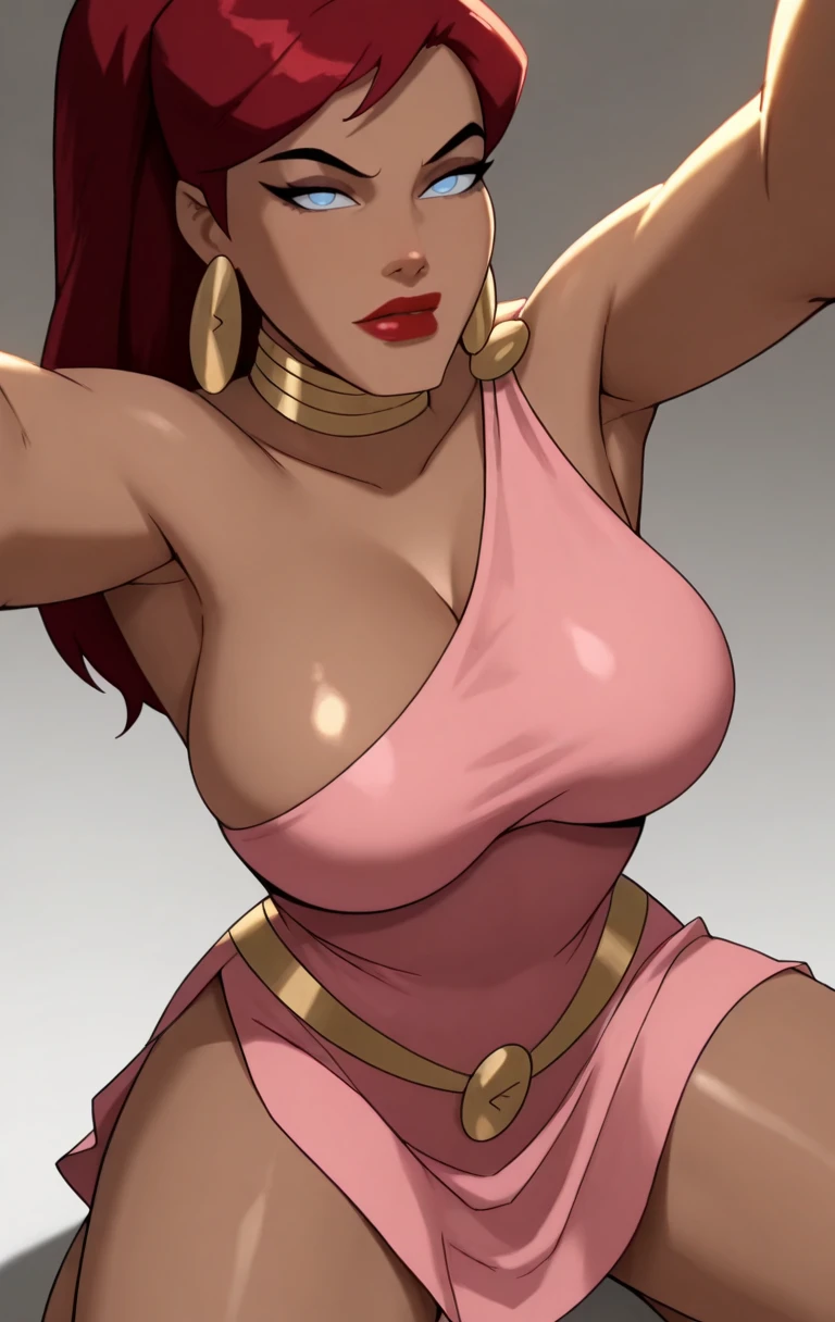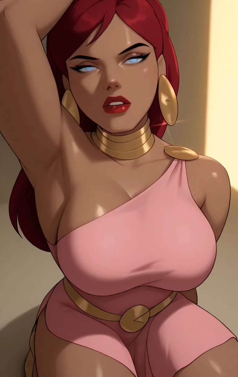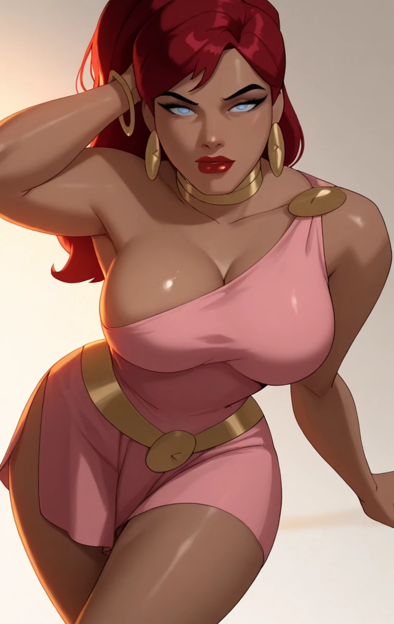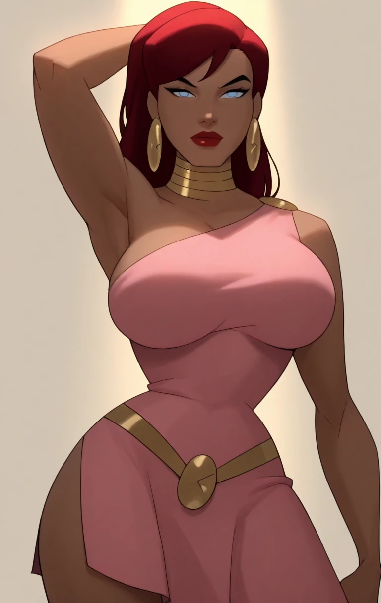1girl, solo, long hair, looking at viewer, blue eyes, simple background, red hair, jewelr, earrings, dark skin, dark-skinned female, turtleneck, thighs, armpits, pink dress, red lips,g1g4nt4,