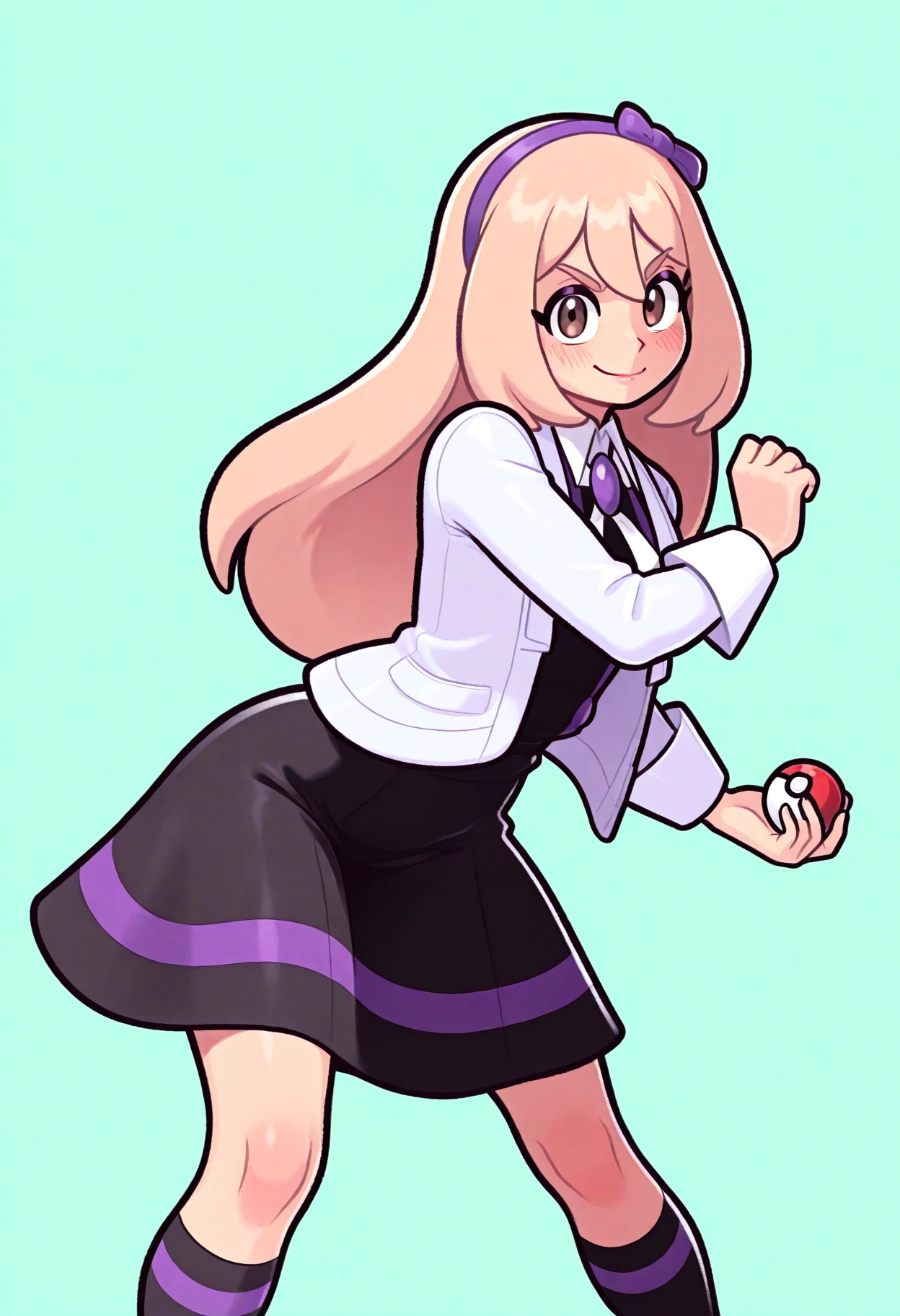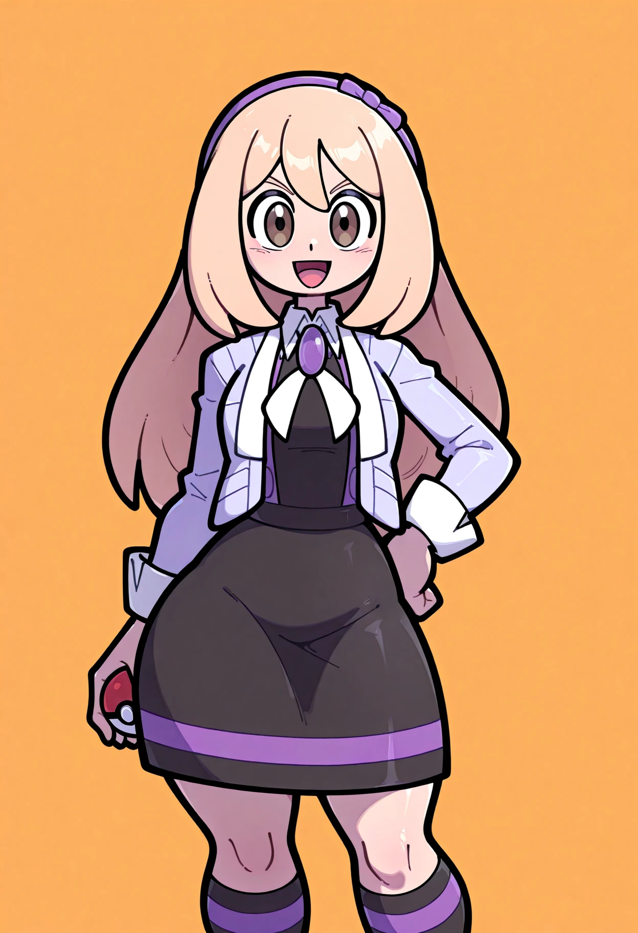 acetrainerza, brown eyes, blond hair, long hair, purple hairband, collared shirt, black dress, , , bolo tie, kneehighs, shoes,