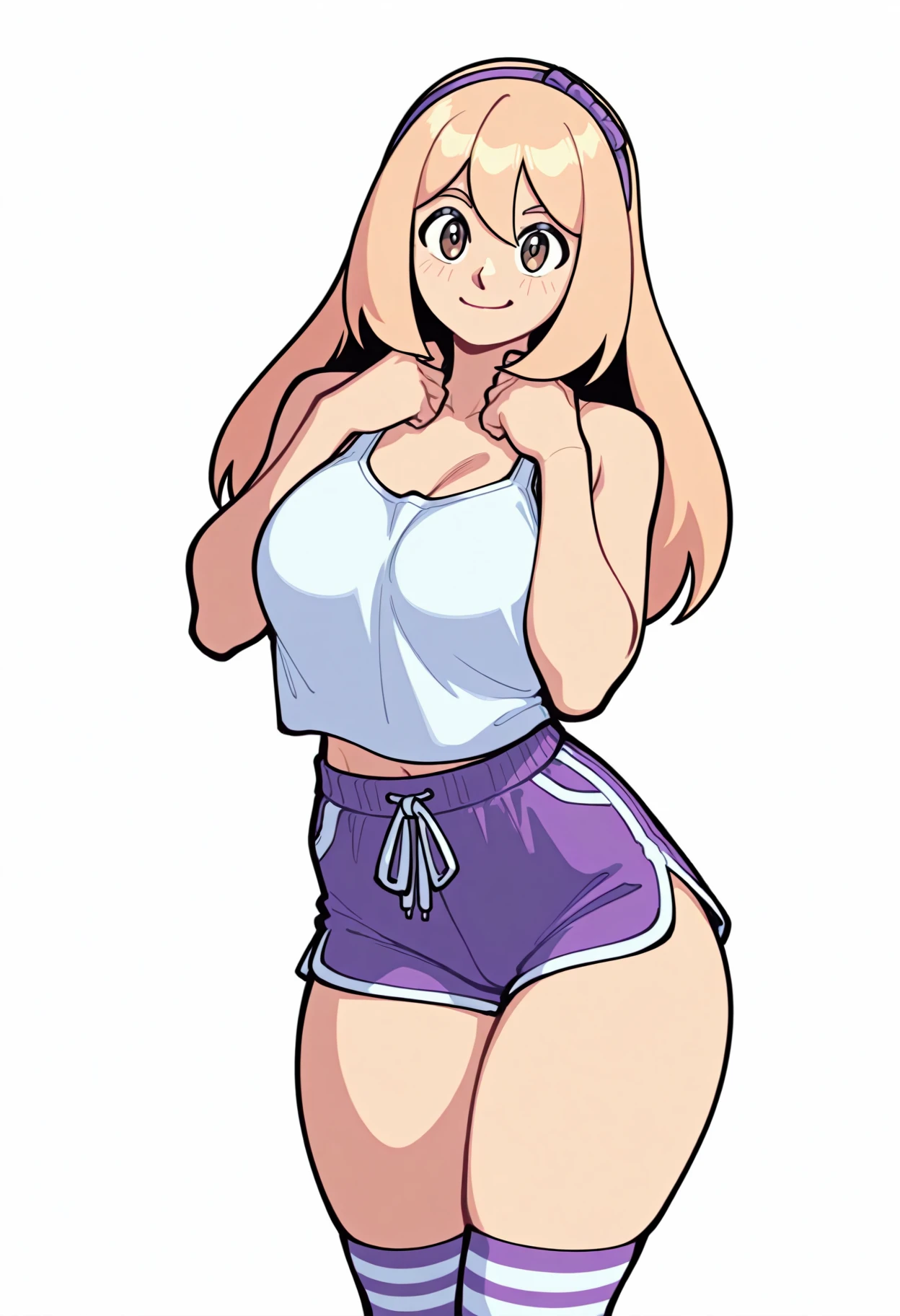 Key word is acetrainerza and for default outfit use: brown eyes, blond hair, long hair, purple hairband, collared shirt, black dress, open clothes, open shirt, bolo tie, kneehighs, shoes,