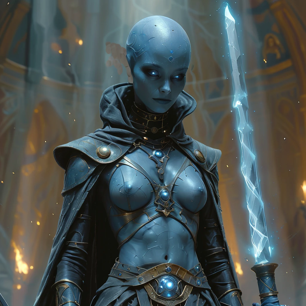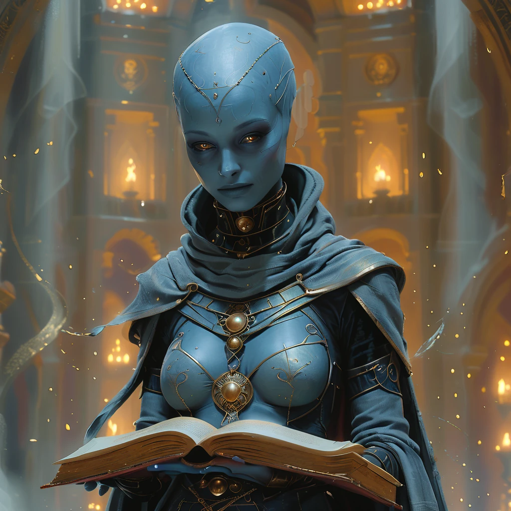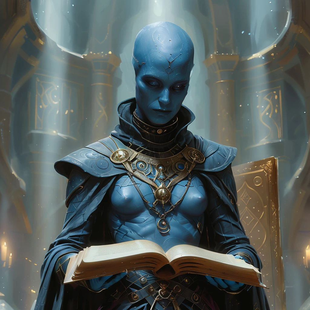 1boy, 1girl, abs, armlet, armor, bald, belt, blue eyes, blue skin, blurry, blurry background, bodysuit, book, breasts, brown eyes, cape, cleavage, closed eyes, closed mouth, colored skin, earrings, facial hair, facial mark, facing viewer, gloves, glowing, glowing eyes, gorget, helmet, hood, jacket, jewelry, lips, looking at viewer, male focus, mask, medium breasts, midriff, muscular, navel, necklace, ???????, nose, portrait, purple eyes, realistic, red eyes, ring, robe, shoulder armor, singlDescription