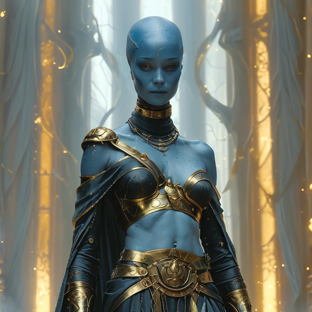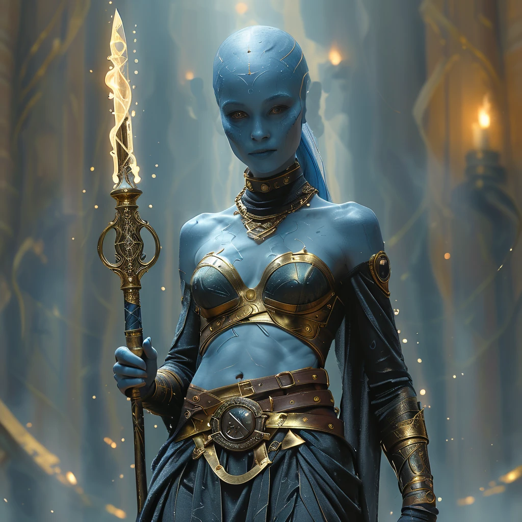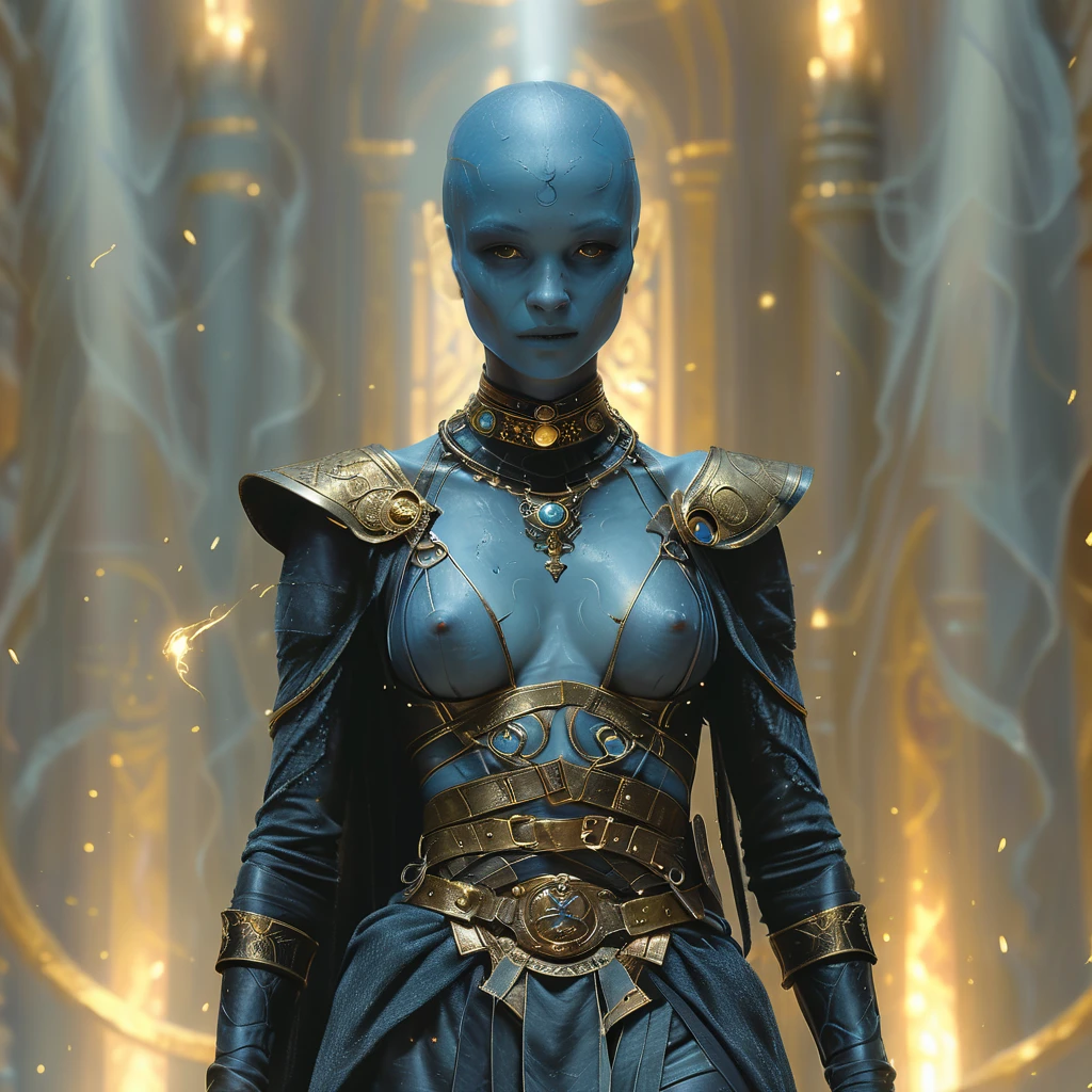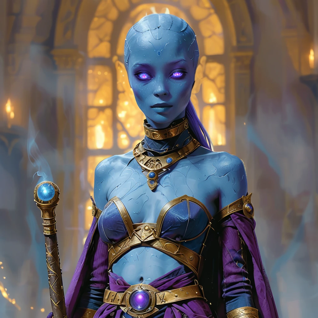 1boy, 1girl, abs, armlet, armor, bald, belt, blue eyes, blue skin, blurry, blurry background, bodysuit, book, breasts, brown eyes, cape, cleavage, closed eyes, closed mouth, colored skin, earrings, facial hair, facial mark, facing viewer, gloves, glowing, glowing eyes, gorget, helmet, hood, jacket, jewelry, lips, looking at viewer, male focus, mask, medium breasts, midriff, muscular, navel, necklace, ???????, nose, portrait, purple eyes, realistic, red eyes, ring, robe, shoulder armor, singlDescription