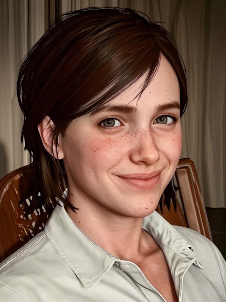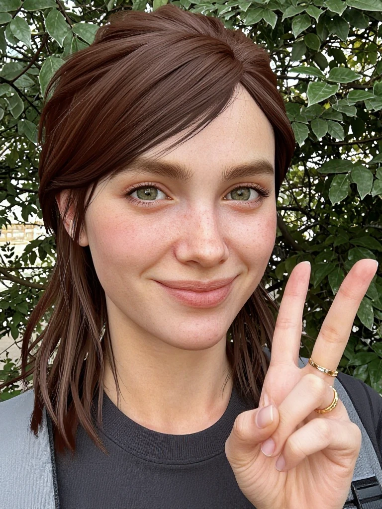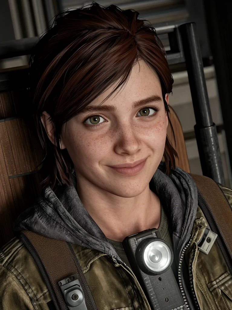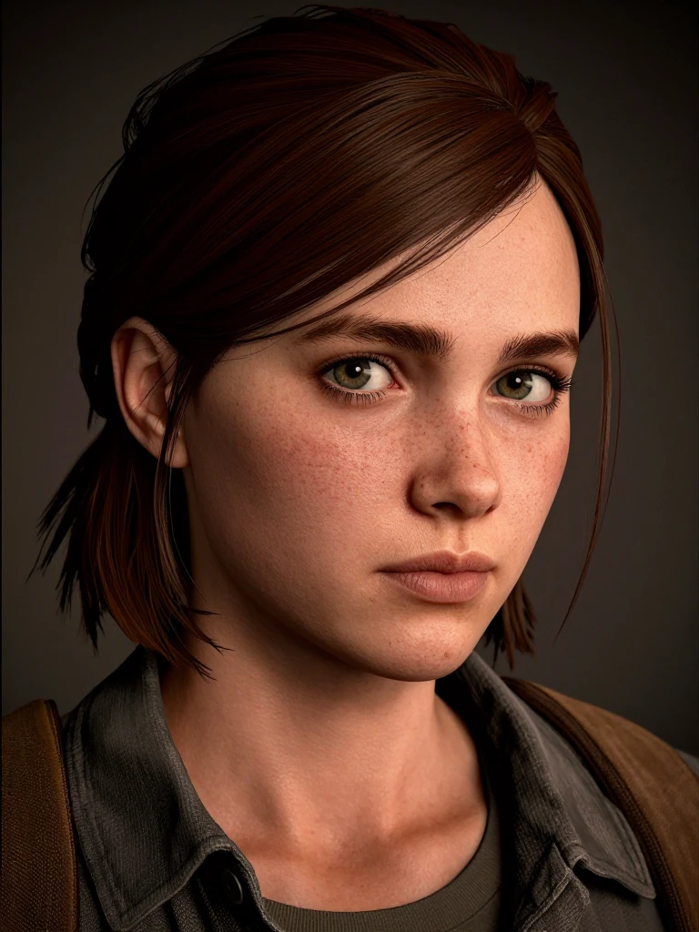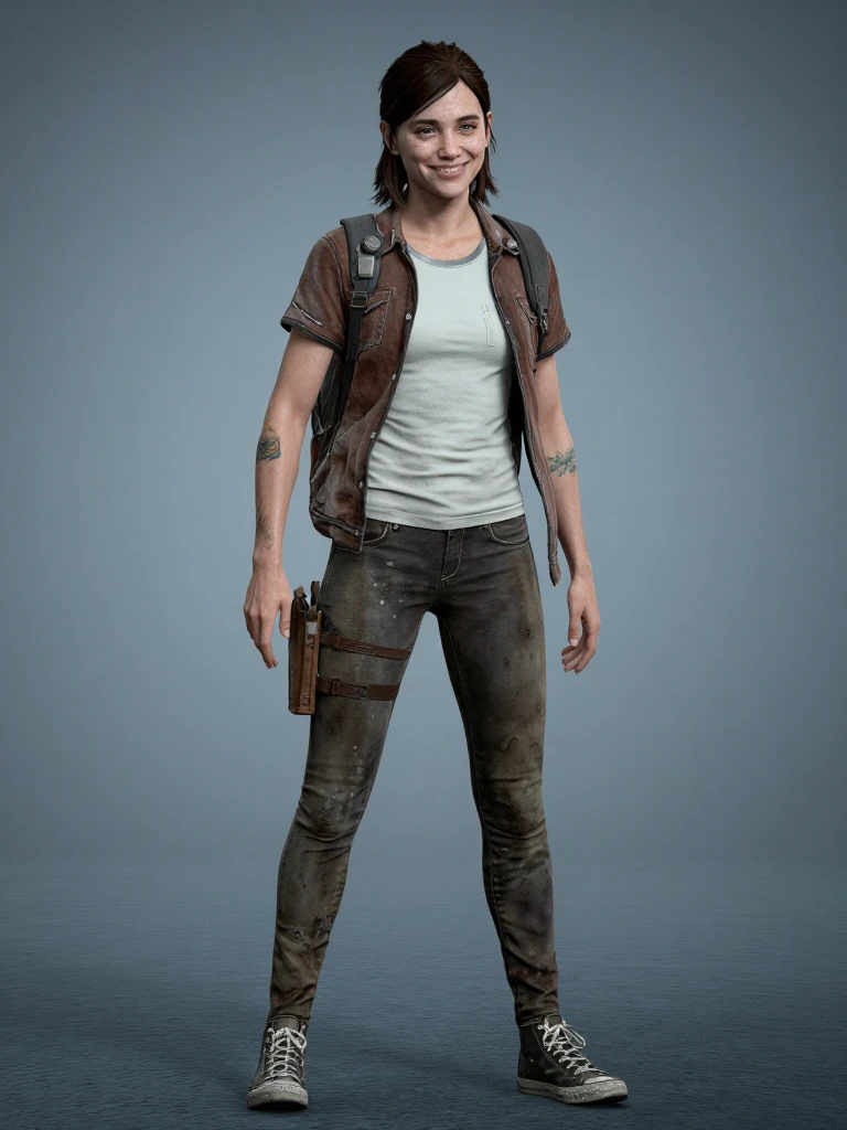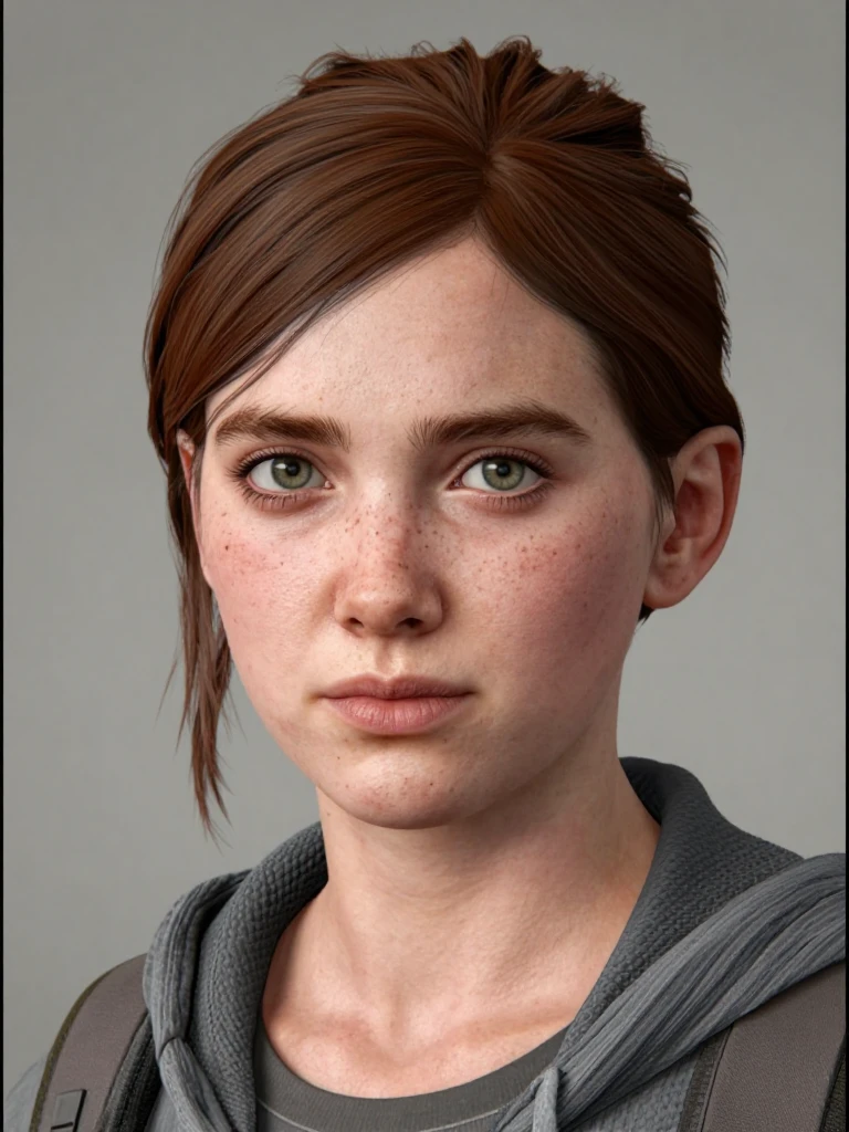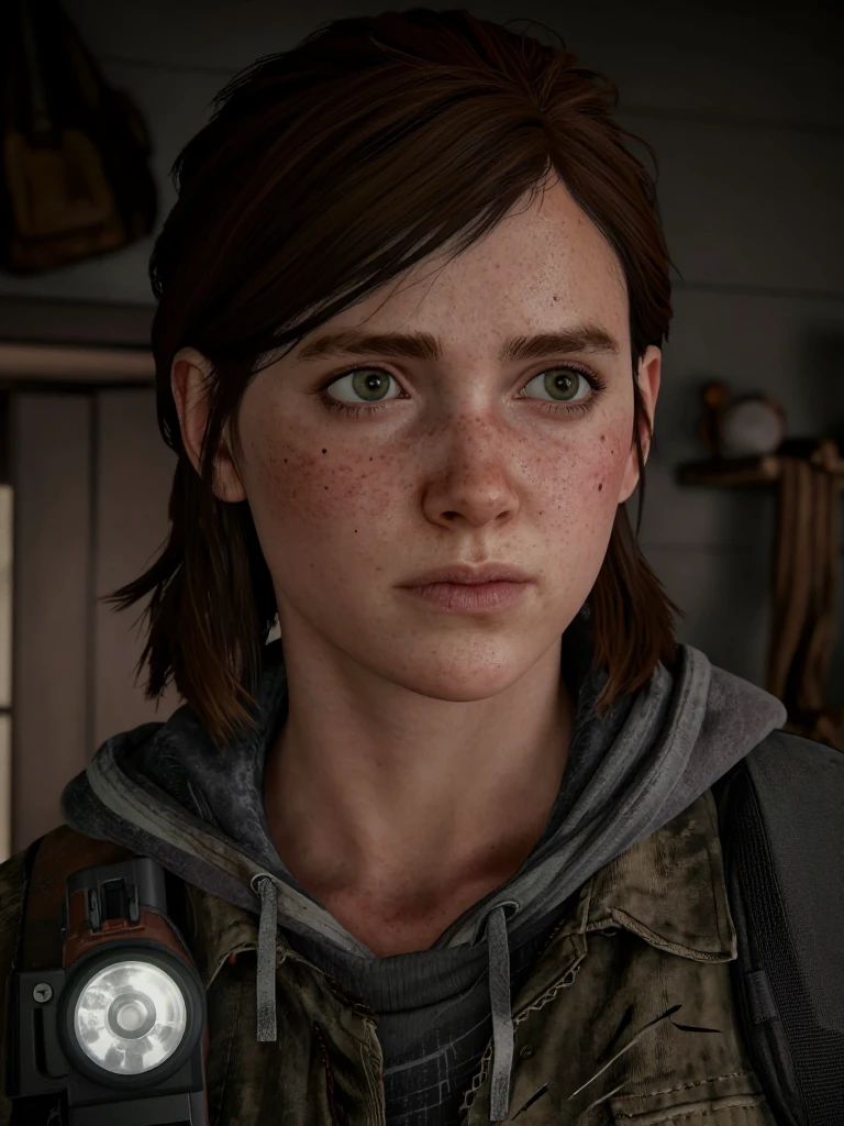 Example Prompt including trigger word: "Ellie_TLOU2, a teenage girl with brown hair tied back and green eyes, wearing a green hooded jacket over a dark shirt and carrying a backpack with a flashlight attached, close-up portrait, smiling gently, looking to the side"
