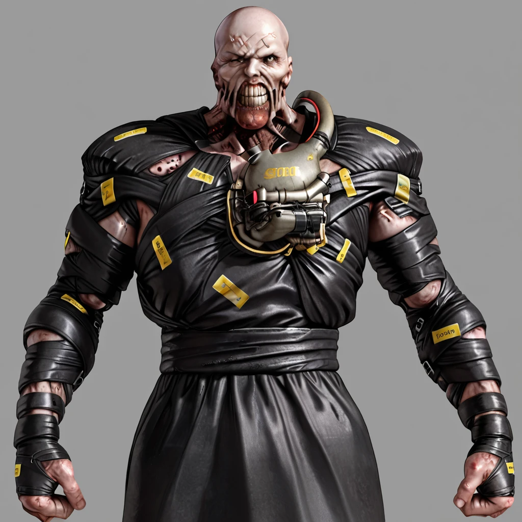 • Trigger : NemesisNoWeapon, zombie, bald, shoulder armor, science fiction, grey background, skull, simple background, pauldrons, teeth, standing, cowboy shot