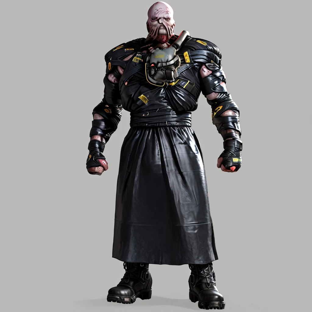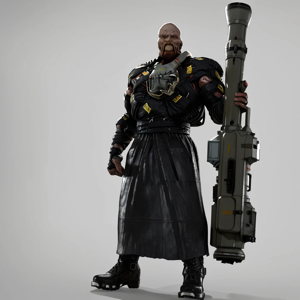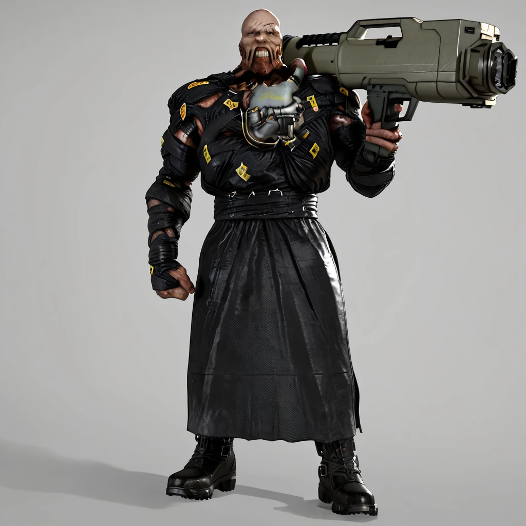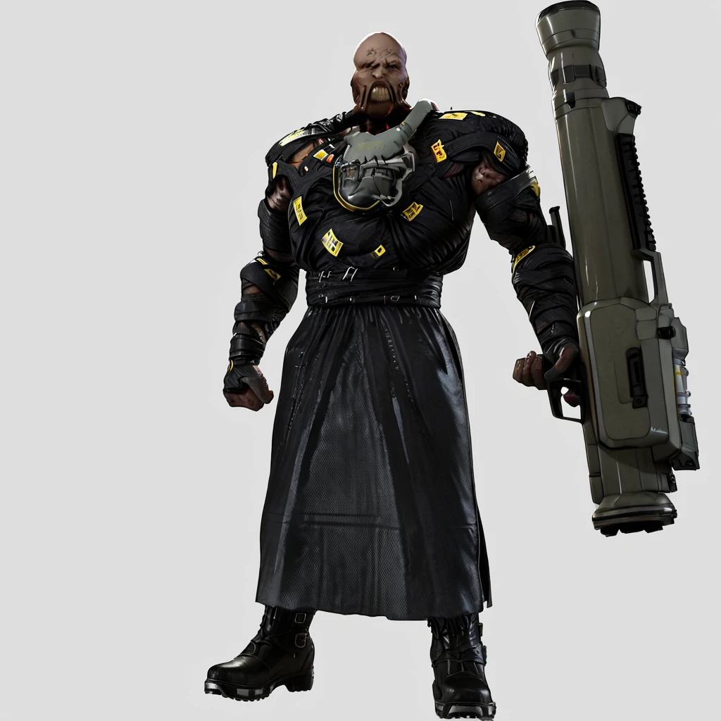 Nemesis, holding weapon, zombie, rocket launcher, bald, holding gun, white background, dark skin, gloves, dark-skinned male, boots, full body, facial hair, simple background, black footwear, standing, old, science fiction, cyberpunk, cowboy shot