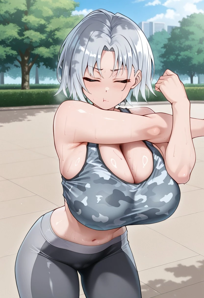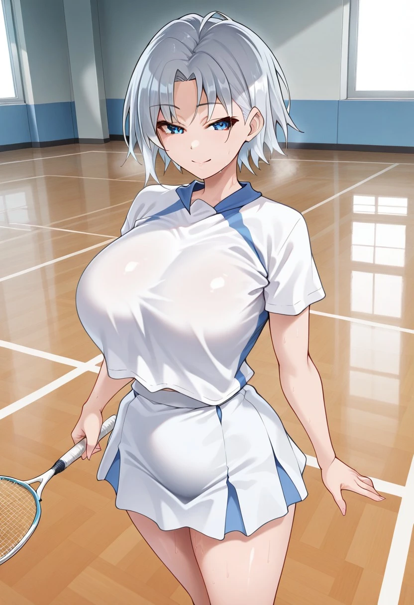 1girl ,bangs, parted bangs, grey hair, short hair, blue eyes, huge breasts,