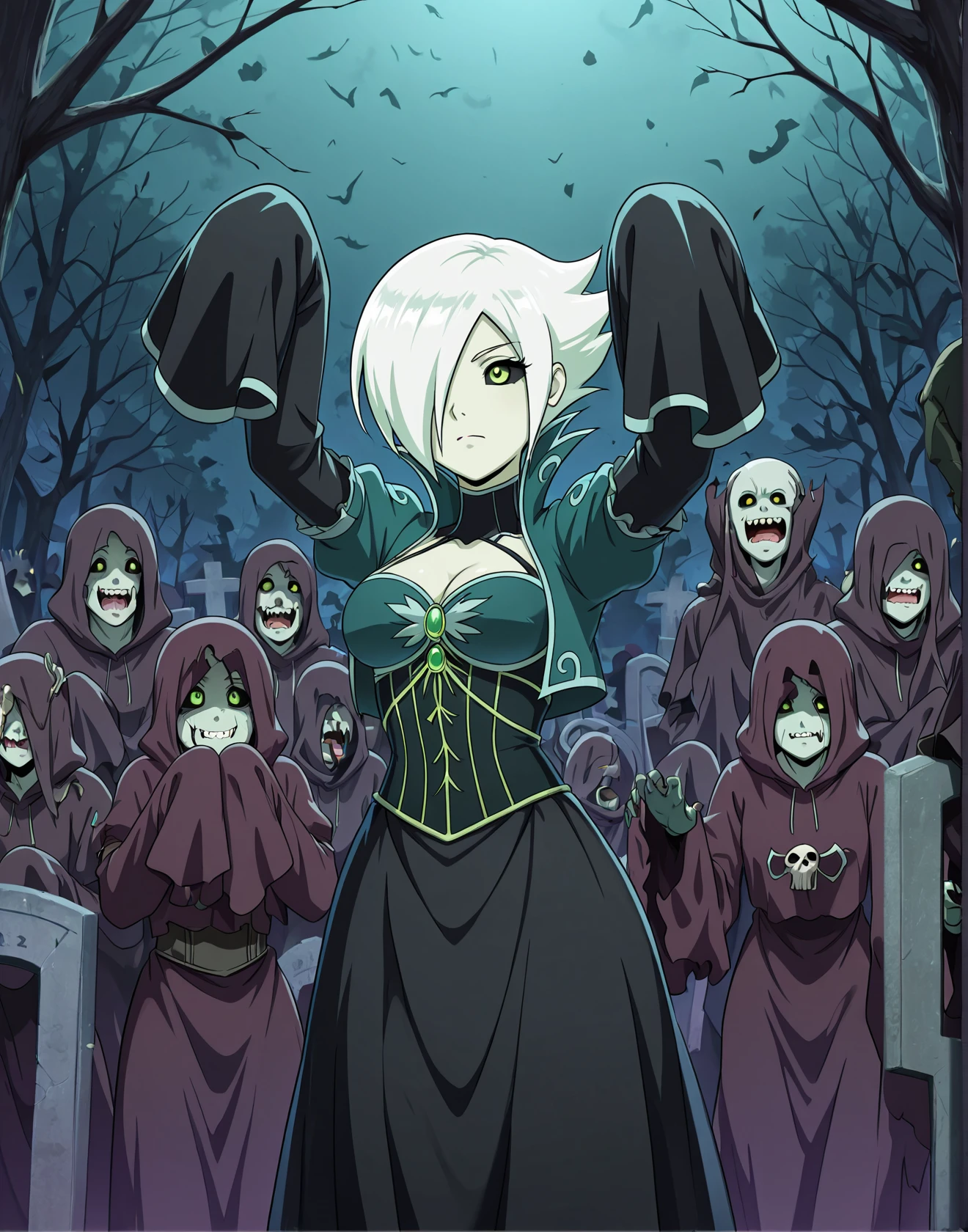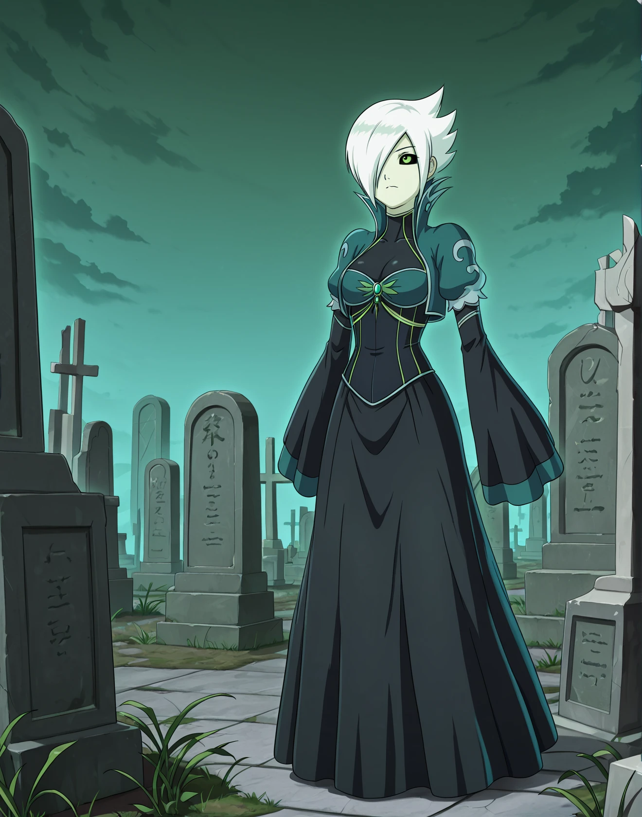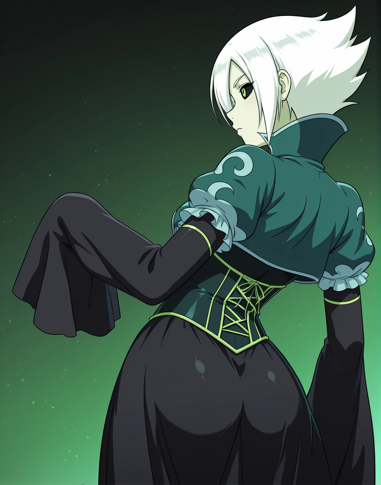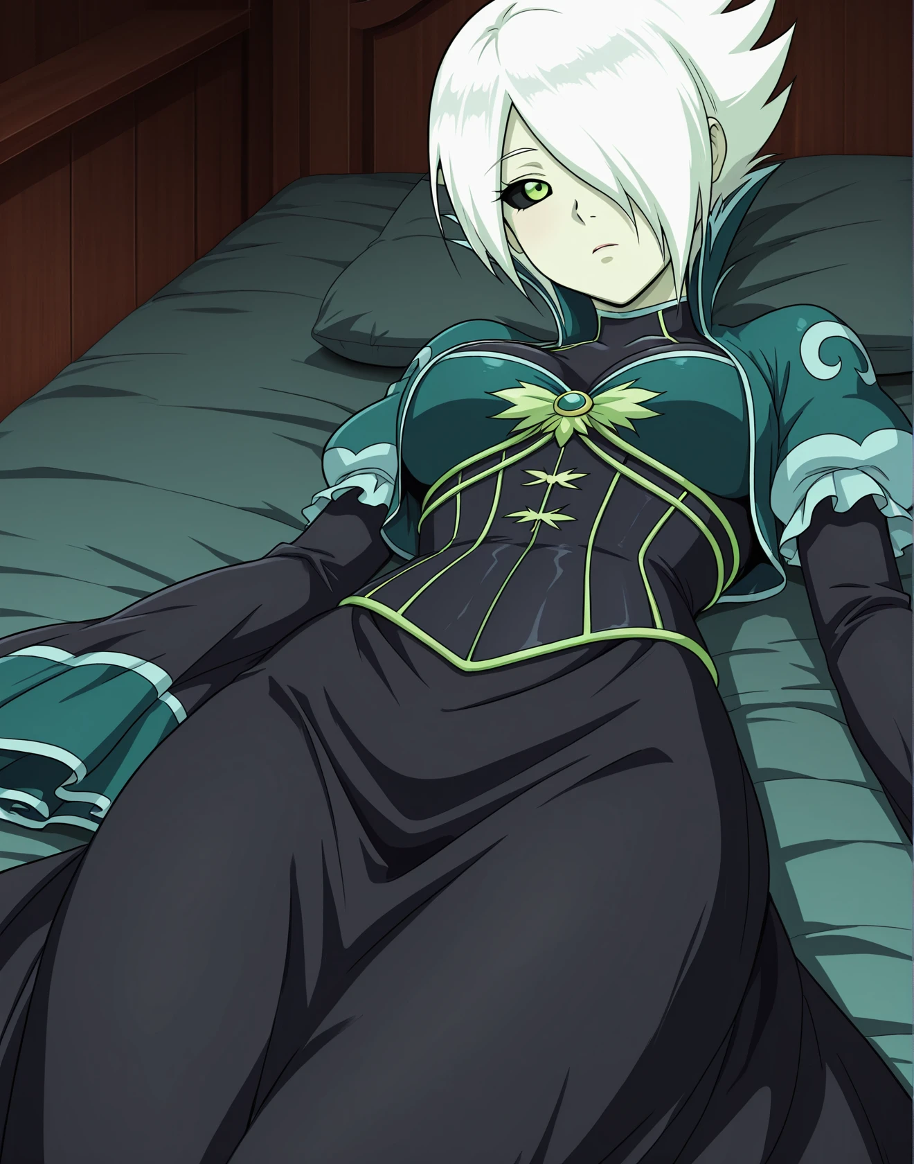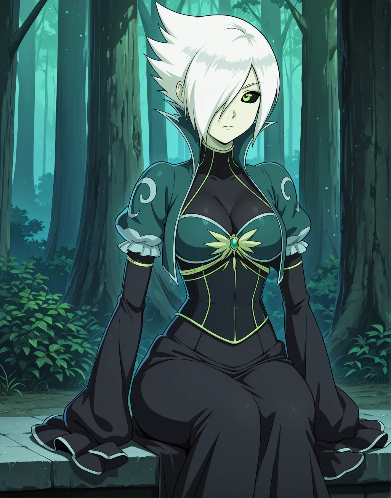 FioCoH, fiona, white hair, green eye, green dress, colored sclera, hair over one eye, black sclera, green eyes, white hair, short hair, colored skin, extremely long sleeves, corset, sleeves past wrists, sleeves past hands,