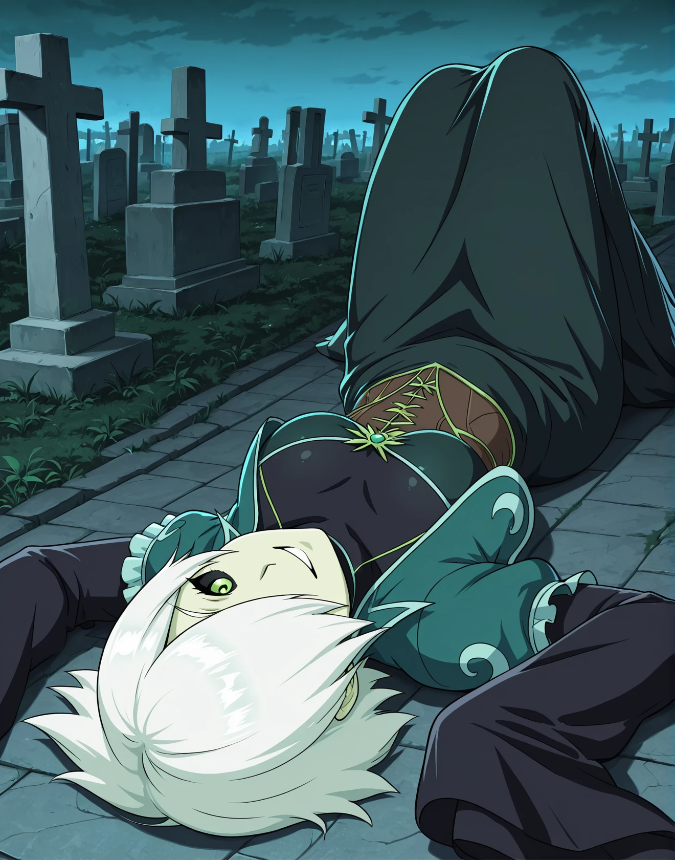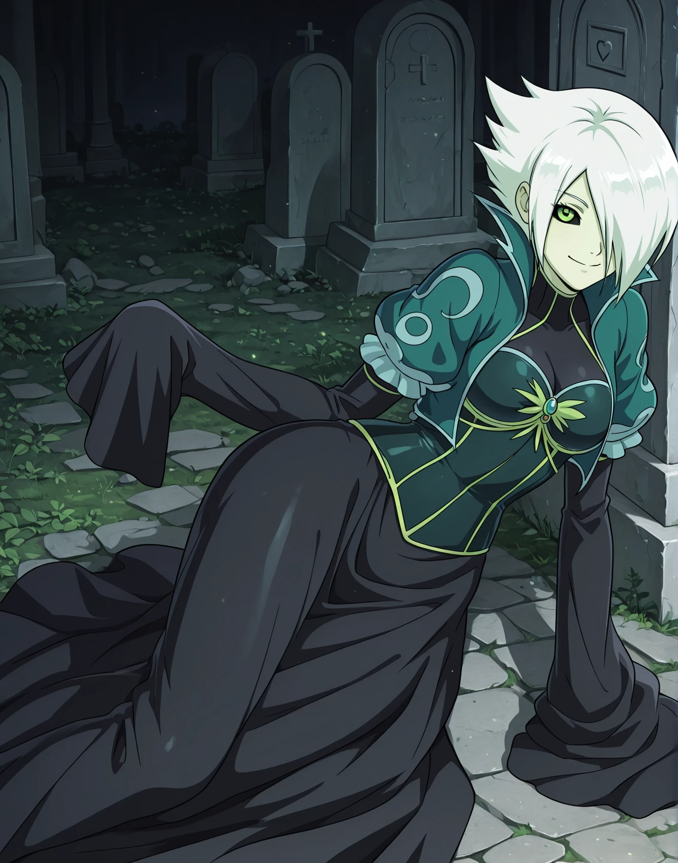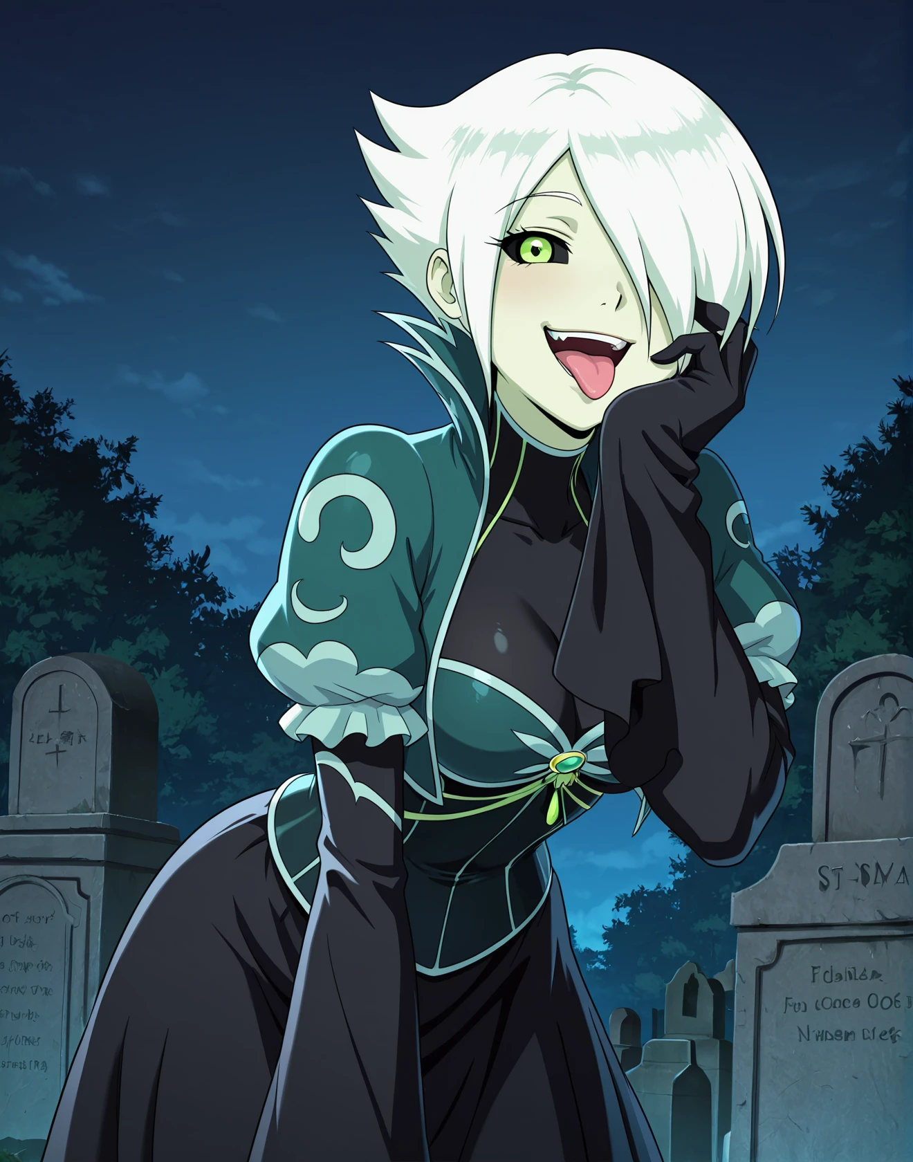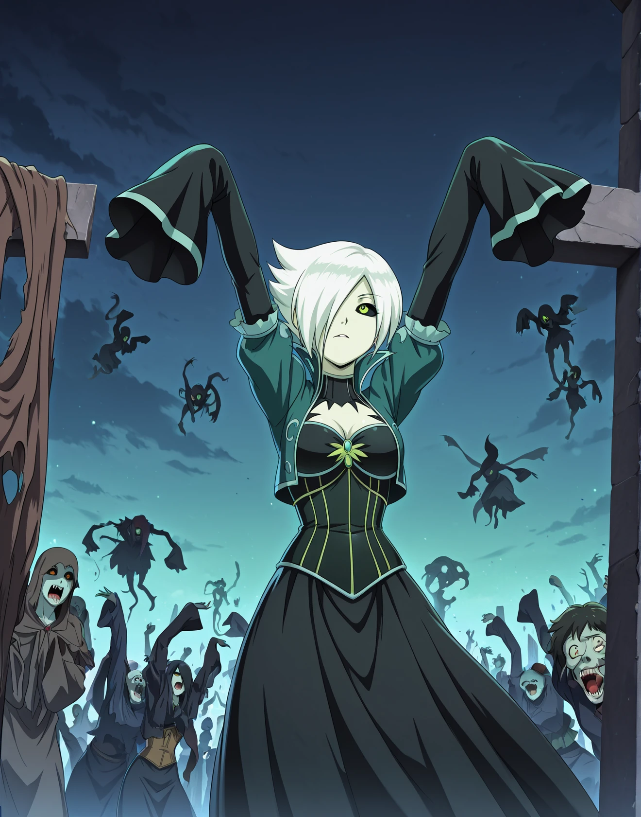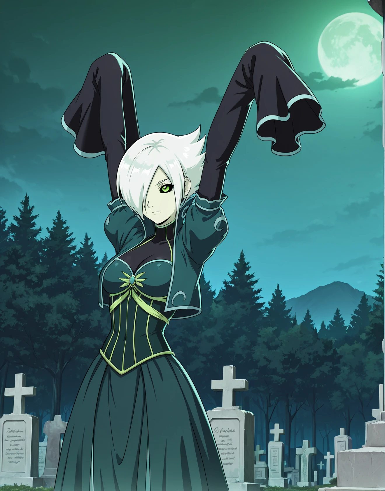 FioCoH, fiona, white hair, green eye, green dress, colored sclera, hair over one eye, black sclera, green eyes, white hair, short hair, colored skin, extremely long sleeves, corset, sleeves past wrists, sleeves past hands,