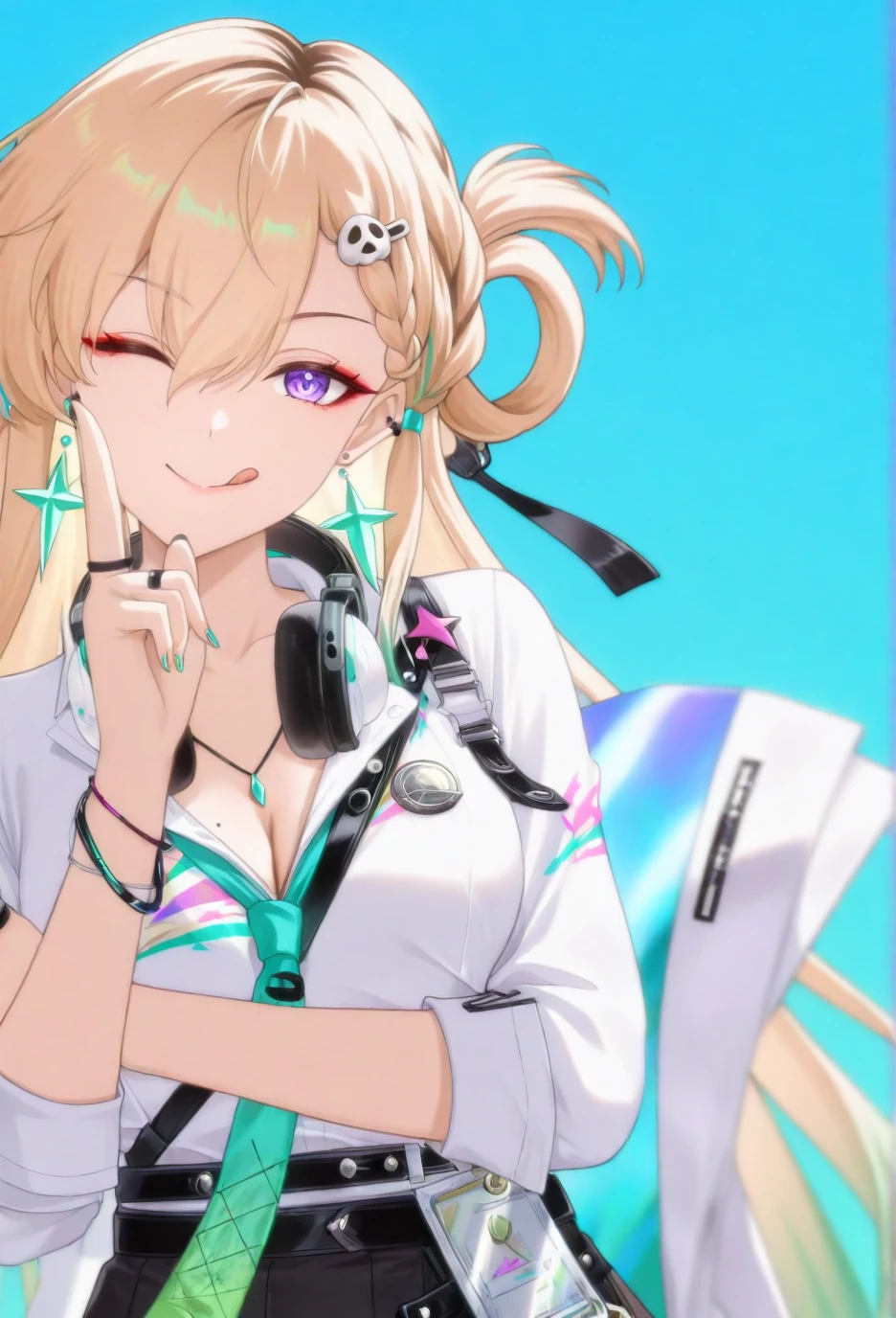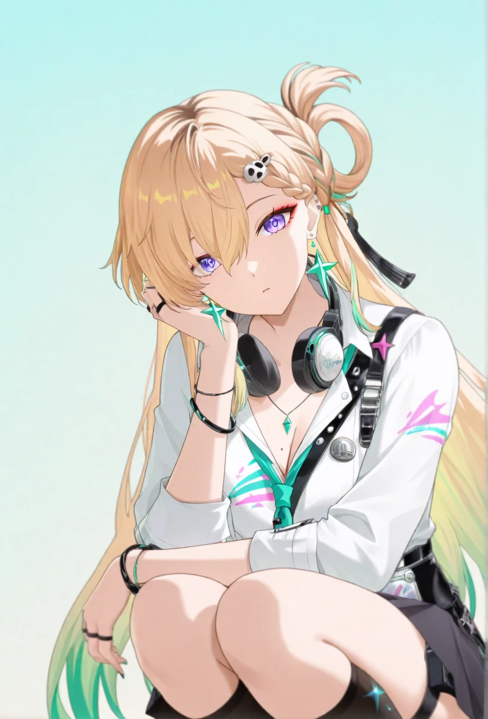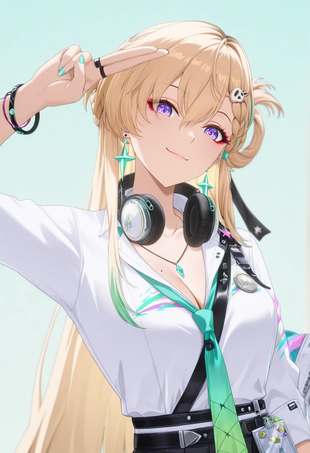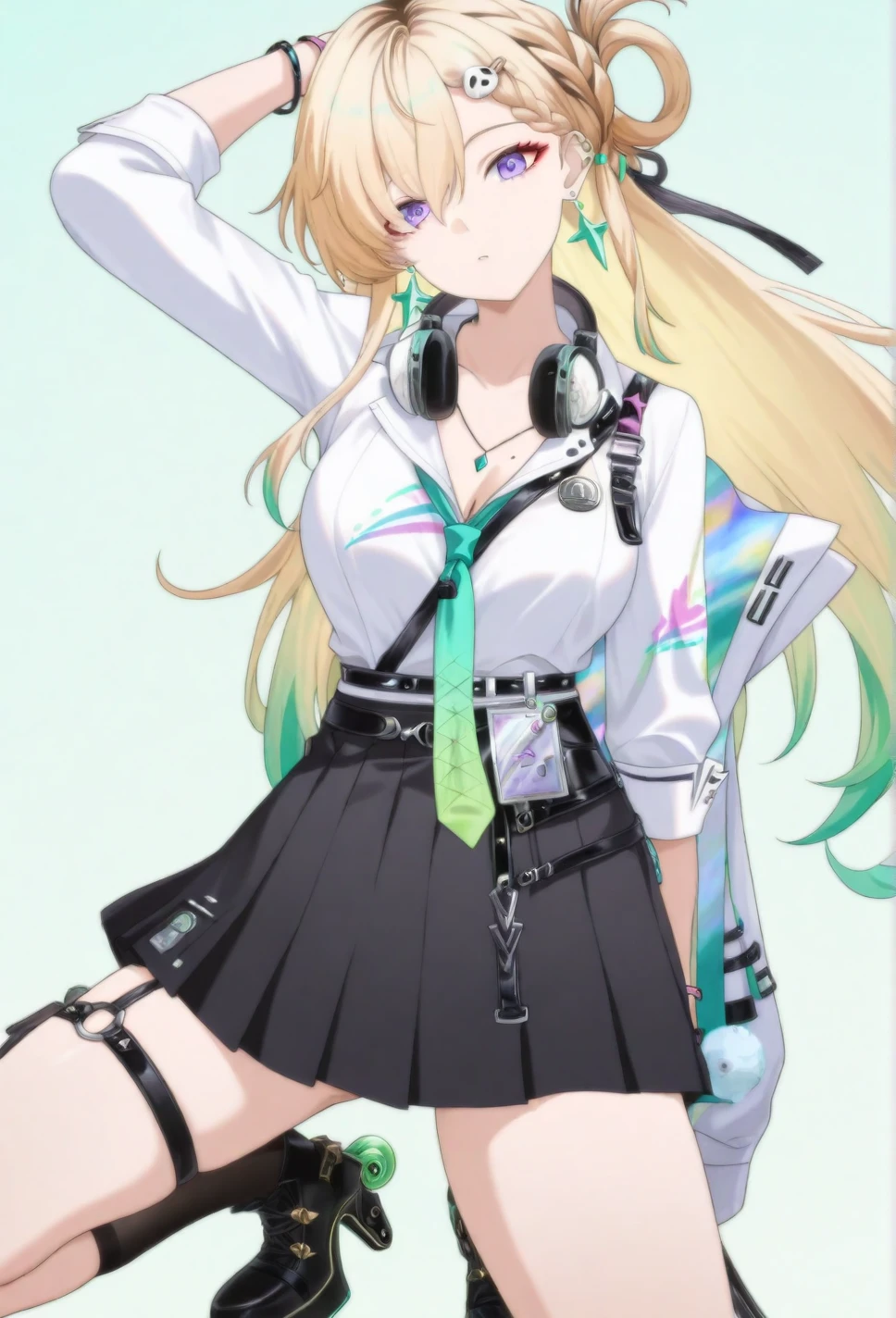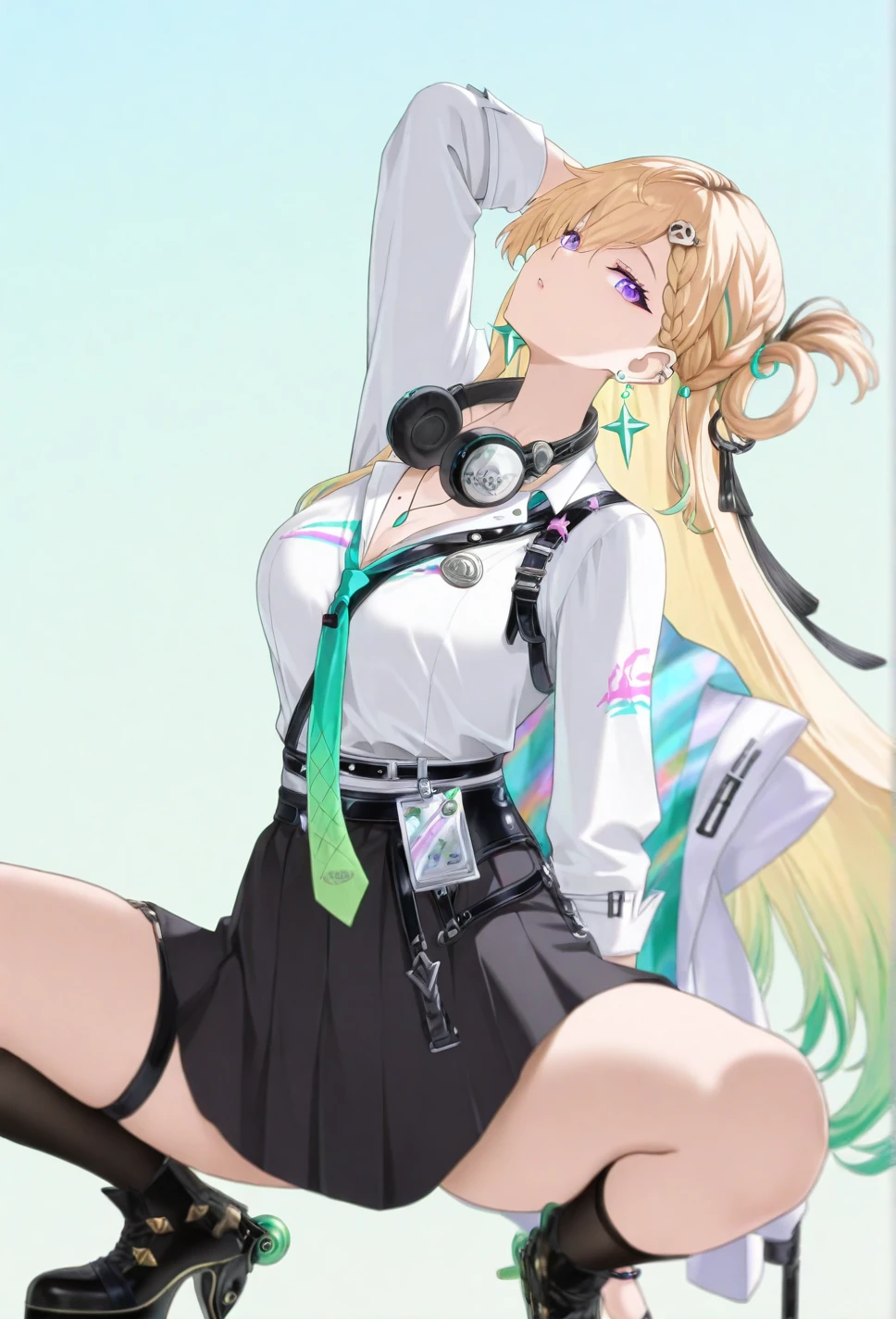 <lora:LynaeV1-Nuclear1811-IL>,Lynae,purple eyes,eyeshadow,red eyeshadow,blonde hair,gradient hair,multicolored hair,green hair,streaked hair,long hair,very long hair,braid,french braid,single hair ring,ribbon,hair ribbon,hair ornament,hairclip,jewelry,earrings,aqua earrings,star earrings,headphones,headphones around neck,pendant,aqua pendant,necktie,aqua necktie,fluorescent green necktie,loose necktie,badge,button badge,gyaru,school uniform,shirt,white shirt,collared shirt,cleavage,mole on breast,long sleeves,sleeves past elbows,sleeves rolled up,shirt tucked in,belt,jacket,white jacket,jacket on shoulders,bracelet,ring,multiple rings,nail polish,skirt,black skirt,miniskirt,pleated skirt,high-waist skirt,single thigh strap,holster,socks,black socks,see-through socks,kneehighs,boots,black footwear,high heels,skates,roller skates,2d style,