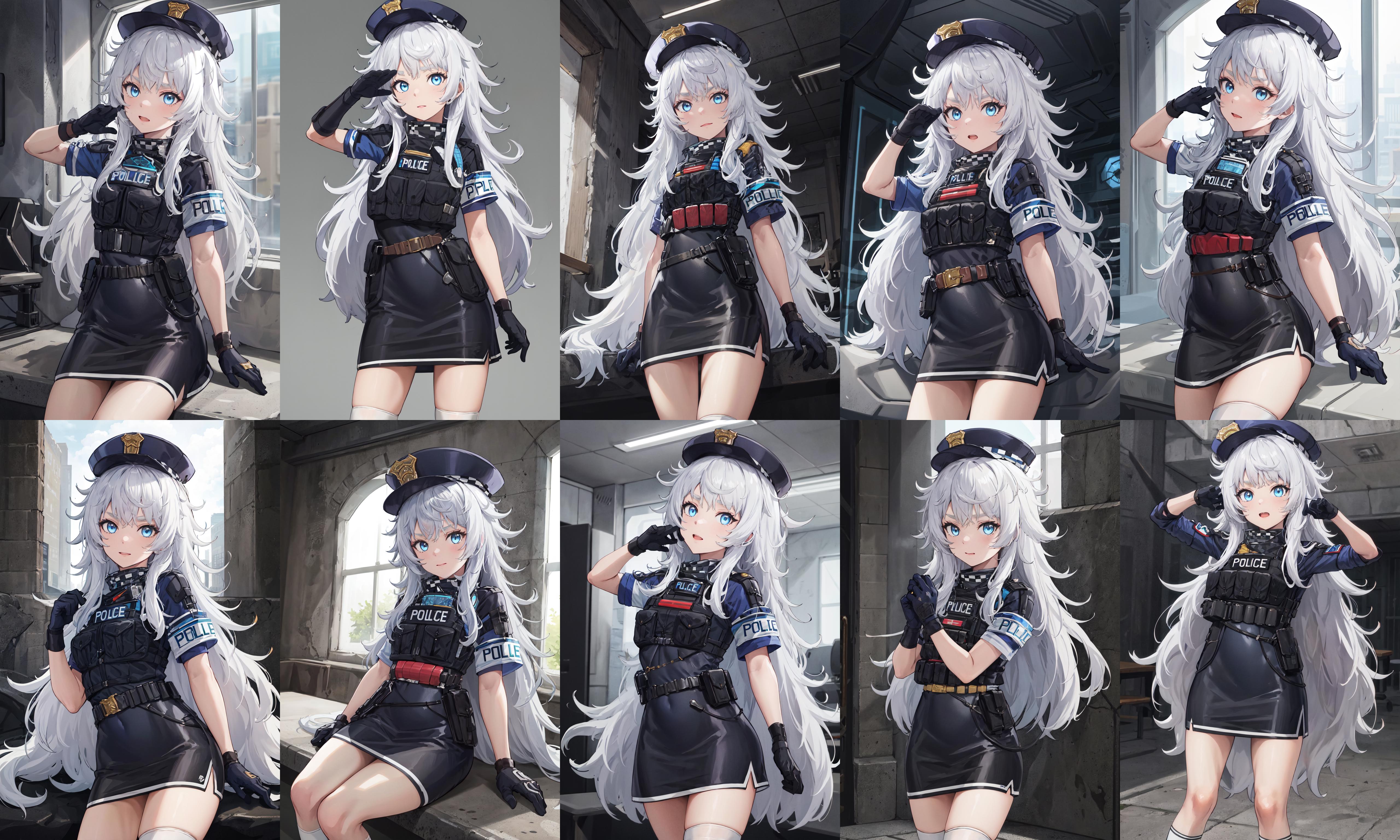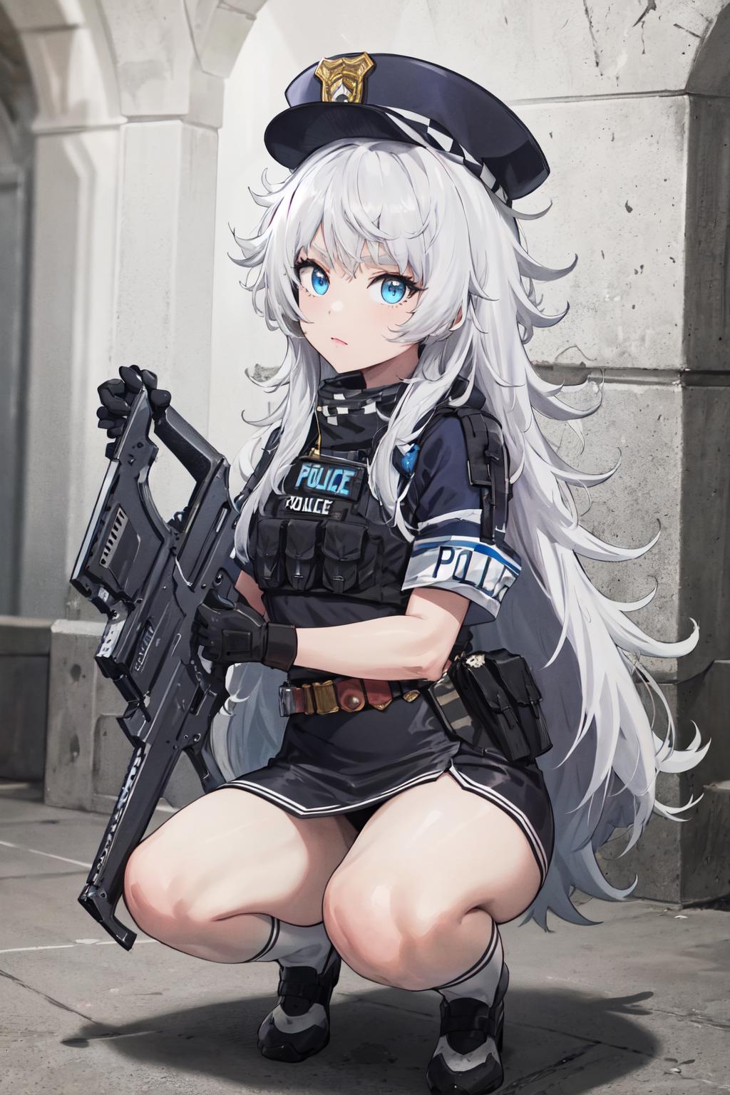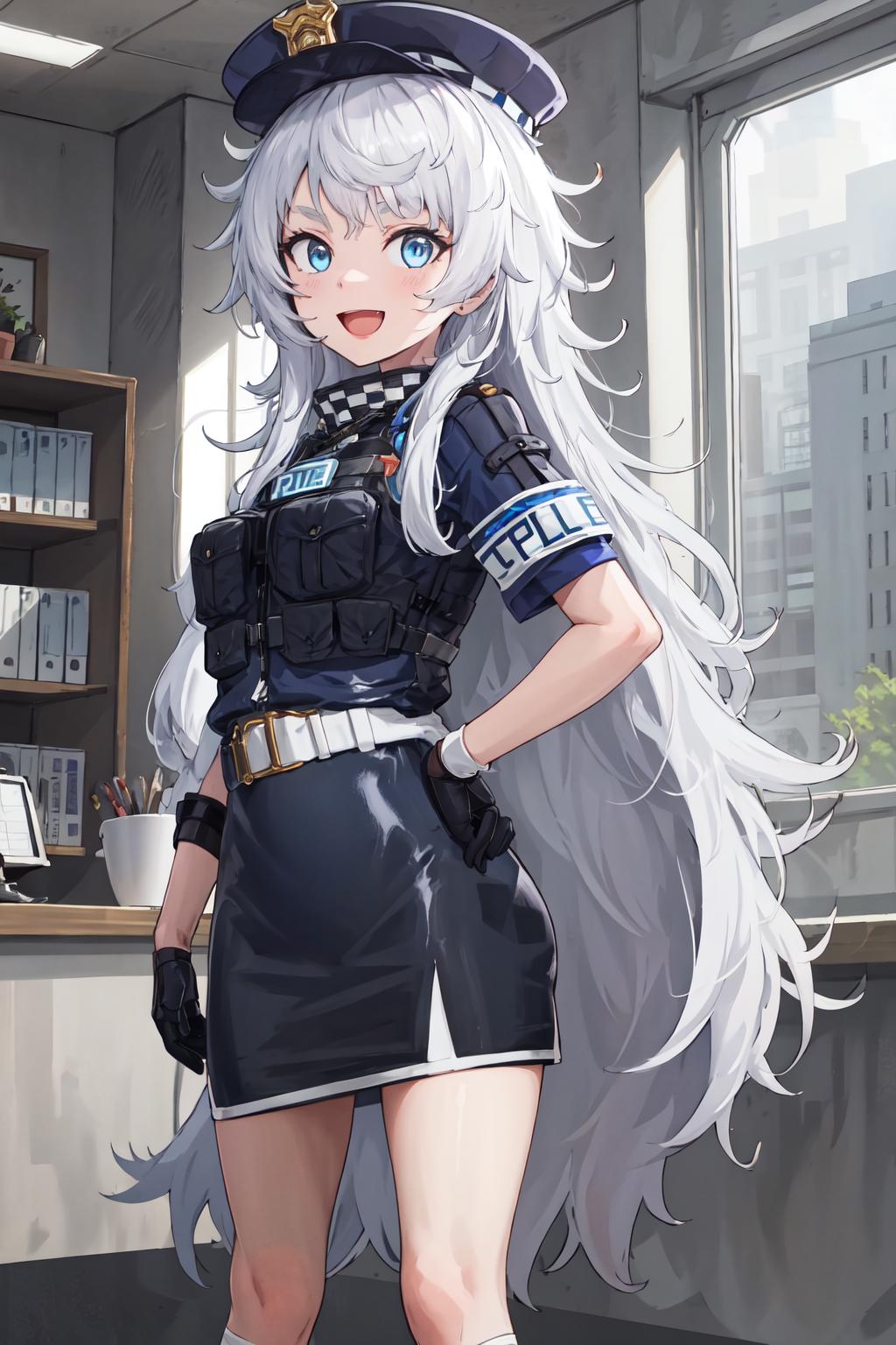 outfit11girl, solo, long hair, blue eyes, white hair, messy hair, hat, black gloves, white socks, police uniform, black skirt, short sleeves