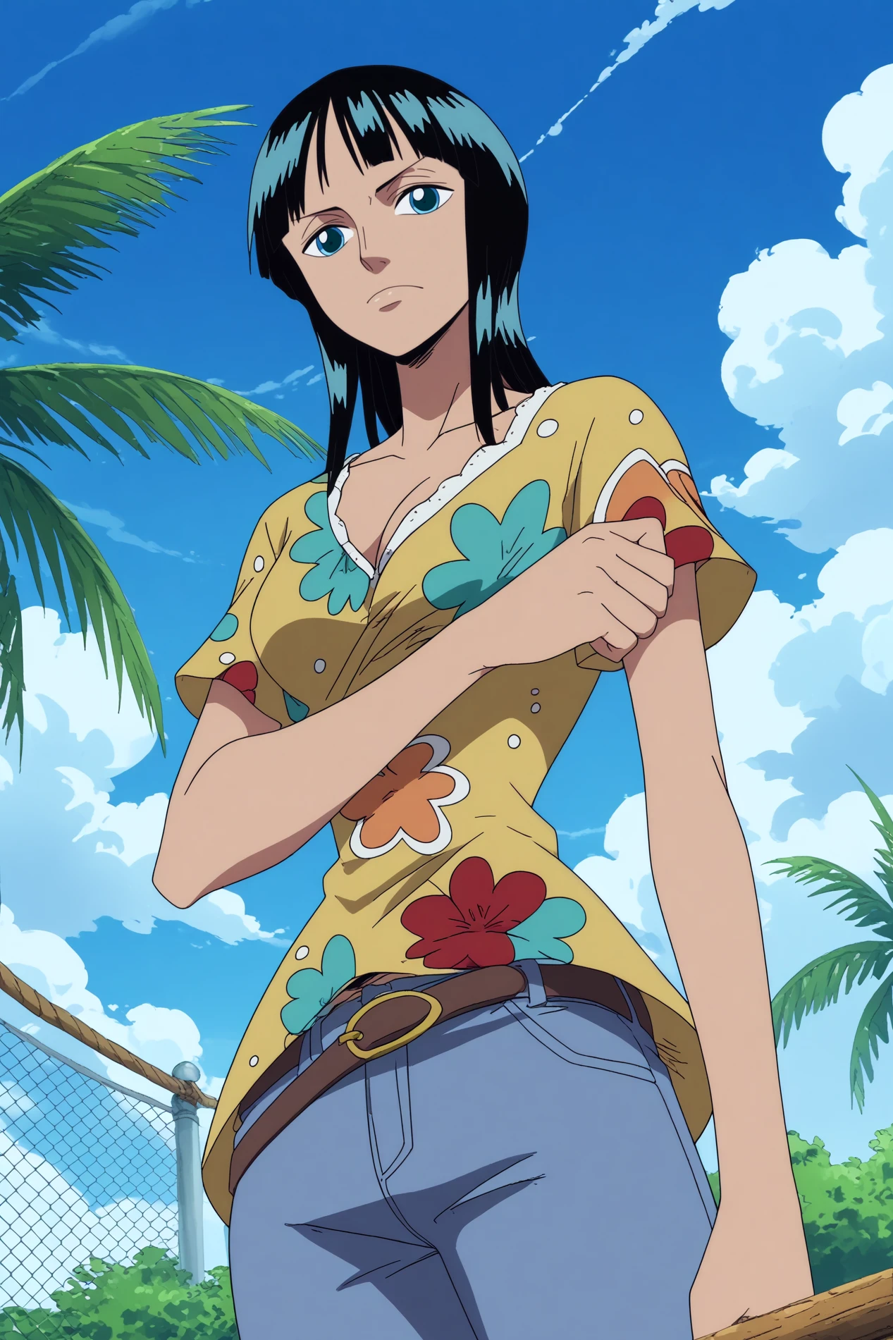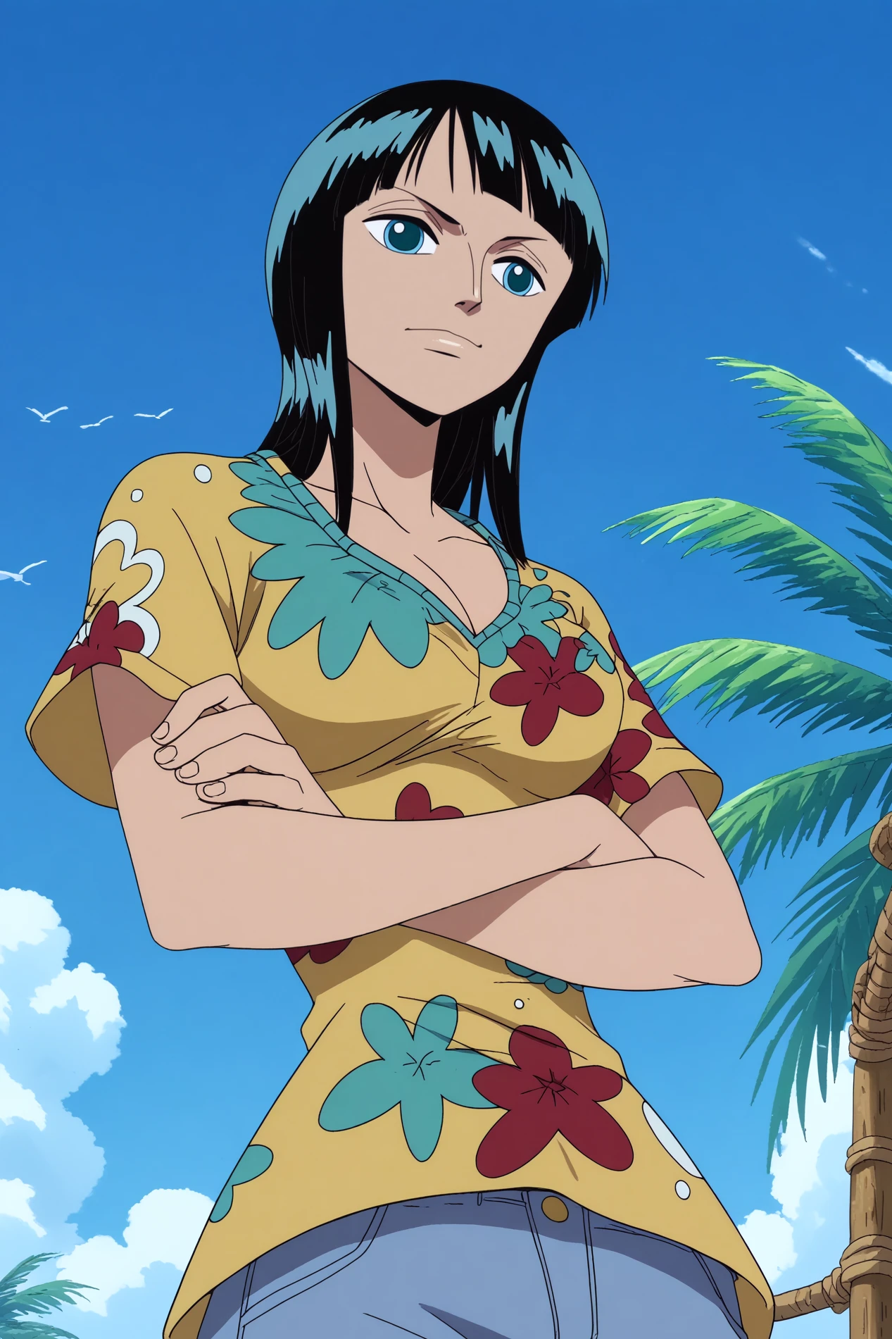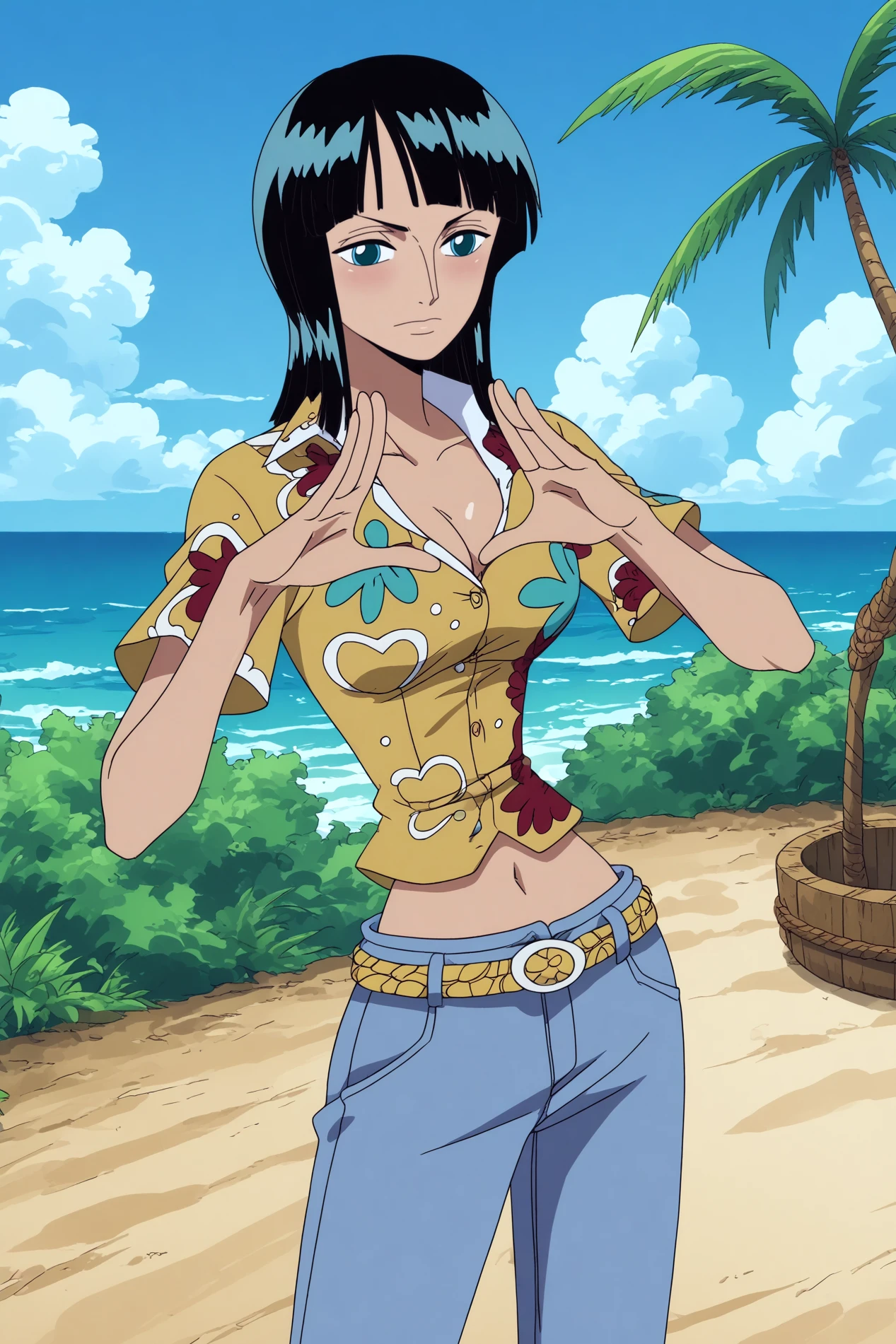 Triggers : nico robin,1girl,solo,mature,long hair,bangs,blunt bangs,short hair,breasts,cleavage, medium_breasts, midriff, collarbone,shirt,jeans,denim