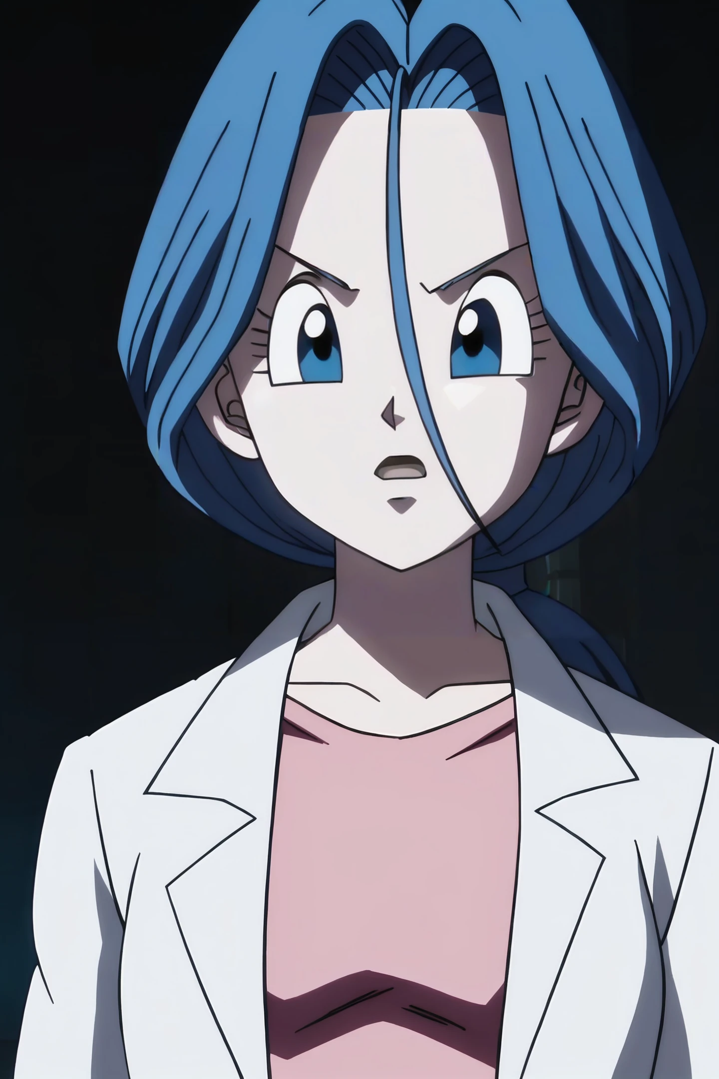 bulma, future, blue hair, ponytail, low ponytail, blue eyes, mouth mark