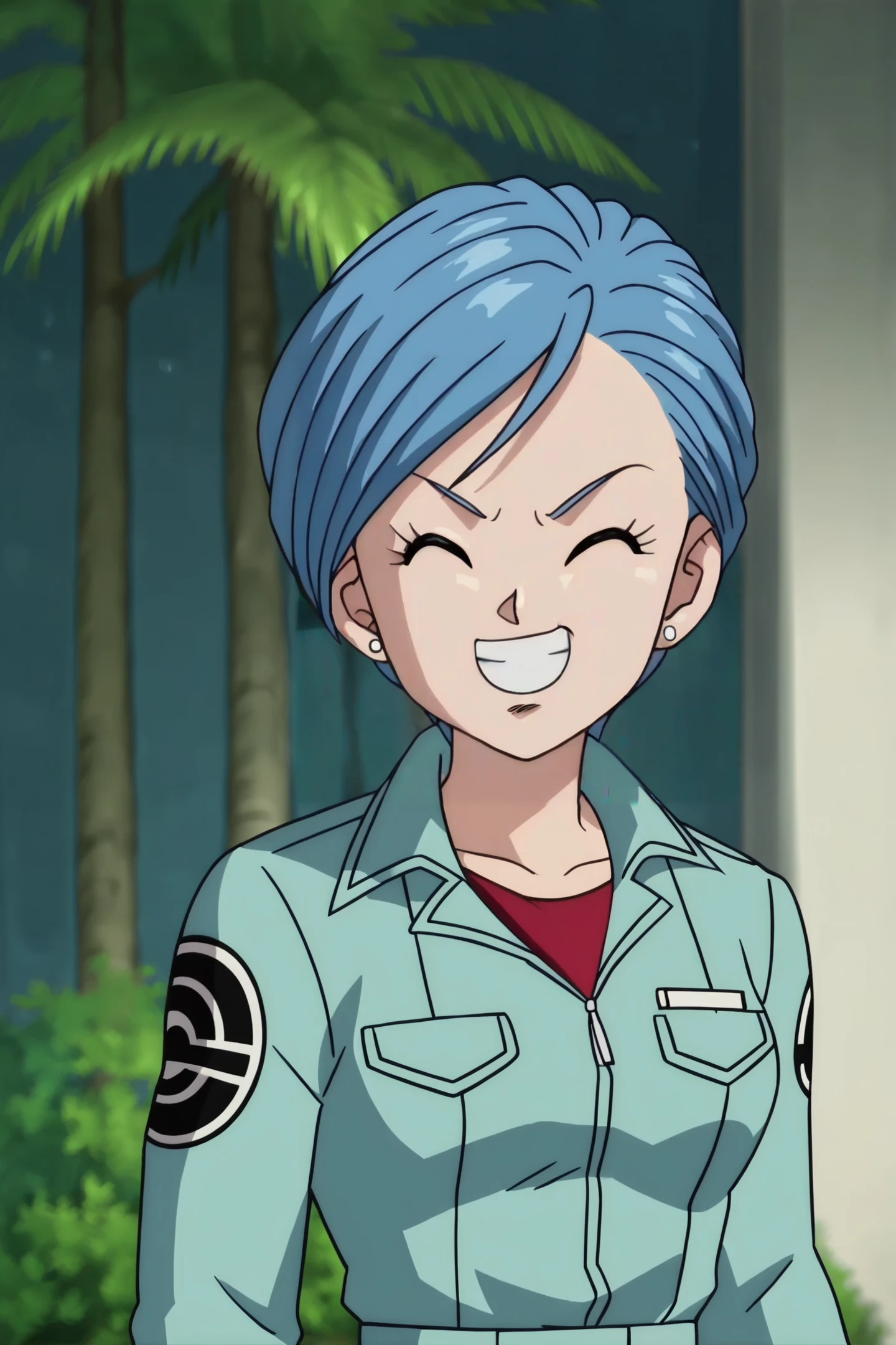 bulma, short hair, bowl cut, blue eyes, blue hair,