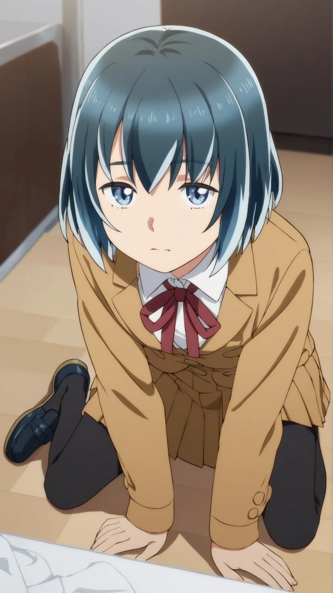 hina_hinamatsuri, an anime girl, 1girl, solo, short hair, blue eyes, skirt, ribbon, school uniform, blue hair, pantyhose, pleated skirt, shoes, black pantyhose, all fours, loafers