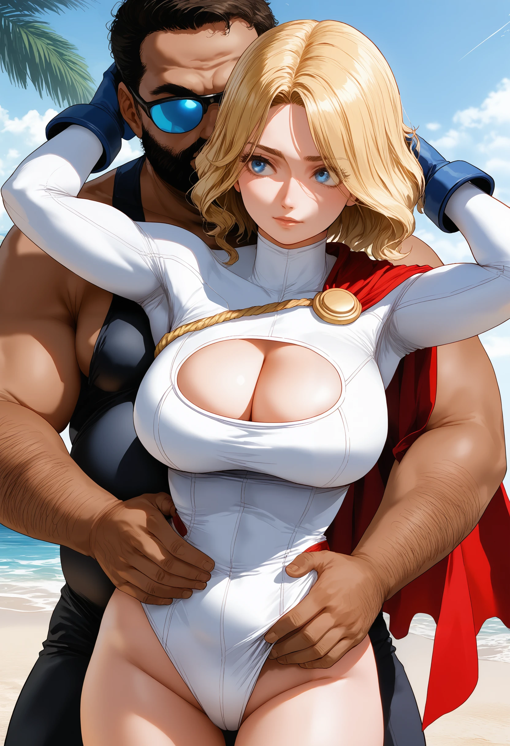 His Waifu: real_toonwife woman, light blue hair, light blue eyebrows, black eyes, wavy hair, medium breasts