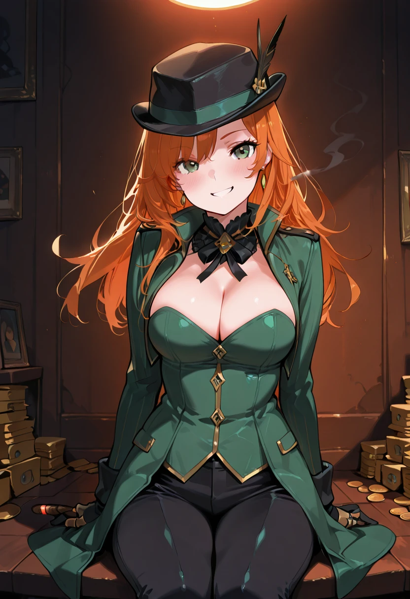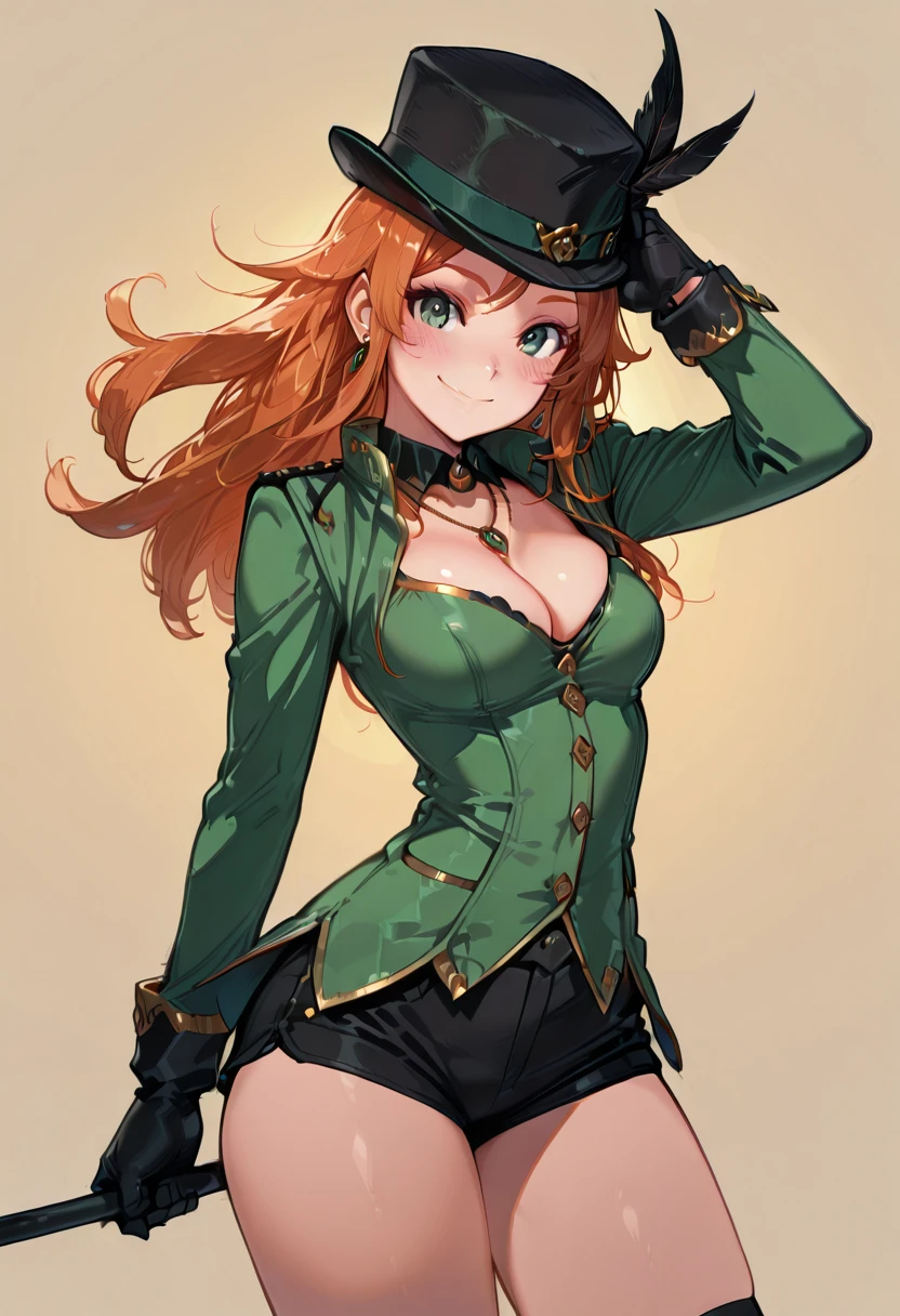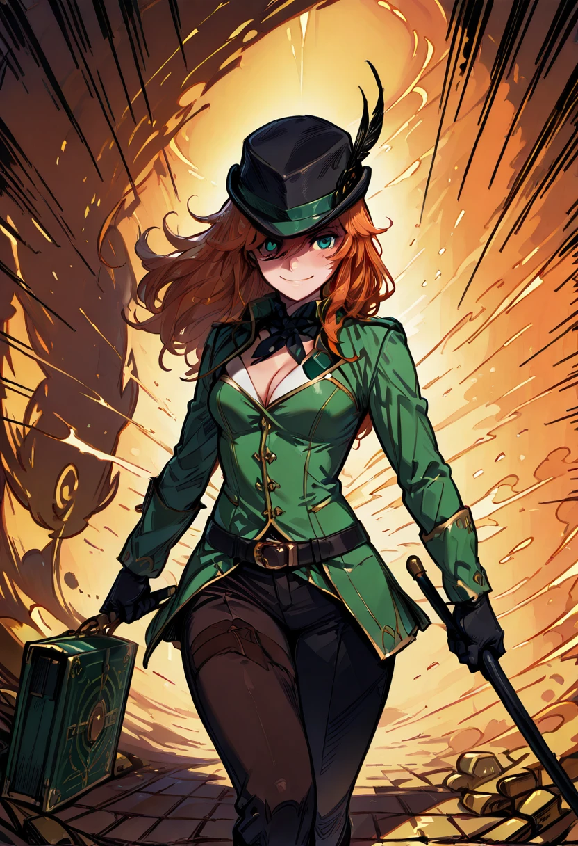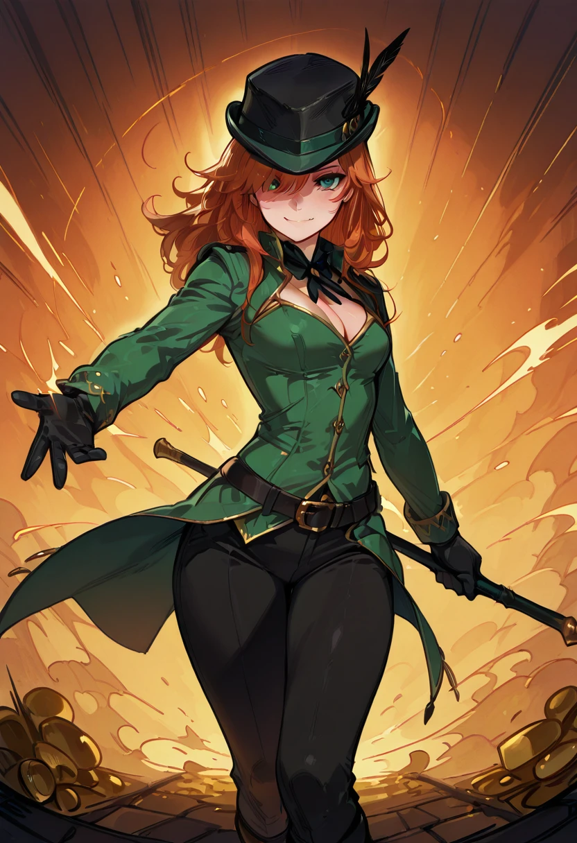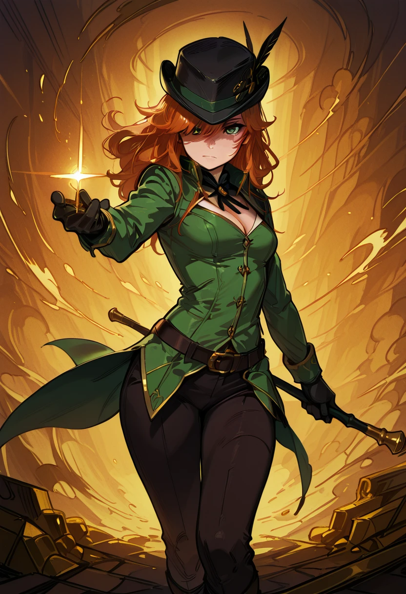 zzLepreconCitron, green eyes, orange hair, long hair, black hat, long sleeves, cleavage, belt, black headwear, black pants, green jacket, hat feather,